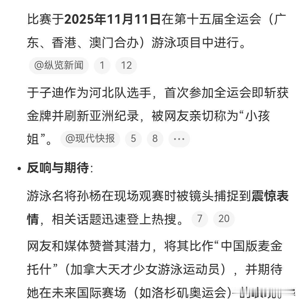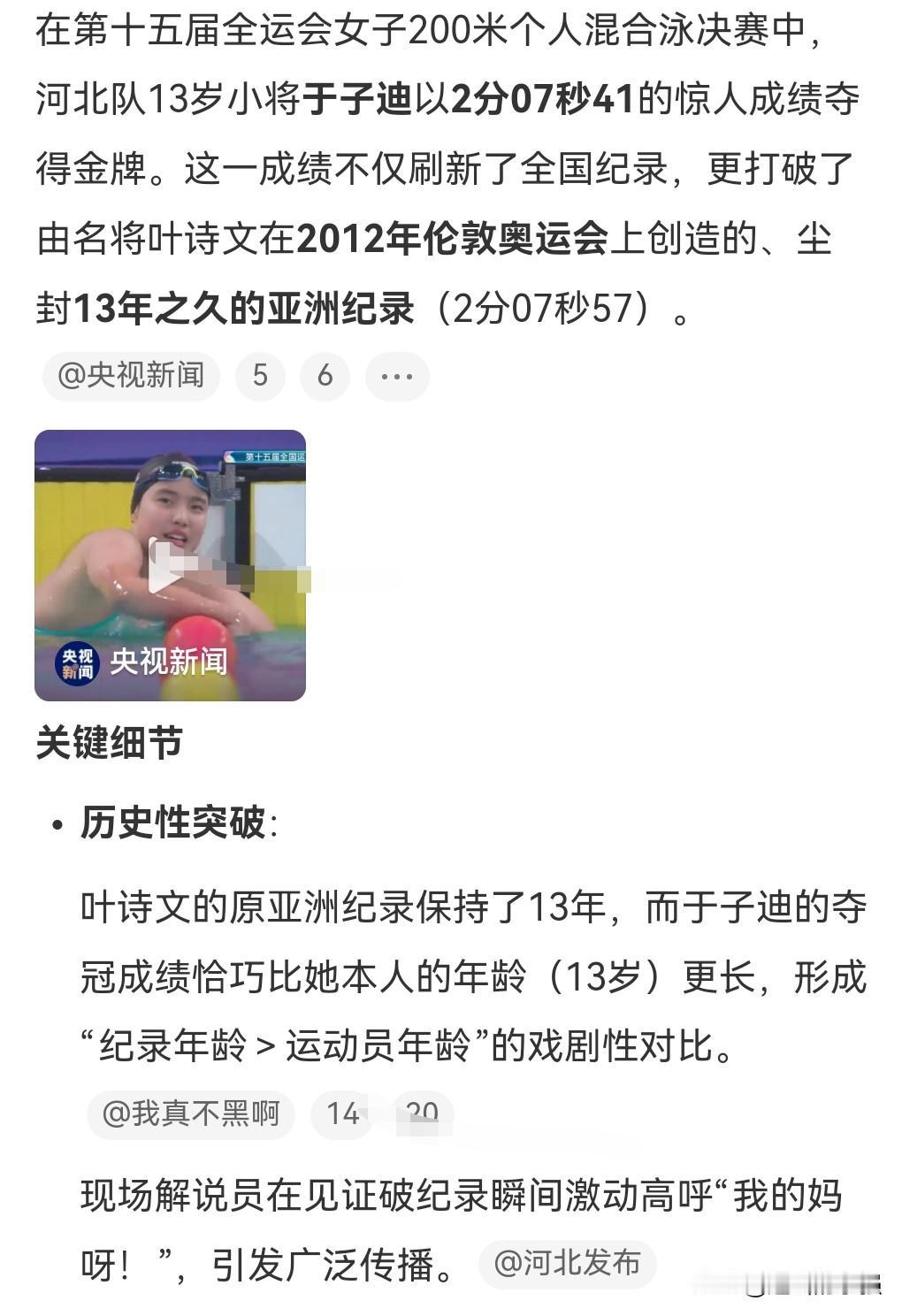 这真的是太厉害,13岁的小将竟然打破沉寂13年的纪录。 这真的是多么的天赋异禀啊,也说明训练非常的刻苦。 11月11日全运会上。 女子200米个人混合泳决赛,13岁的小将于子迪以2分7秒41的成绩摘金。 打破叶诗文在2012年伦敦奥运会上创造的亚洲纪录。 真的是未来可期呀。 希望这是一颗闪闪的明星,为我国的体育事业添砖加瓦。