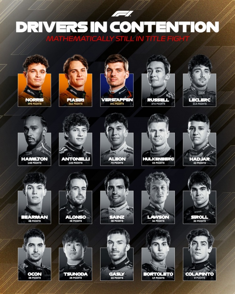 目前仅剩3位车手有机会争夺车手总冠军,分别是:诺里斯(390分)、皮亚斯特里(366分)、维斯塔潘(341分)。