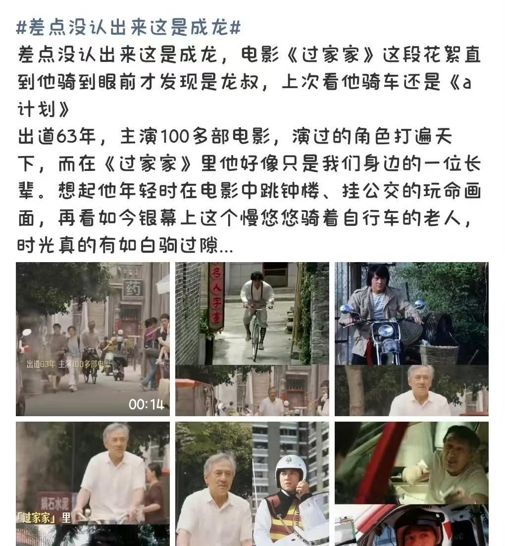 “差点认不出成龙”冲上热搜! 谁看了能不泪目呢?出道63年,主演100多部电影的成龙如今老成了这样!他的新剧《过家家》路透一出惊呆了所有人!那个打遍天下的大侠,被全世界崇拜的中国功夫大侠,如今也变成了温柔的长辈。71岁了依然在不断尝试和挖掘新的角色,让观众能看到更多不一面的成龙,这点的确令人敬佩! 从成龙大哥到龙叔,再到之后的龙爷,岁月的沉淀让成龙的演技更加纯粹。如今每个角色都像是他年轻时的缩影,这骑单车的镜头是几代人的青春回忆,也是我们想念《A计划》的瞬间。观众能透过银幕感受到,时光的力量全呈现在了成龙的脸上。