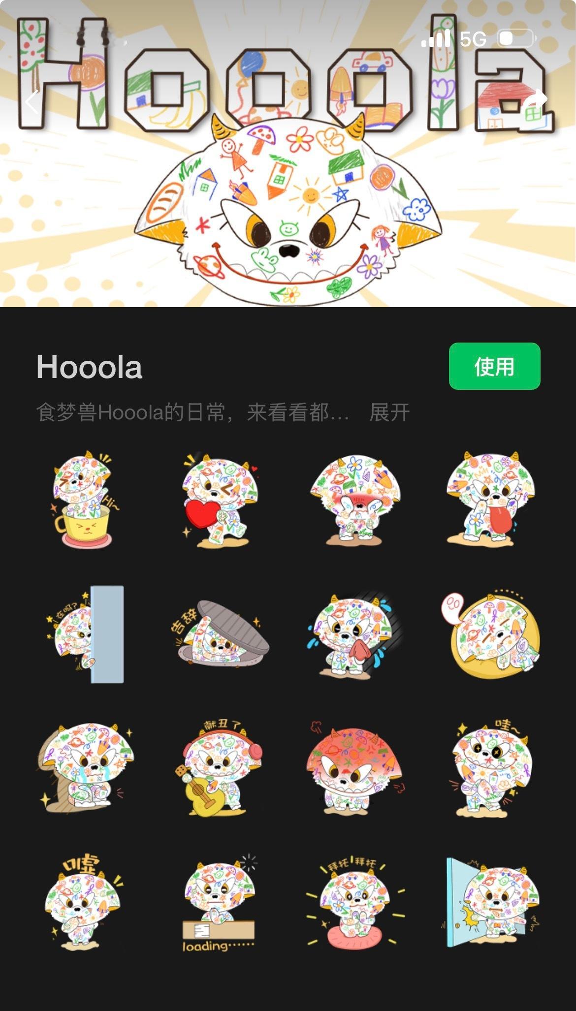 看我们做的Hooola表情包,表情里直接搜“Hooola”就可以用啦,是个食梦兽。哦,当然是咱拥有版权的