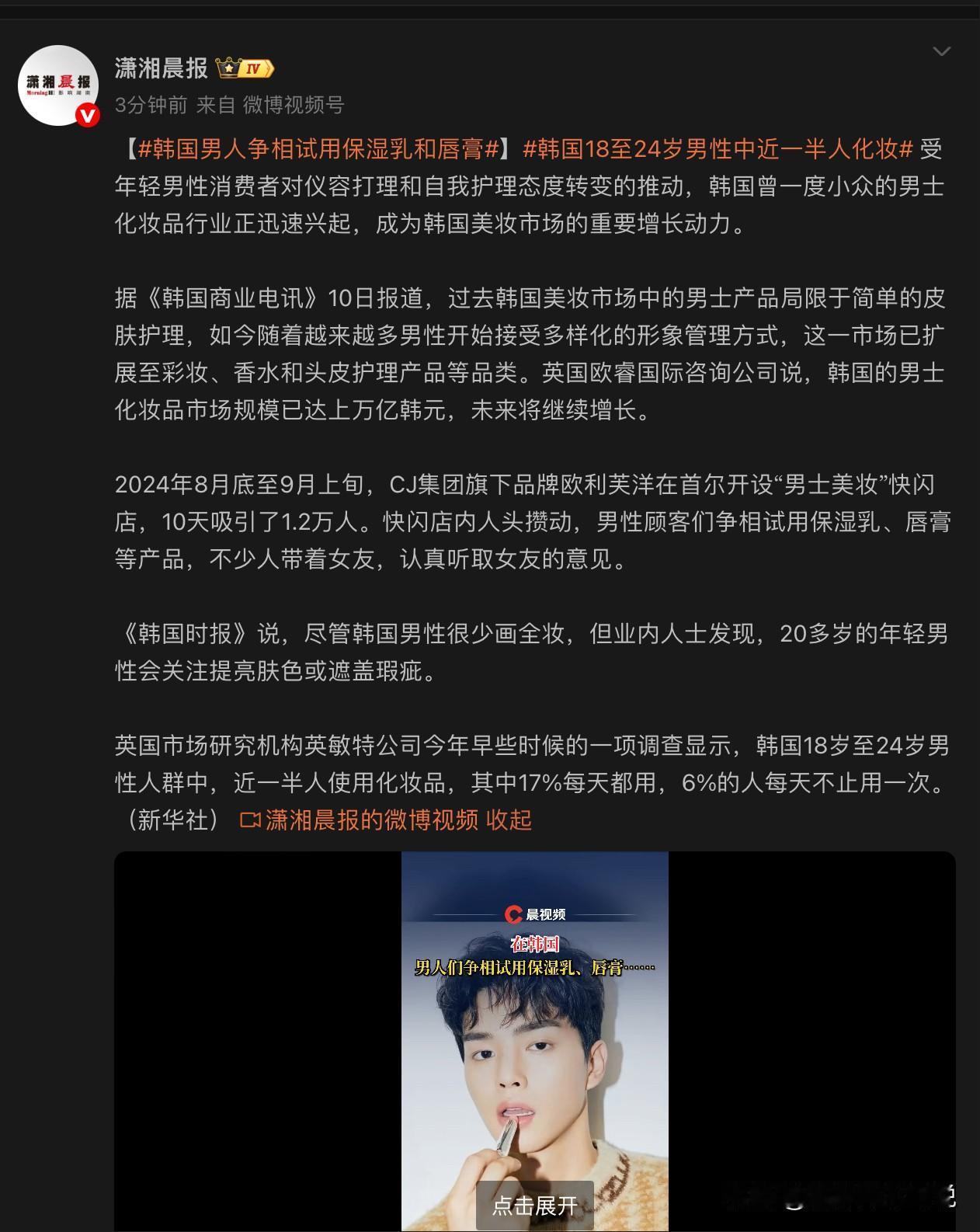 韩国伪娘文化越来越泛滥了,居然18-24岁的年轻男性有差不多近一半儿玩儿起了化妆把戏!这是什么概念?想象一下,当你走在大街上随便一看,差不多一半儿男性都是带妆上街的,一个个眉目如画,那是什么样的感受?更恐怖的是这一比例将会继续增长,还好现在韩流在我国已经不再像当初那般流行了,否则这股妖风搞不好会剧烈的影响到我们这一代的年轻男性。男性在日常生活中化妆,想想都头皮发麻!