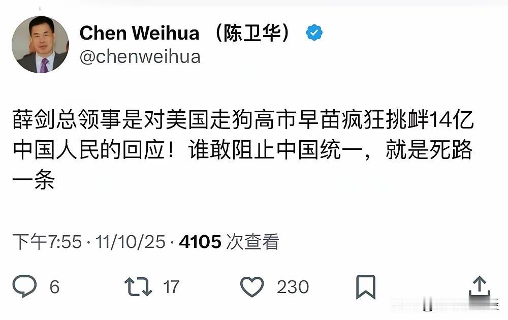 “斩首”说继续引爆,这回合出手的是中国日报欧盟分社社长陈卫华,“薛剑总领事是对美国走狗高市早苗疯狂挑衅14亿中国人民的回应!谁敢阻止中国统一,就是死路一条”。 ​薛剑总领事身在日本,批评起来相对含蓄,没有指名道姓,陈社长在欧洲火力全开,用日本听得懂的语言强势声援薛剑,回击日本无理挑衅。 ​台湾是中国领土不可分割的一部分,以什么方式收回台湾,纯属中国内部事务,轮不到日本指手画脚,更遑论所谓军事干预,只能是死路一条。 高市早苗此前在国会公然叫嚣“台湾有事即日本存亡危机事态”,明目张胆将台湾纳入日本“安保范围”,挑衅意味十足。 这番言论并非一时兴起,而是日本右翼势力长期对华强硬、妄图干涉台海事务的集中爆发,背后离不开美国的默许与纵容。 薛剑总领事以“斩脖子”为喻的回应,是对日本挑衅的正当反击,字字句句都承载着中国人民捍卫主权的坚定意志。 陈卫华社长在欧洲的强势发声,打破了地理距离的限制,让世界听清中国在核心利益上绝不退让的明确态度。 日本作为二战战败国,本应恪守和平宪法,却屡屡在台湾问题上越界,其行径违背历史正义,也伤害亚洲邻国感情。 数据显示,中日双边贸易额2023年达3500多亿美元,经贸合作紧密却不妨碍日本右翼炒作对立,暴露其政治短视。 “美国走狗”的定性一针见血,近年美日同盟持续强化,日本甘愿充当美国“印太战略”棋子,不惜牺牲对华关系。 台湾问题从不是国际议题,1971年联大第2758号决议早已明确世界上只有一个中国,这是国际社会普遍共识。 陈卫华的表态并非激化矛盾,而是对挑衅者的严正警示,任何分裂势力都该明白,中国统一进程不可阻挡。 日本曾对台湾实施50年殖民统治,如今却摆出“保护者”姿态,这种历史健忘症背后是军国主义死灰复燃的危险。 薛剑总领事身处日本客场,发言兼顾外交分寸与原则底线,陈卫华在欧洲主场则直击要害,两人配合尽显中国智慧。 国际社会不乏理性声音,多数国家明确反对外部势力干涉台海事务,深知维护地区和平稳定的重要性。 高市早苗的挑衅言论在日本国内也引发争议,不少民众担忧其冒进言行会将日本拖入地缘冲突的泥潭。 中国始终坚持和平统一大政方针,但“和平”不是妥协的借口,面对分裂行径与外部干涉,必须亮出强硬底牌。 陈卫华社长的“死路一条”绝非危言耸听,中国的国防力量早已今非昔比,有足够能力粉碎任何分裂图谋。 日本右翼势力误判了形势,以为有美国撑腰就能为所欲为,却忘了中国人民捍卫国家主权的决心不可撼动。 两岸同根同源,2023年两岸人员往来超120万人次,贸易额突破3000亿美元,民心所向与经济纽带都指向统一。 高市早苗之流的挑衅,只会让中国人民更加团结,让两岸同胞更加看清分裂势力的真实面目与险恶用心。 中国的外交回应向来有理有据有节,薛剑与陈卫华的发声,既是对挑衅的反击,也是对和平的守护。 日本若执意在台湾问题上一条道走到黑,必将损害中日关系大局,付出的经济与政治代价终将难以承受。 维护国家领土完整是每个中国公民的责任,外交官在前线发声,背后是14亿中国人民的坚定支持与强大后盾。 所谓“军事干预”不过是纸上谈兵,中国人民解放军的实力足以震慑一切来犯之敌,守护国家主权与领土完整。 历史潮流浩浩荡荡,顺之者昌逆之者亡,任何企图阻挡中国统一的势力,都将被永远钉在历史的耻辱柱上。 麻烦看官老爷们右上角点击一下“关注”,既方便您进行讨论和分享,又能给您带来不一样的参与感,感谢您的支持! 各位读者你们怎么看?欢迎在评论区讨论。