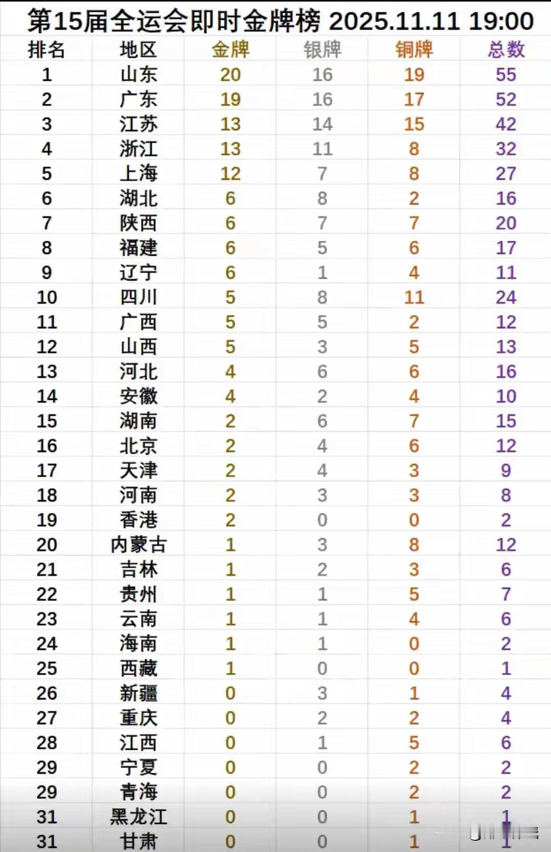 北京时间11月11日,全运会第二个比赛日开打,今天产生32枚金牌,已经被多个代表队拿走,目前最新的金牌榜有了很大的变化,截止19点,山东已经拿到3金,以20金力压广东排名第一,苏大强哑火暂时没有拿到金牌,浙江第四,湖北升第六。山东仍是双料第一非常强势!