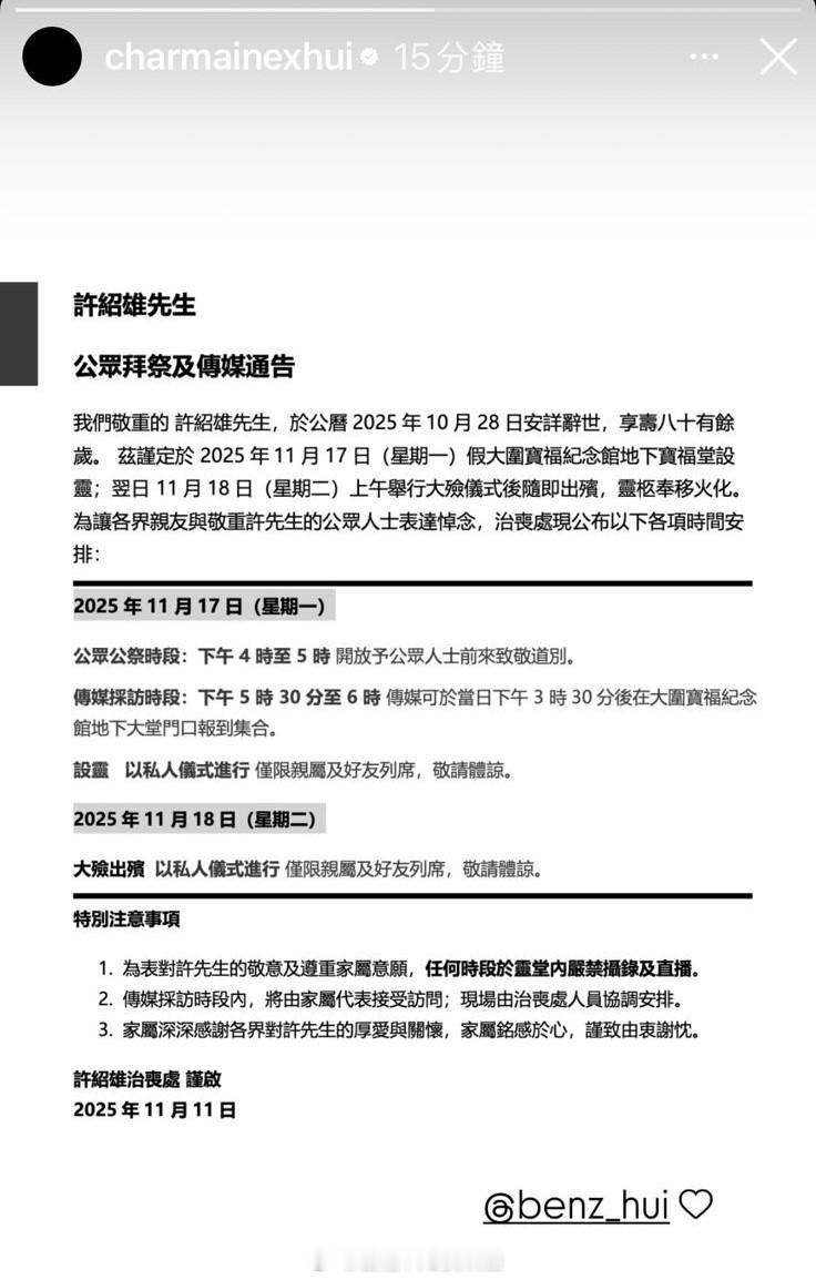许绍雄离世丨家属公布丧礼细节 11月17日安排一小时公祭时段 各界人士可亲身悼念Benz雄 | 星岛头条资深演员“Benz雄”许绍雄于10月28日安详辞世,终年76岁,消息震惊娱乐圈。其家属今日(11日)透过IG发布公众拜祭及传媒通告,详述丧礼安排。家属公布,将于11月17日(星期一)假大围宝福纪念馆地下宝福堂为许绍雄先生设灵。翌日(11月18日,星期二)上午将举行大殓仪式,仪式后随即出殡,灵柩奉移火化。设灵及大殓出殡均以私人仪式进行,仅限亲属及好友列席。设公众告别时刻许绍雄家属公布,为了让各界亲友及敬重许绍雄的公众人士表达悼念,治丧处特别于11月17日下午 4 时至 5 时在大围宝福纪念馆安排了公众公祭时段,届时将开放予公众人士前来致意,送别许绍雄。许绍雄家属安排传媒采访时段家属亦安排了传媒采访时段,但为表对许绍雄的敬意及尊重家属意愿,任何时段于灵堂内均严禁摄录及直播。家属表示深深感谢各界对许绍雄的厚爱与关怀,会铭感于心。