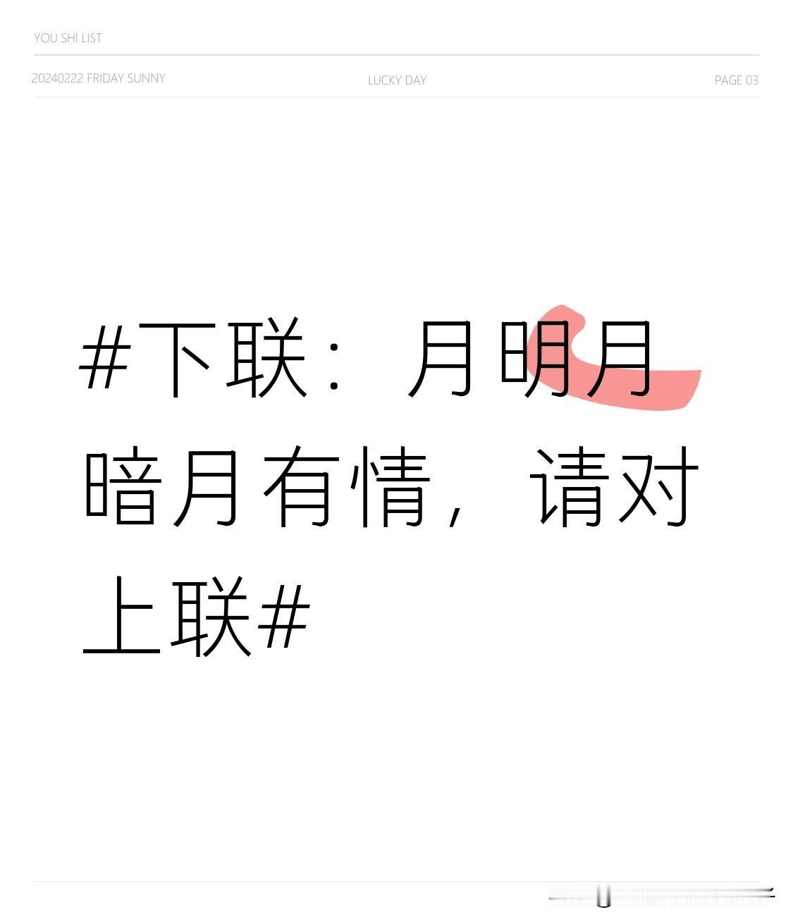 看到“月明月暗月有情”这个下联,我脑海里立马想到了“花开花落花无悔”来对。 对联讲究对仗工整,“花开花落”对应“月明月暗”,都是自然现象的动态变化,“花”对“月”,名词相对;“开落”对“明暗”,动词和形容词对仗也很合适。“花无悔”对“月有情”,一个表达花的无怨无悔,一个体现月的脉脉含情,意境上相互呼应。就像古人对对子,天对地,雨对风,咱这“花”对“月”也挺妙,感觉还挺搭调。