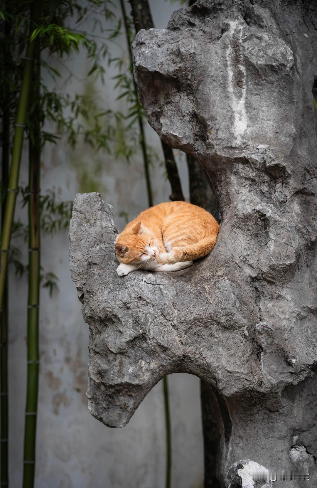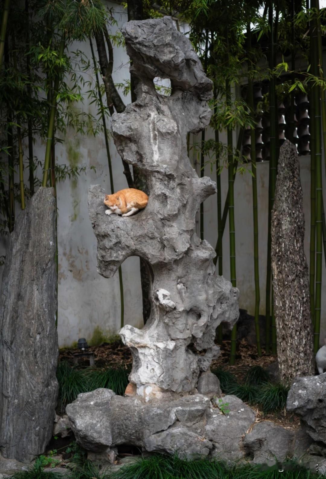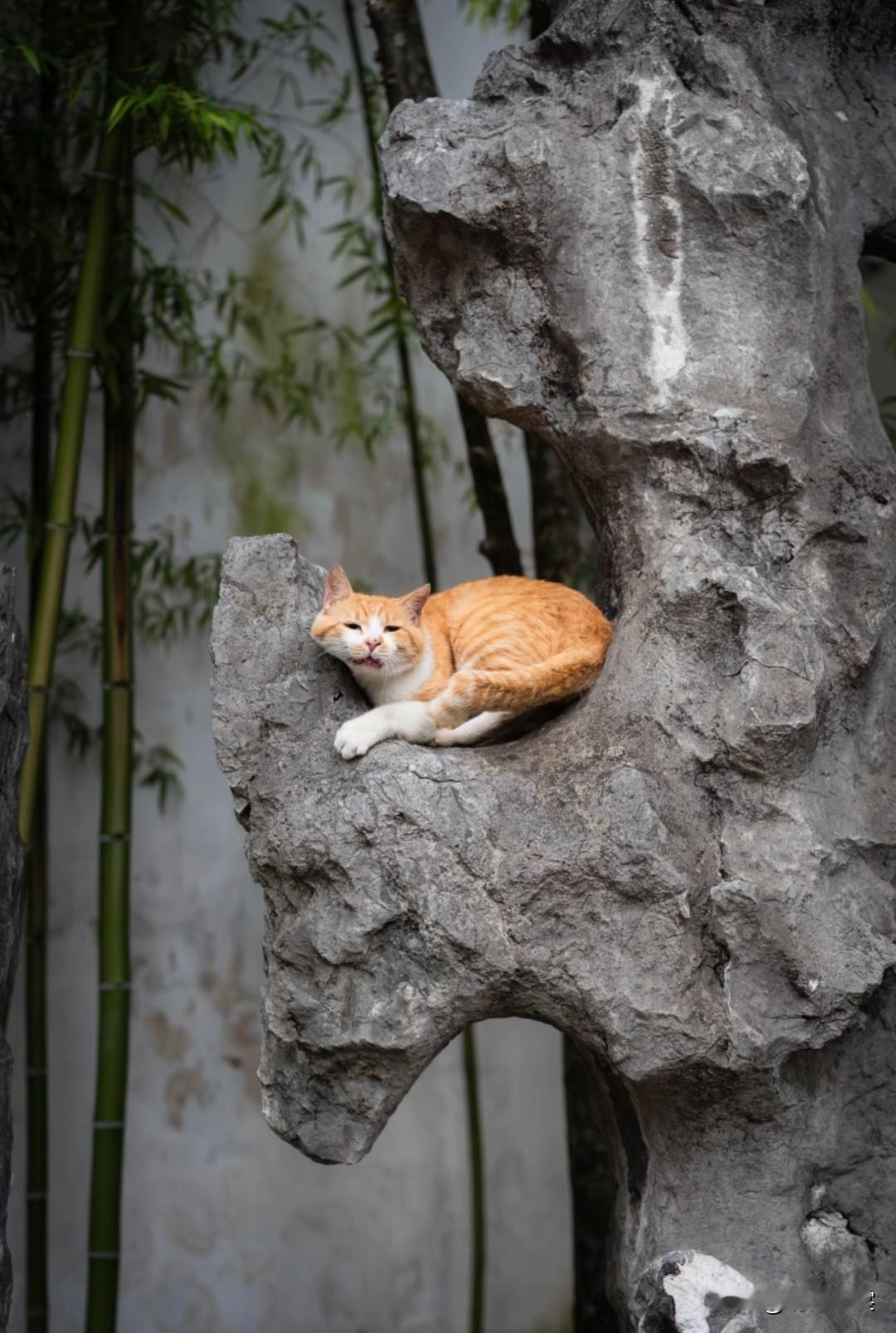 苏州怡园里的那只桔猫,倚石而眠好惬意,想想有时候人生真的不如猫生。花园里的佛系猫 唯美风景图片分享