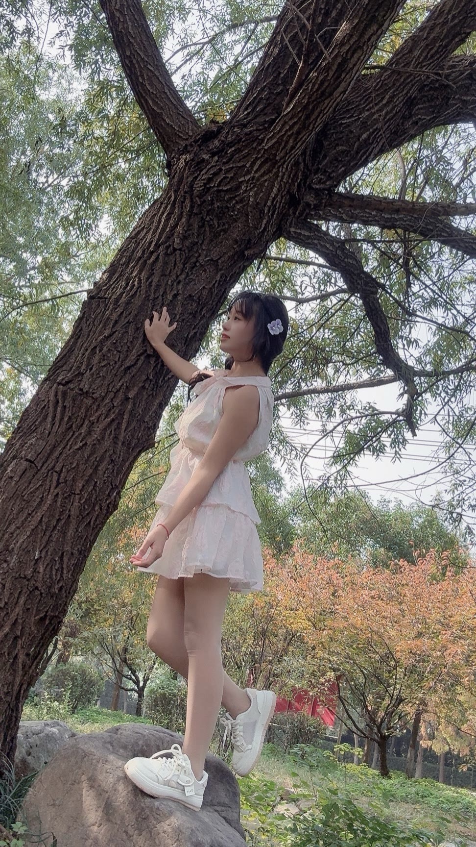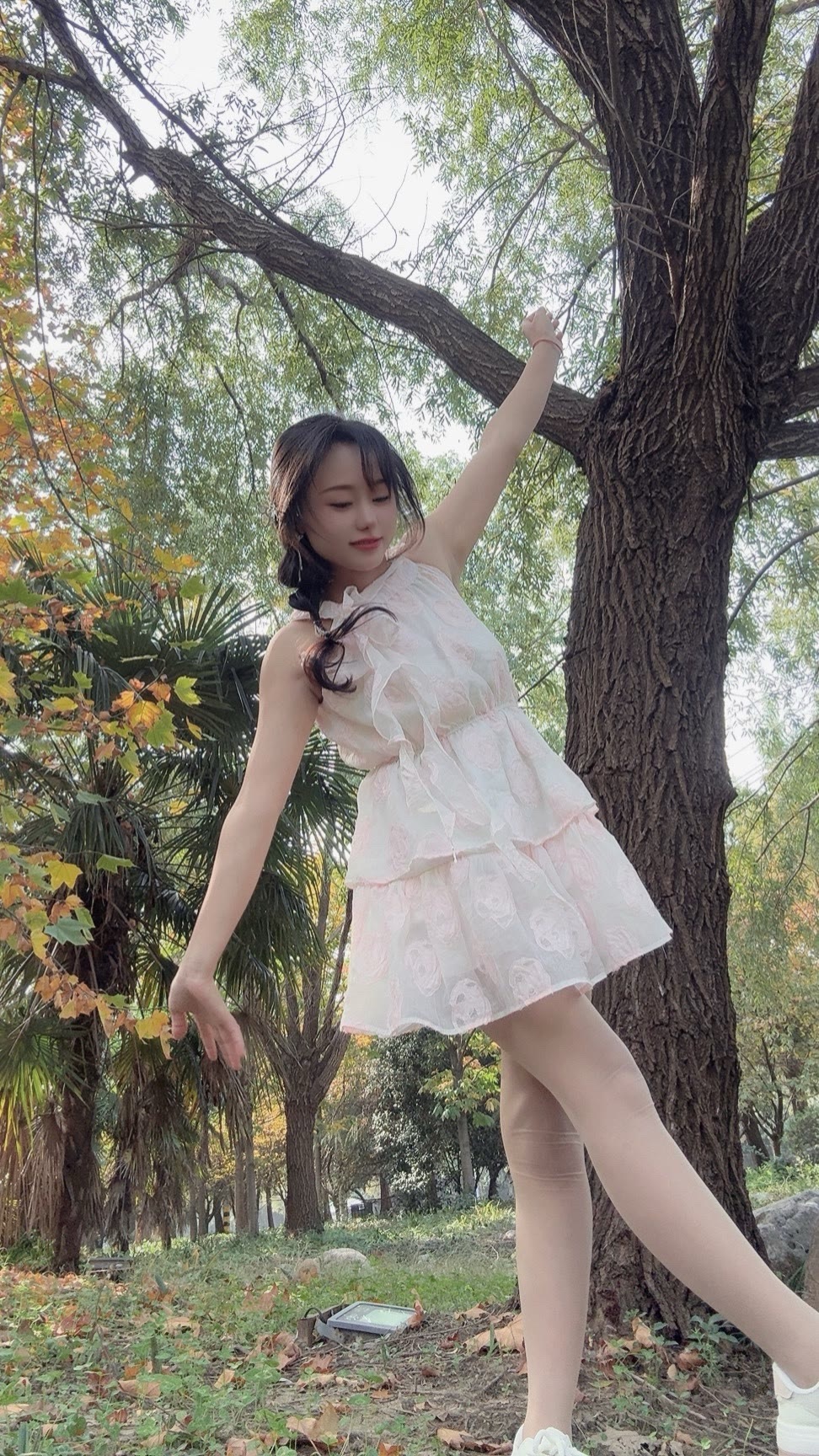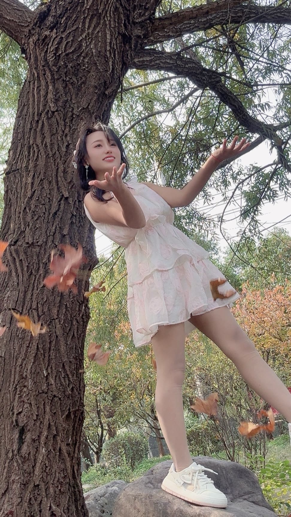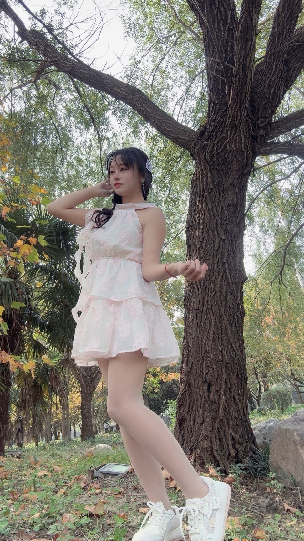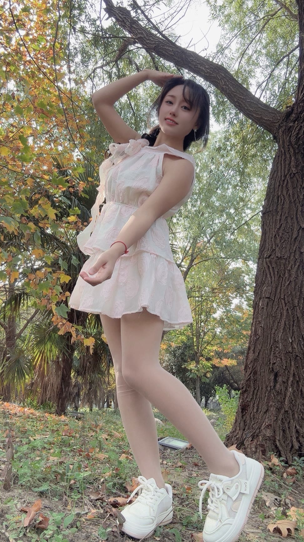 温柔的白色蕾丝连衣裙自带仙气,层层裙摆轻盈又灵动,配上小白鞋瞬间把甜美元素和松弛感结合得刚刚好~往树下一站,像从秋日森林里走出来的小精灵~