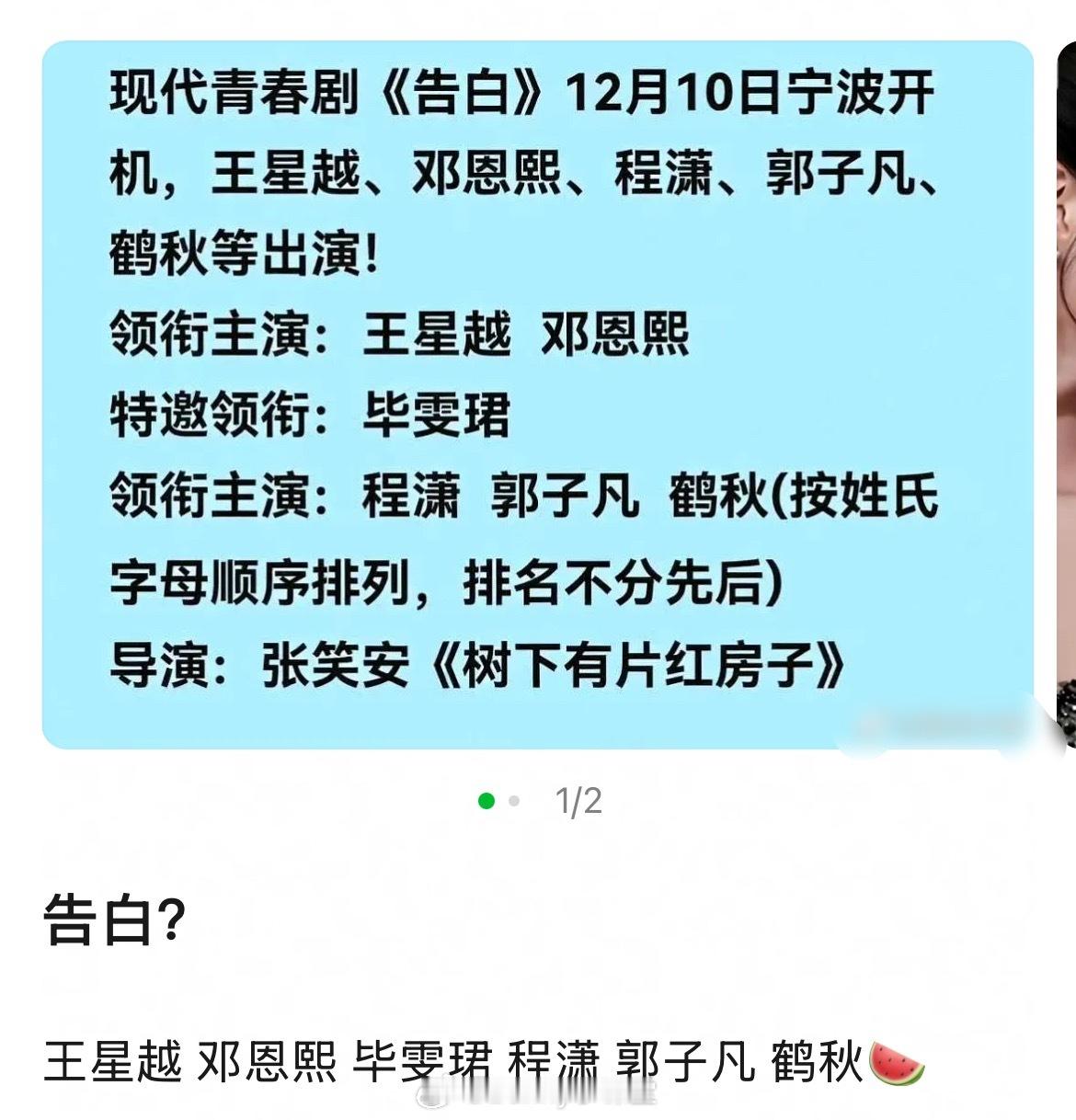 瓜主放了《告白》主演阵容:王星越、邓恩熙、毕雯珺、程潇等,网友猜测王星越可能会被毕雯珺掀桌……但是陈飞宇真的不演了吗