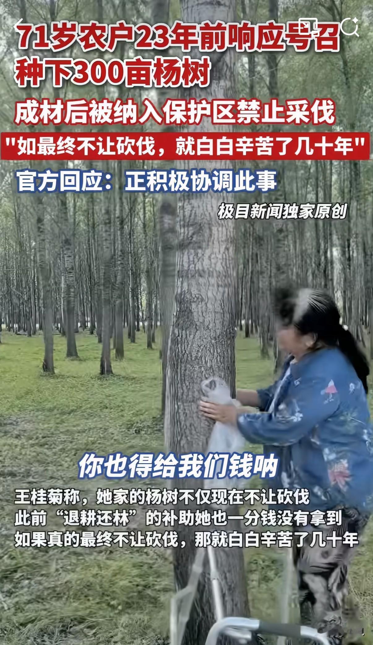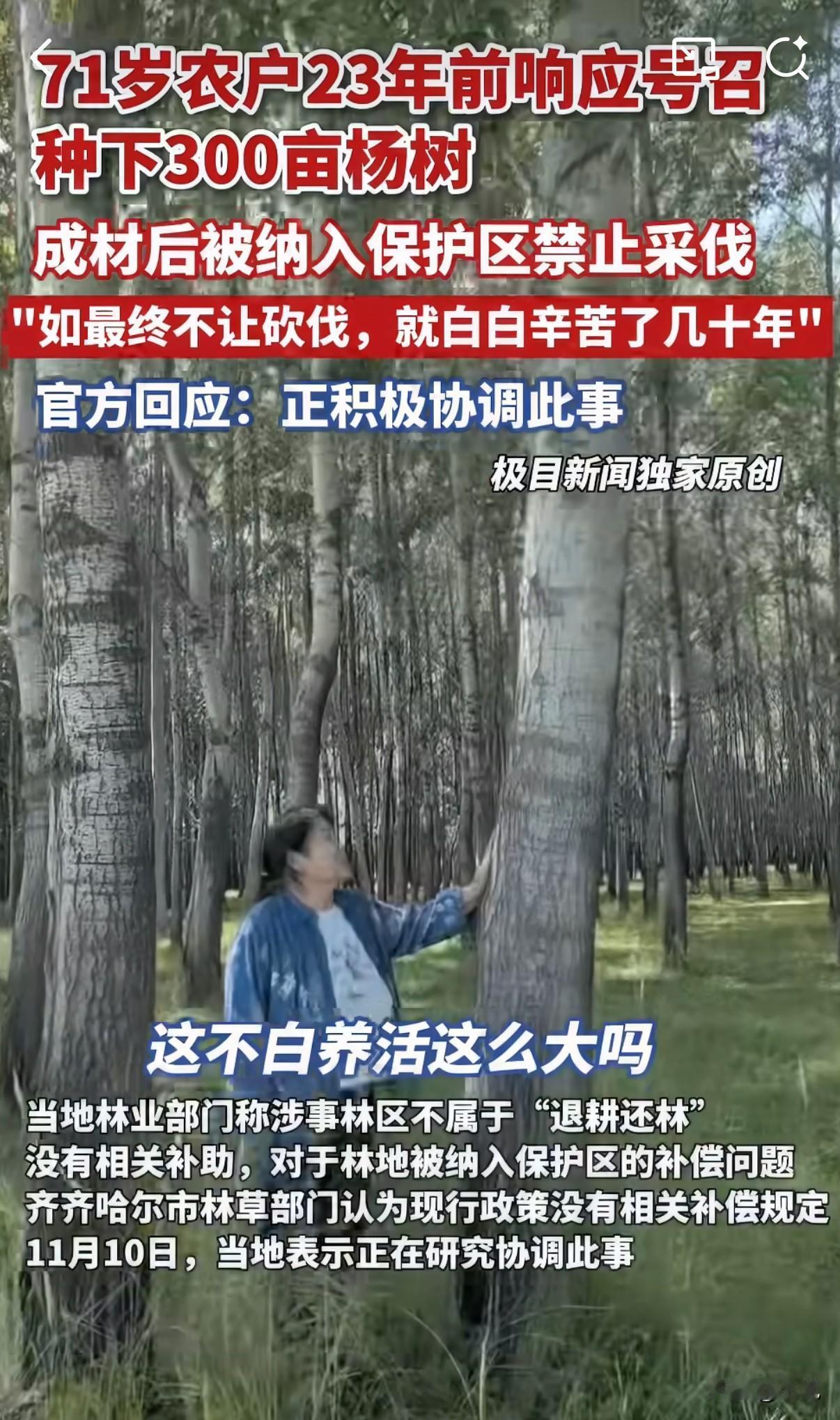 黑龙江齐齐哈尔一位71岁的老农户,23年前种下的3万多棵杨树,现在不让砍了。 这些树是她2002年响应号召种下的,整整305.5亩。当年签的《造林承包合同》上清清楚楚写着“林木成熟后可以申请采伐”。 王桂菊的女儿张丽说起这事很无奈:“父亲早逝,这二十多年全是母亲一个人打理这片林子。” 如今这些杨树长得正好,胸径都在20-40厘米之间,正是最佳采伐期。但去年12月,保护区管护中心发来通知:林地已划入自然保护区缓冲区,禁止采伐。 矛盾就在这里:种树时这里不是保护区,合同也允许采伐;现在树长大了,政策变了,却不能采了。 王桂菊还提到,她从来没拿到过退耕还林补助。林业部门解释:这块地属于“三北”工程造林地,不属于“退耕还林”项目。 当地林草部门回应:现行政策对这种情况没有补偿规定。 不过转机似乎来了。当地政府表示正在研究协调此事。 站在农户角度想:二十三年投入,就等着树木成材这一天。现在政策变化让期望落空,确实难以接受。 从保护环境角度看,划定保护区是为了生态保护,大家都理解。 关键在于如何平衡两者关系。种树时鼓励,成材时保护,政策衔接需要更顺畅。 好在当地已经开始重视这件事。希望能在保护生态的同时,也给辛勤付出二十三年的老农户一个妥善解决方案。 毕竟,诚信和公平同样重要。