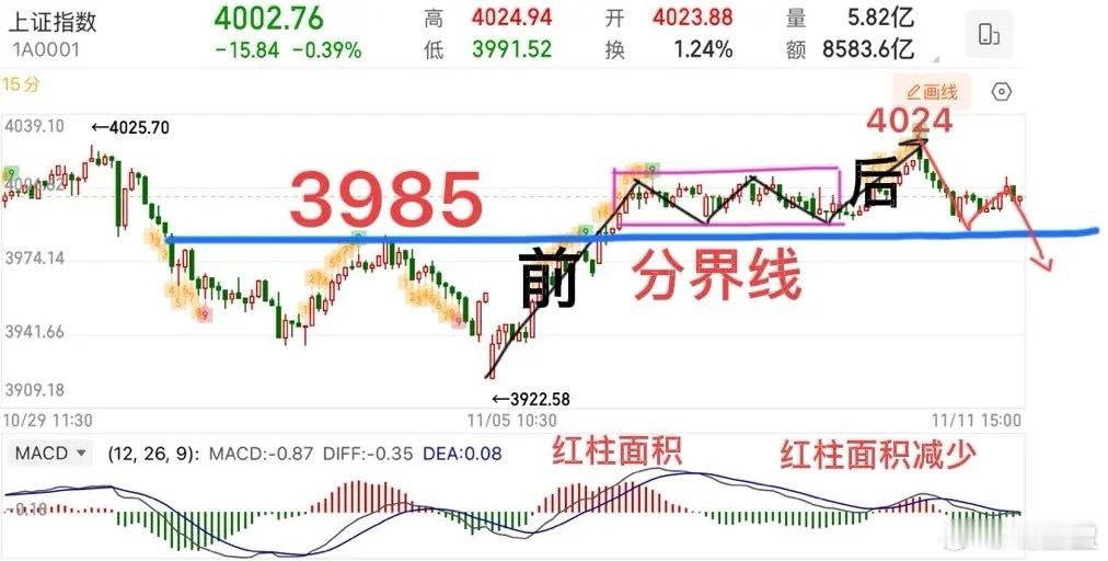 3985成短线防守核心,大盘震荡下需控仓谨慎!当前A股仍围绕4000点反复拉锯,4000点上方做多动力不足,无量环境下难以支撑行情持续向上。短线关键看点依旧是3985点位,不破则维持强势格局,若有效跌破,大概率向下测试3936、3922两道支撑位。从结构来看,以3922为起点的反弹段,对比前期走势,后续上攻力度明显偏弱,MACD红柱面积缩减也印证了多头动能不足,且指标已出现背离信号,因此今日高开低走的走势完全在预期之中。同理,以4024为起点的回调段,核心关注3985颈线位的防守效果:一旦失守,空头压力或进一步释放,后续将继续考验3936/3922支撑。总结来看,操作逻辑清晰:向上突破无量时需降低预期,坚决不追涨;回调过程中紧盯关键支撑位,跟随指数节奏择机把握个股机会,同时做好仓位管理,短线保持谨慎态度。