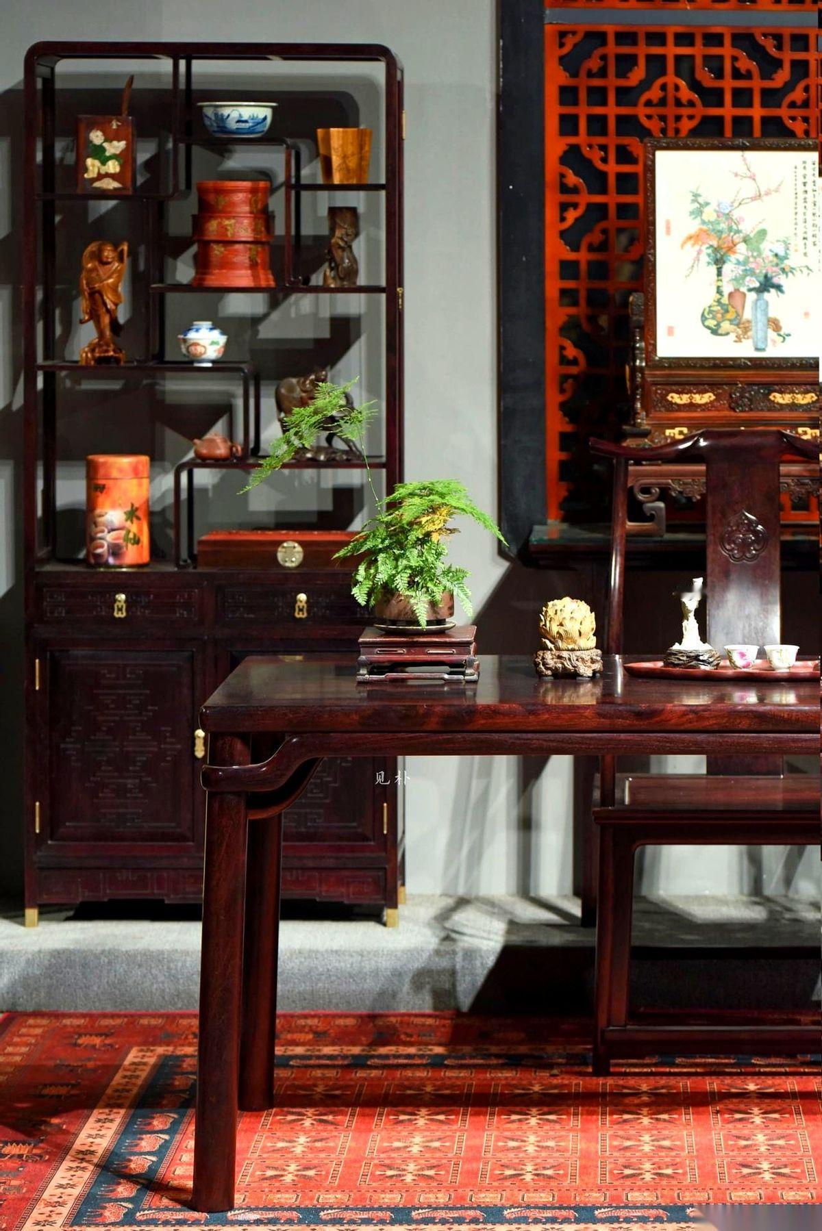 一块几百斤重的小叶紫檀,直接从中间给你挖个桌子出来。 剩下的料?边角料。 这叫什么,这就叫“关键部位也得整料挖取”。 很多人听见这话,第一反应就是,壕,真有钱。 然后就想到了那句广告词:没有百万茶室,配不上千万身家。 好像摆上这么一套东西,身家就自动贴上标签了,人就镶上金边了。 你以为有钱人是在买木头? 错了。 说白了,能玩到这个级别的,买的早就不是那点木头了。 他买的是一种“确定感”。 就像那个“圆包圆”的器型,通体没有一个棱角,从腿到面,全是圆润的弧线。摸上去,从头到尾,一顺到底。 这手感,其实就是他想追求的人生质感:顺,没刺儿,没坎儿。 真正坐在这张桌子前的人,他不会跟客人大聊这玩意儿多贵,多稀有。 他只会淡淡地说一句:来,喝茶。 然后看着你惊讶的眼神,或者看着你同样懂行的、会心一笑的眼神。 那一刻,所有想证明的东西,都在这杯茶里,在这无言的木头里,说完了。