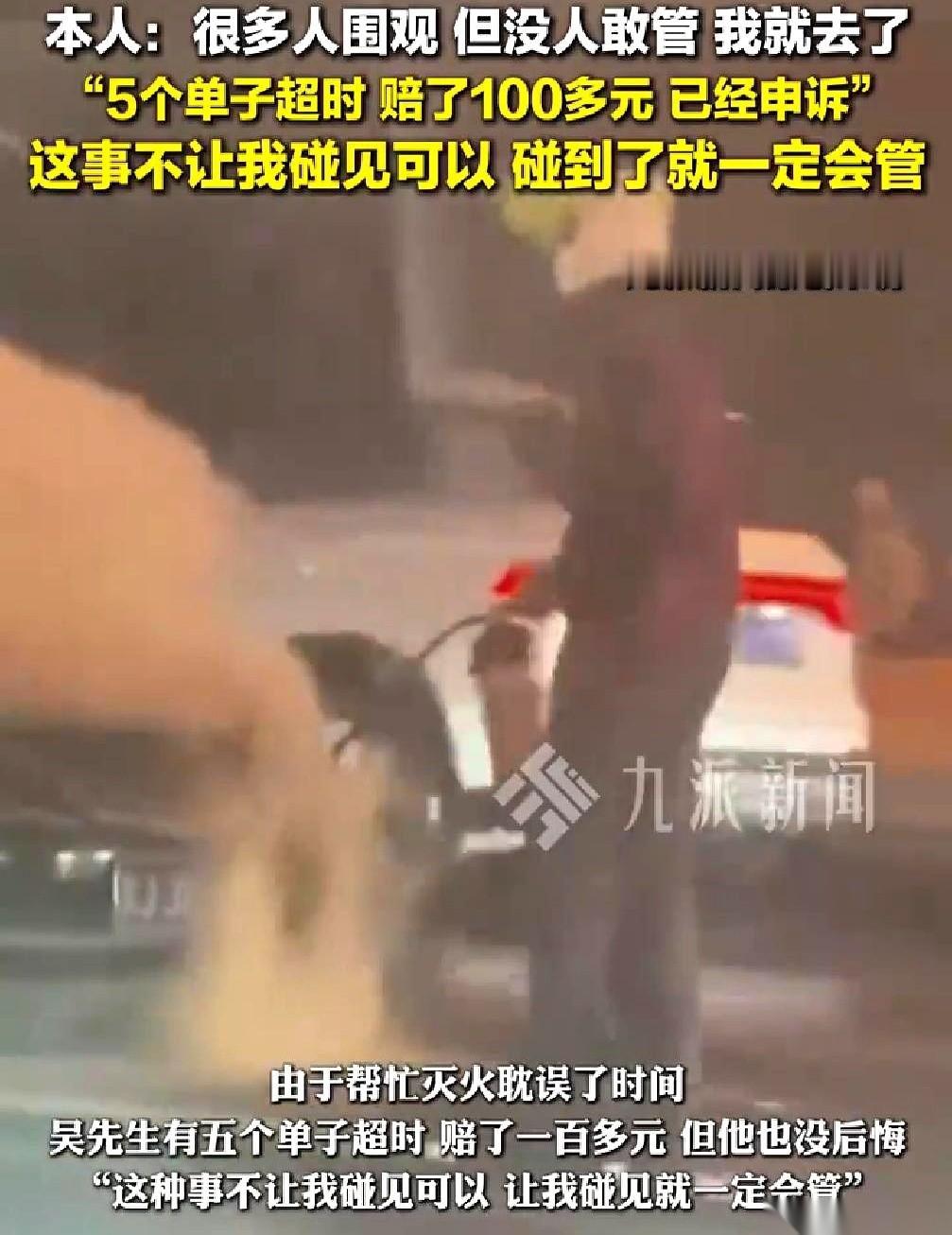 救了一辆快要烧起来的车,结果自己五个订单超时,被罚了一百多块钱。 这事儿就发生在前两天,山东泰安。 一辆车在万达门口冒浓烟,一群人围着看,指指点点,就是没人敢上去。 然后,一个外卖小哥,不知道从哪儿拎了俩灭火器,一个人就冲上去了。 三下五除二,把火给灭了。 等消防车来了,他看没事儿了,就赶紧走了,说还急着送单子。 就这么个事儿。 因为救火,单子送晚了,平台“哐”一下,罚款。 保安室一开始还让他赔新的灭火器,后来一听是救火,才算了。 你说这叫什么事儿? 幸好,那几个顾客都挺通情达理,都表示理解。 小哥自己也说了,以后碰见这事儿,还管。 “不让我碰见可以,让我碰见就一定会管。” 听听,这话。 多实在,多爷们儿。 有时候觉得这世界挺操蛋的,系统、规则,冰冷得像铁。 但总有这么些人,心里揣着一团火。 这团火,比任何规则都热乎,比任何系统都有力。 这100多块钱,罚的是一个好人,但也是一面镜子,照出了人心最该有的样子。