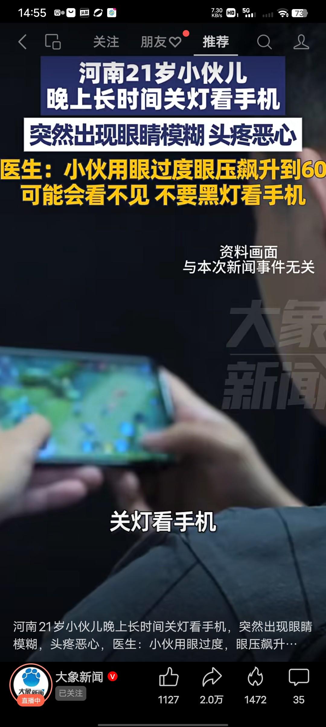 你是不是也习惯晚上关灯看手机呢?看看这个习惯的后果有多可怕? 河南21岁小伙晚上长时间关灯看手机,突然出现眼睛模糊头疼恶心。 郑州大学第一附属医院,主任医师张凤妍说,他的眼压升到60,葡萄膜炎引起的青光眼,又称青睫综合征,究其原因是他用眼过度引起炎症发作,从而导致眼压升高,可能会看不见。 我觉得大多数人都有个习惯,就是习惯把灯关了看手机,总想这样即节省电费又不刺眼。殊不知这样对眼睛的伤害太大了,最轻的后果就是视力下降的快,再者可能导致一些我们意想不到的后遗症甚至失明。就为了那点电费,真的是得不偿失啊! 友情提示一下,所有的友友们,千万别关灯看手机了,别拿自己眼睛开玩笑啊,切记,切记。