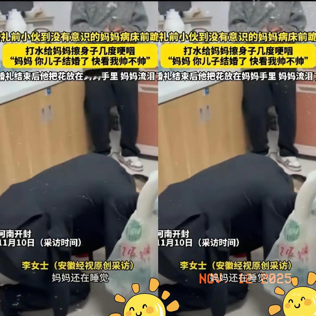 泪目了!河南开封,新人婚礼结束,晚上本该同房的时候,新郎却把新娘拉到了医院,跪在病床前,朝床上的病人恭恭敬敬拜了三拜,原来,躺在病床上的正是新郎张松林的母亲,而母亲却没有了意识。 总有人说现在的婚礼满是功利,彩礼、排场压得人喘不过气,可张松林和王敏却用一场“简陋”的婚礼证明:婚姻的真谛从不是仪式多盛大,而是两颗心愿意共担风雨。 新郎没因母亲昏迷推迟婚期,他要让妈“见证”自己成家;新娘没抱怨新婚夜泡在病房,反而裹着婆婆冰凉的手取暖,轻声细语地哄着。那束特意带来的康乃馨,那句“你在哪、妈在哪,哪里就是家”,比任何豪华布置都更显深情。 孝心从不是作秀,婚姻也不是搭伙过日子,真正的爱,是把对方的牵挂当成自己的责任。在这个追求形式感的时代,这样的真情才最难得。 你觉得这场特殊的婚礼,是不是比盛大的排场更有意义?