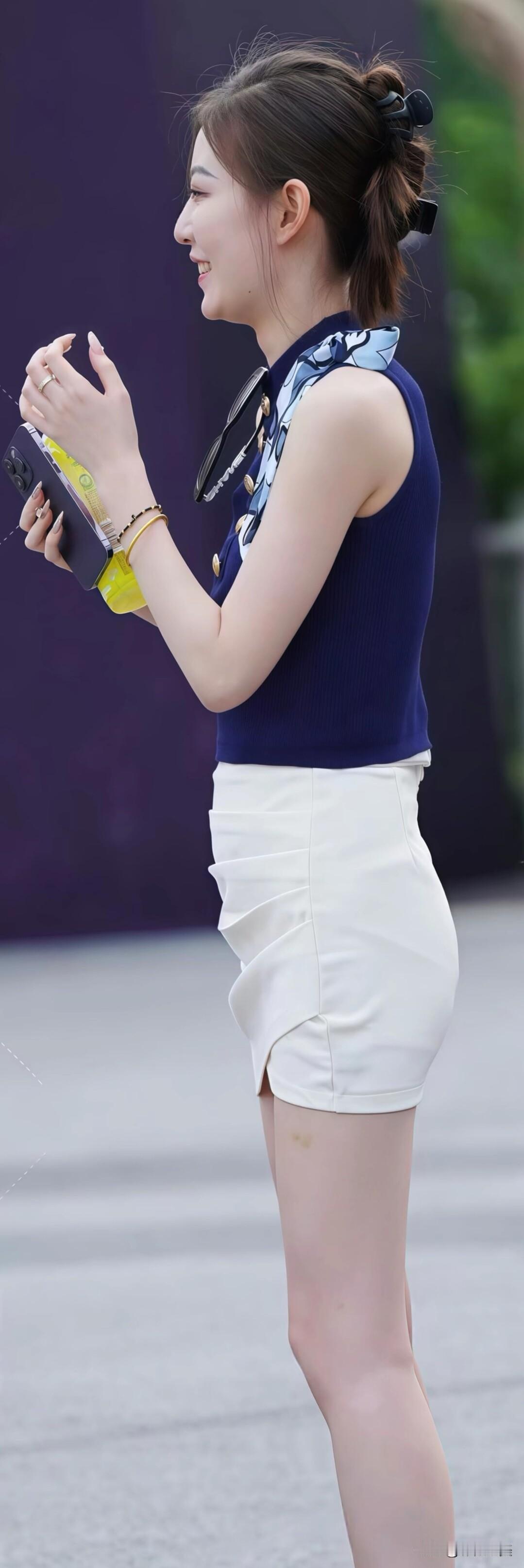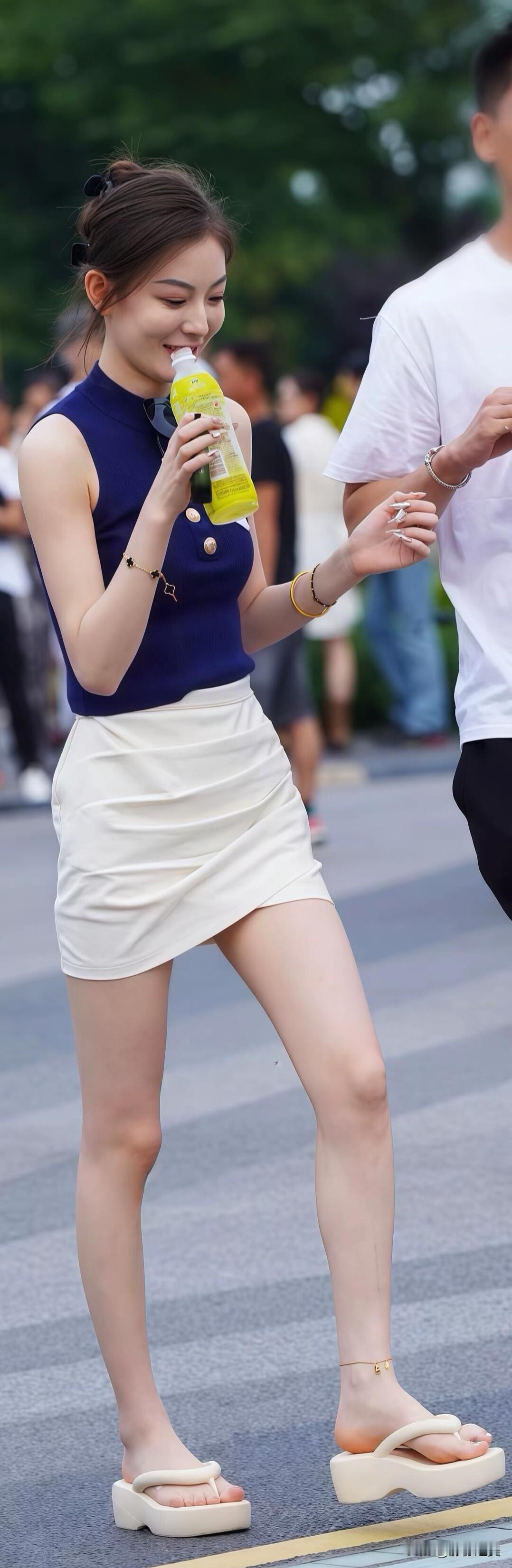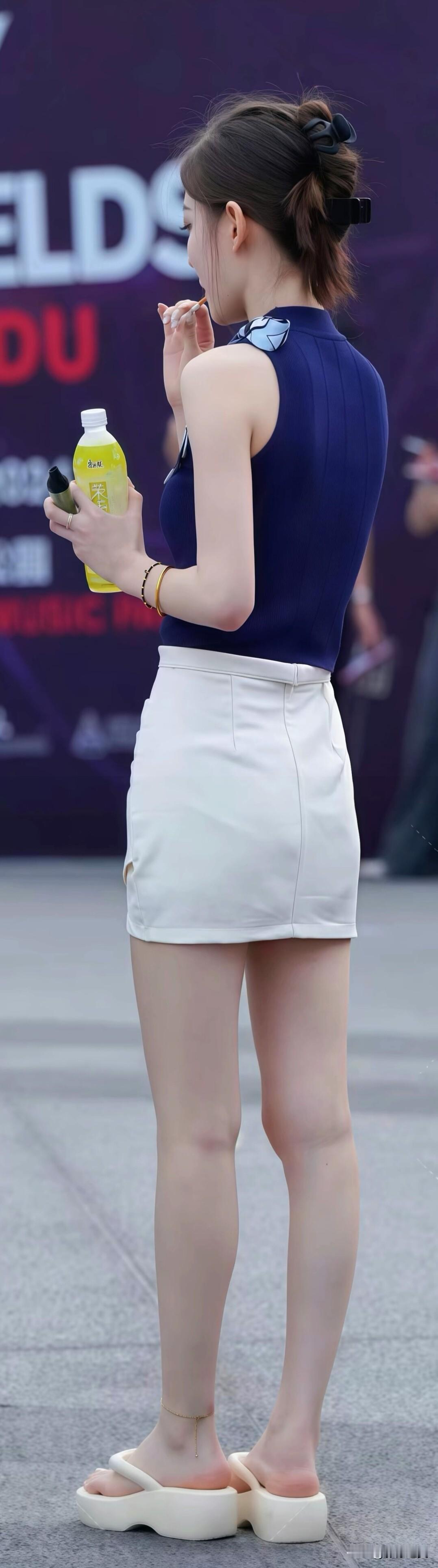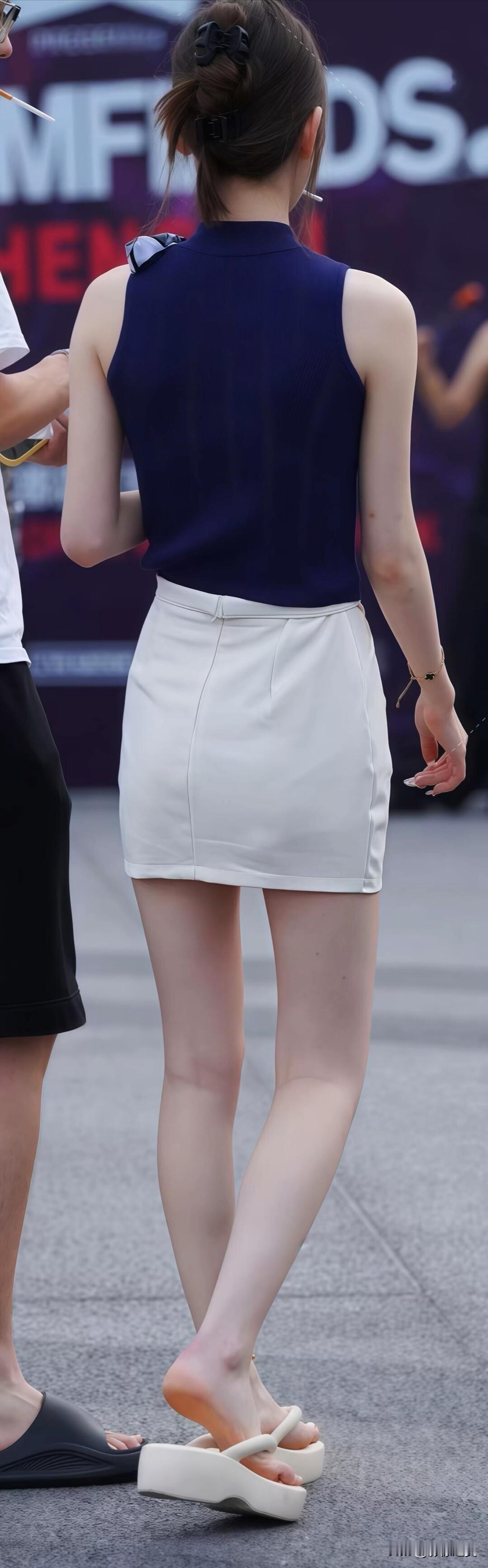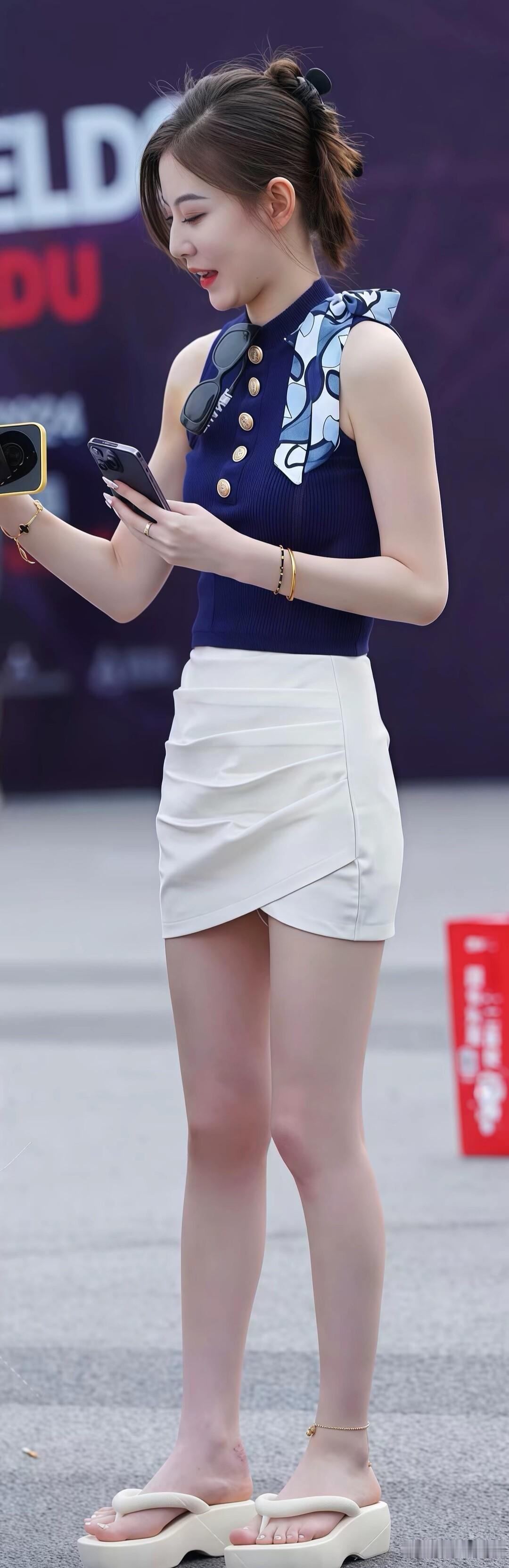 深蓝色无袖上衣配白色短裙,时尚又清新。厚底人字拖与金色配饰,尽显个性品味。