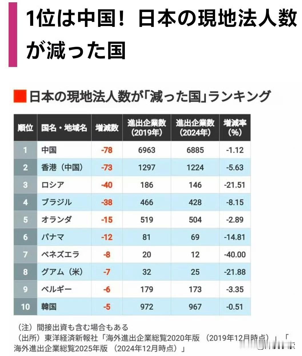 过去五年,日本海外企业撤退最多的国家是中国! 日本媒体搞了个排名。 在炒作了中国经济下滑,中国反日对日本不友好,危险后,日本在华企业过去五年减少了73家啊。 结果一看,在中国的日本企业有6800多家。 后面2-10位,9个国家和地区加起来都没在中国的日企多。 对了,日本在香港都有1200多家企业。 脱中?脱衣服就裸奔了。 日本对外净资产