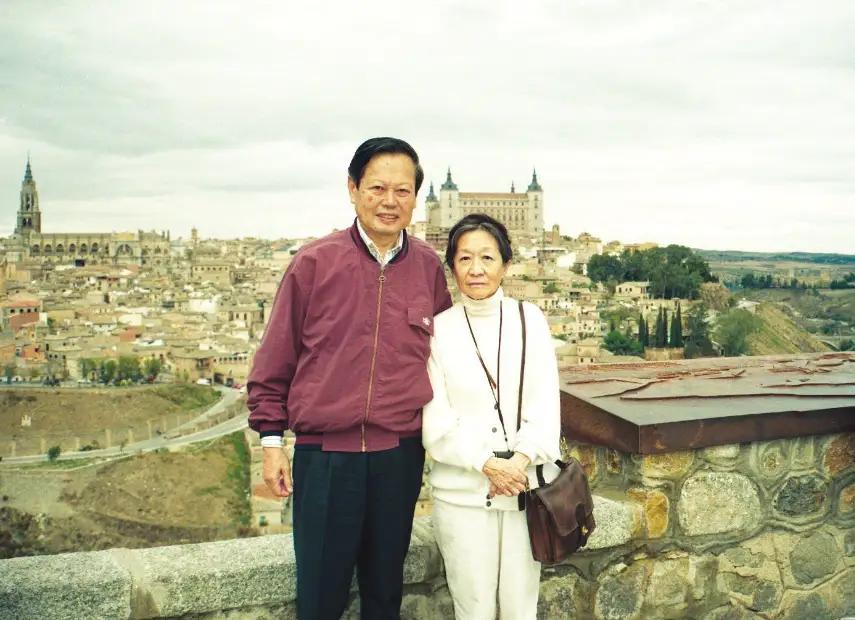 1993年11月,杨振宁夫妇在西班牙托莱多古城留影,背景可见托莱多主教座堂与阿尔卡扎城堡。