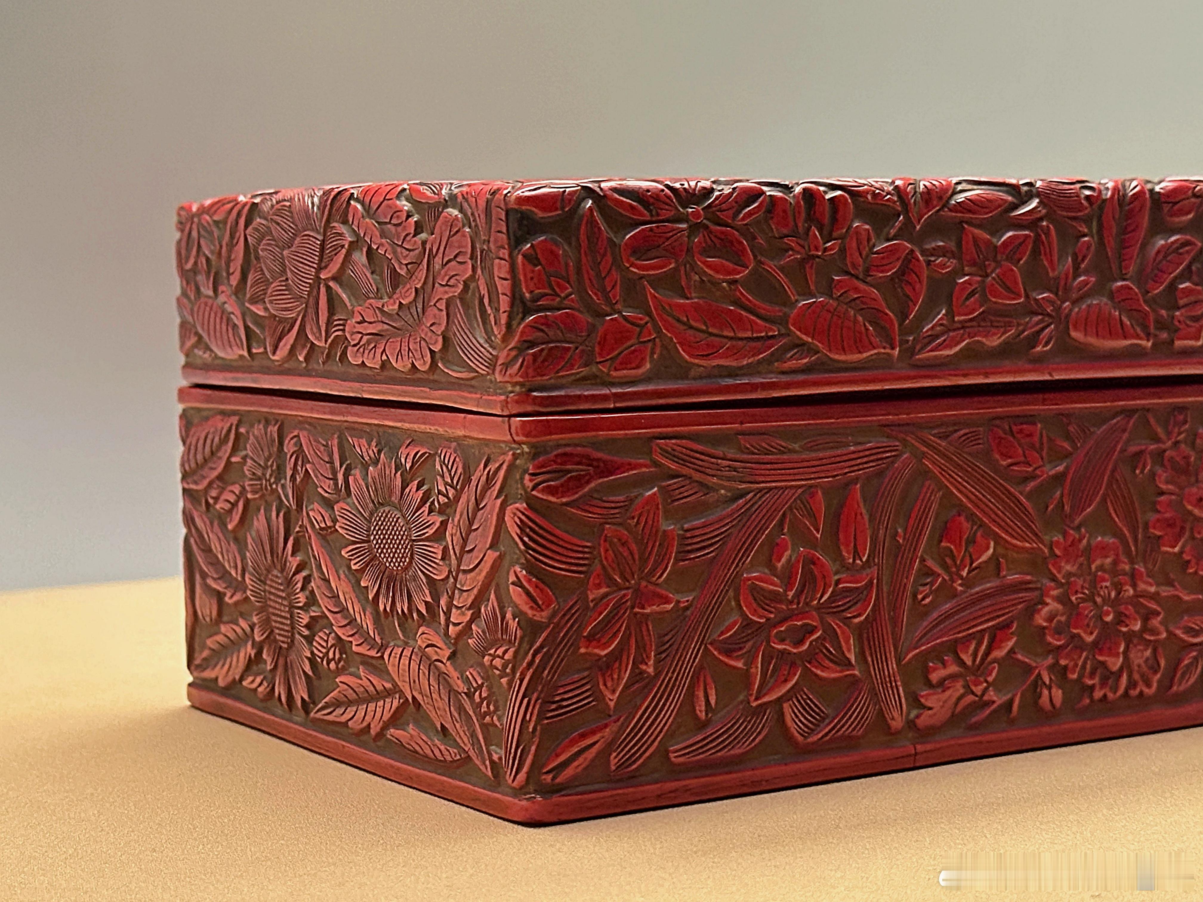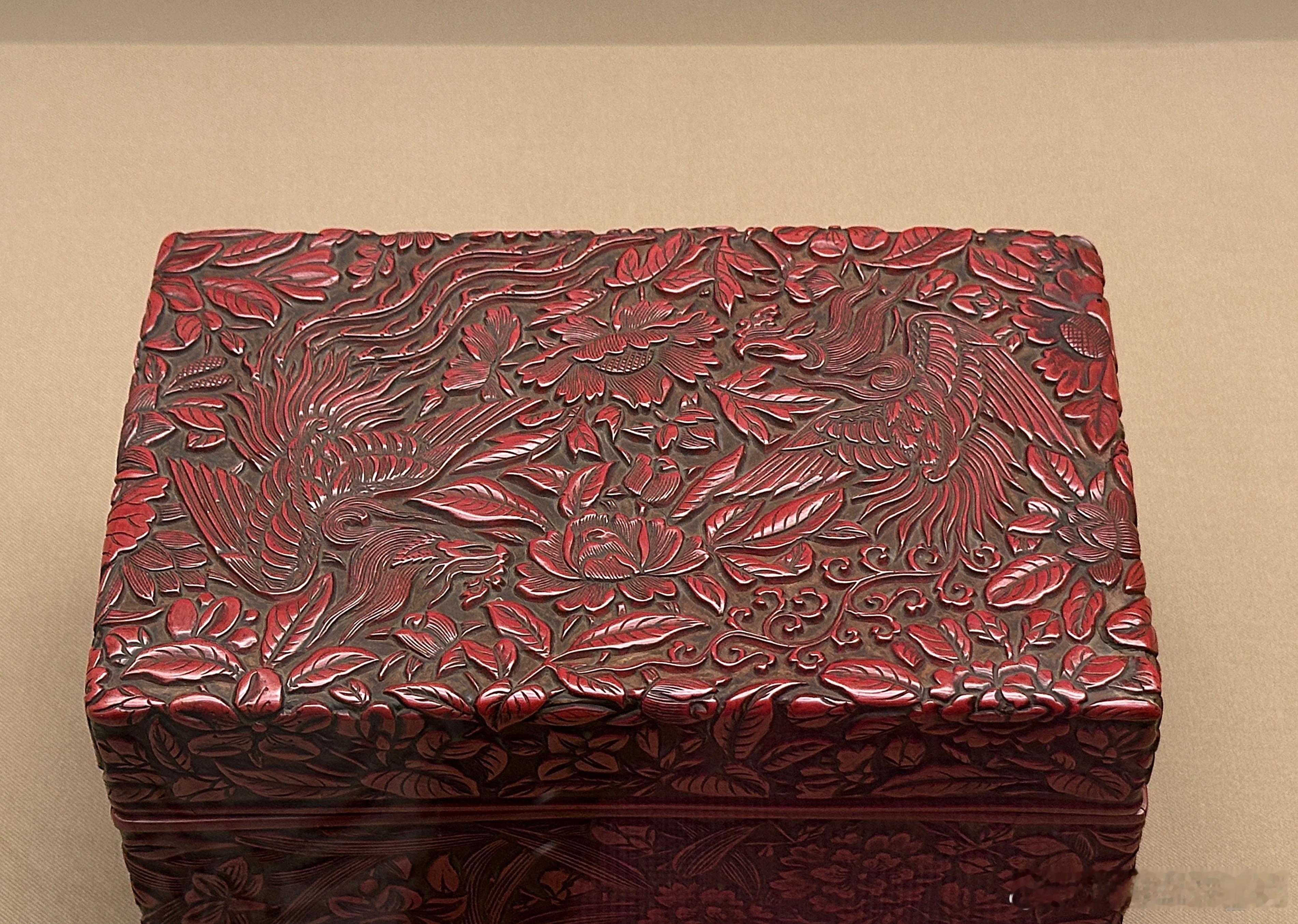 剔红凤凰牡丹纹长方盒 南宋13世纪 东京国立博物馆藏木胎,子母口长方盒。外壁黄漆地上髹鲜艳朱漆,盒内髹黑漆。盖面雕一对凤凰穿行于莲花、菊花、山茶花、栀子花、蔷薇等花丛中,盒体四周饰水仙、牡丹、菊花等花卉。纹饰布局疏朗,黄漆地清晰可见。盖内有“洪福桥吕铺造”针刻款。“洪福桥”为南宋时期杭州桥名,元代改称“红桥”。据此可推测本盒为宋代制品。此盒传入日本后,曾为尾张德川家旧藏。《御道具账》记录其名为“御沈箱”,昭和六年(1931)前,作为香道具使用。 摄于上海博物馆