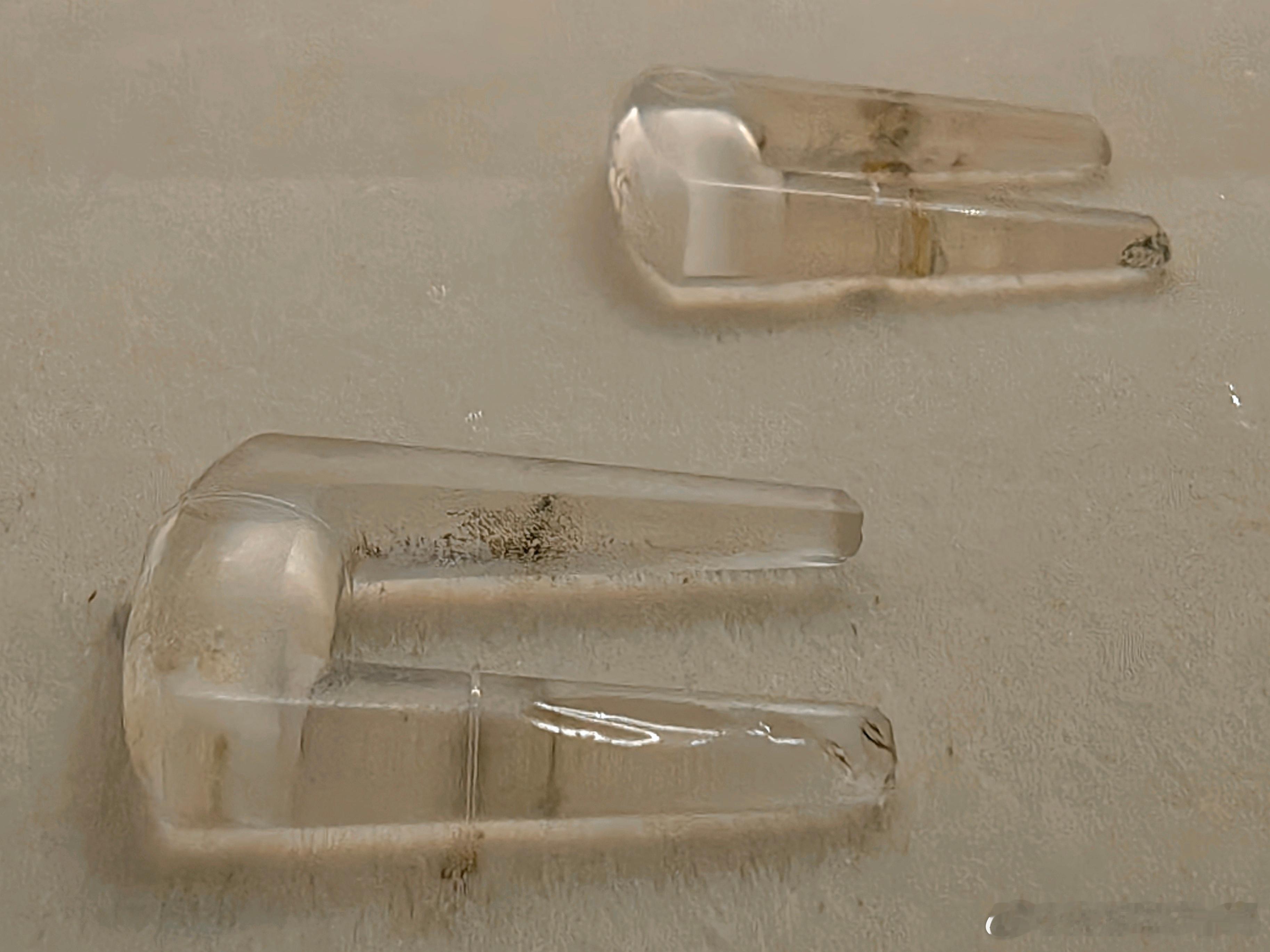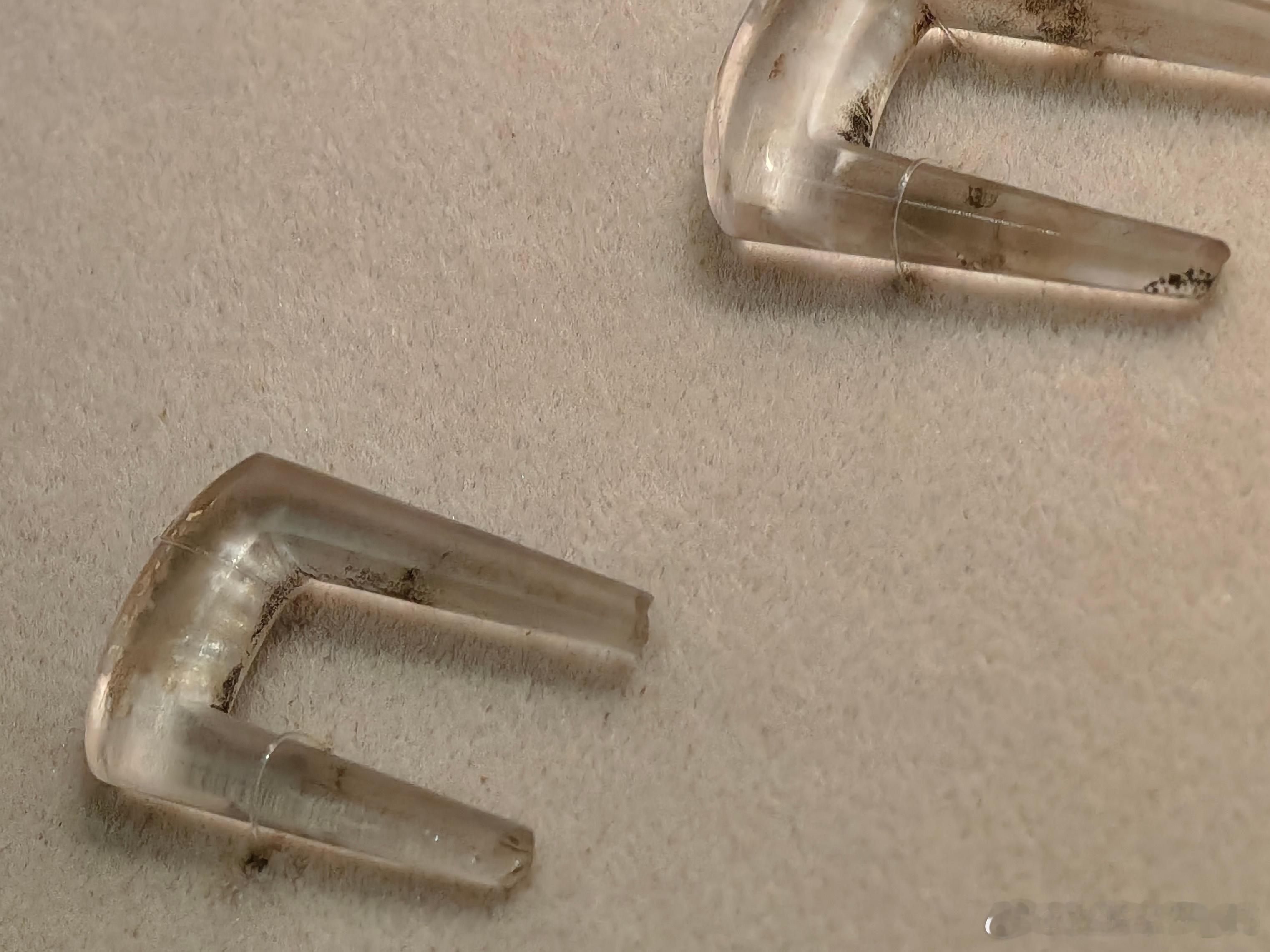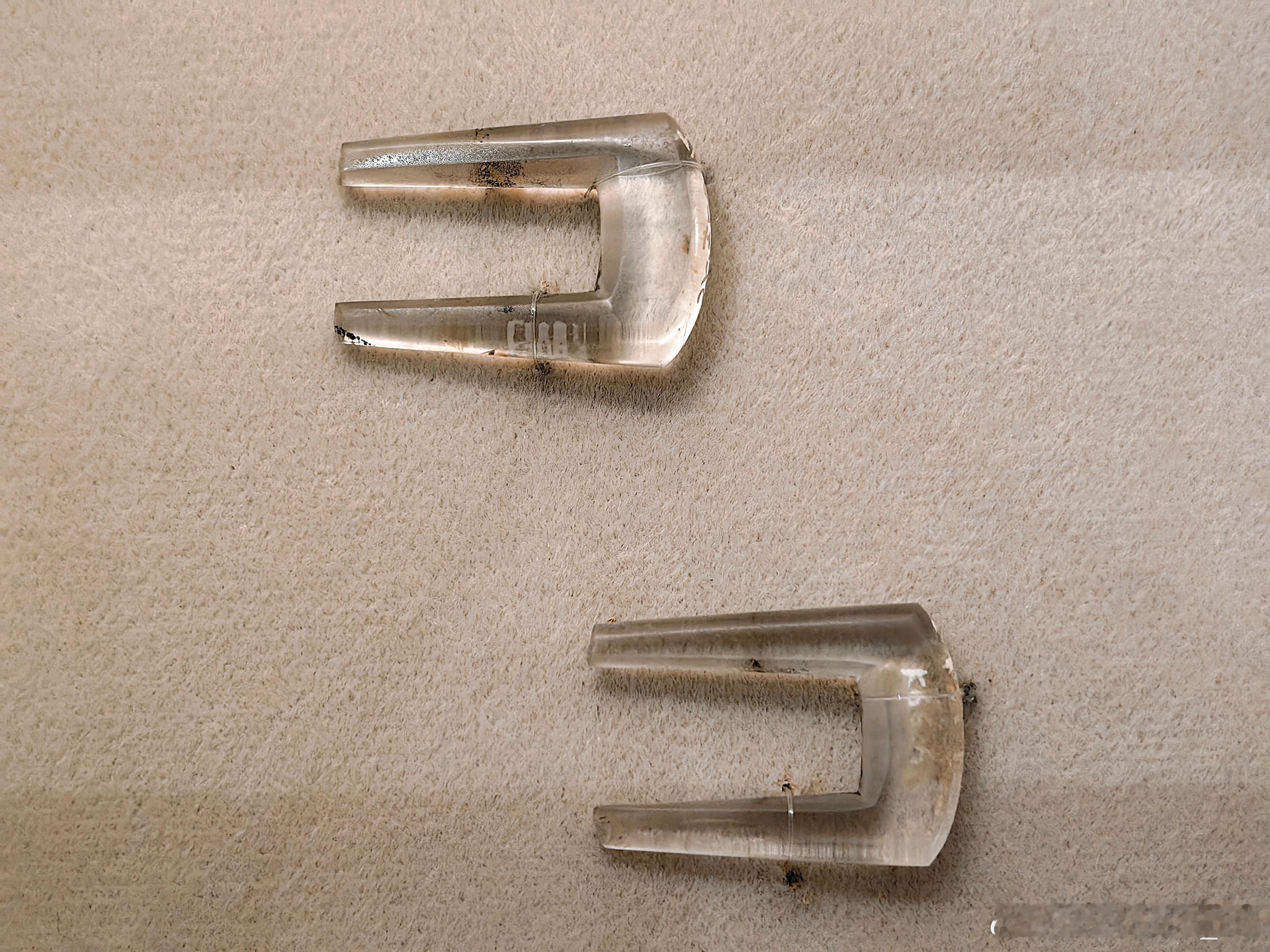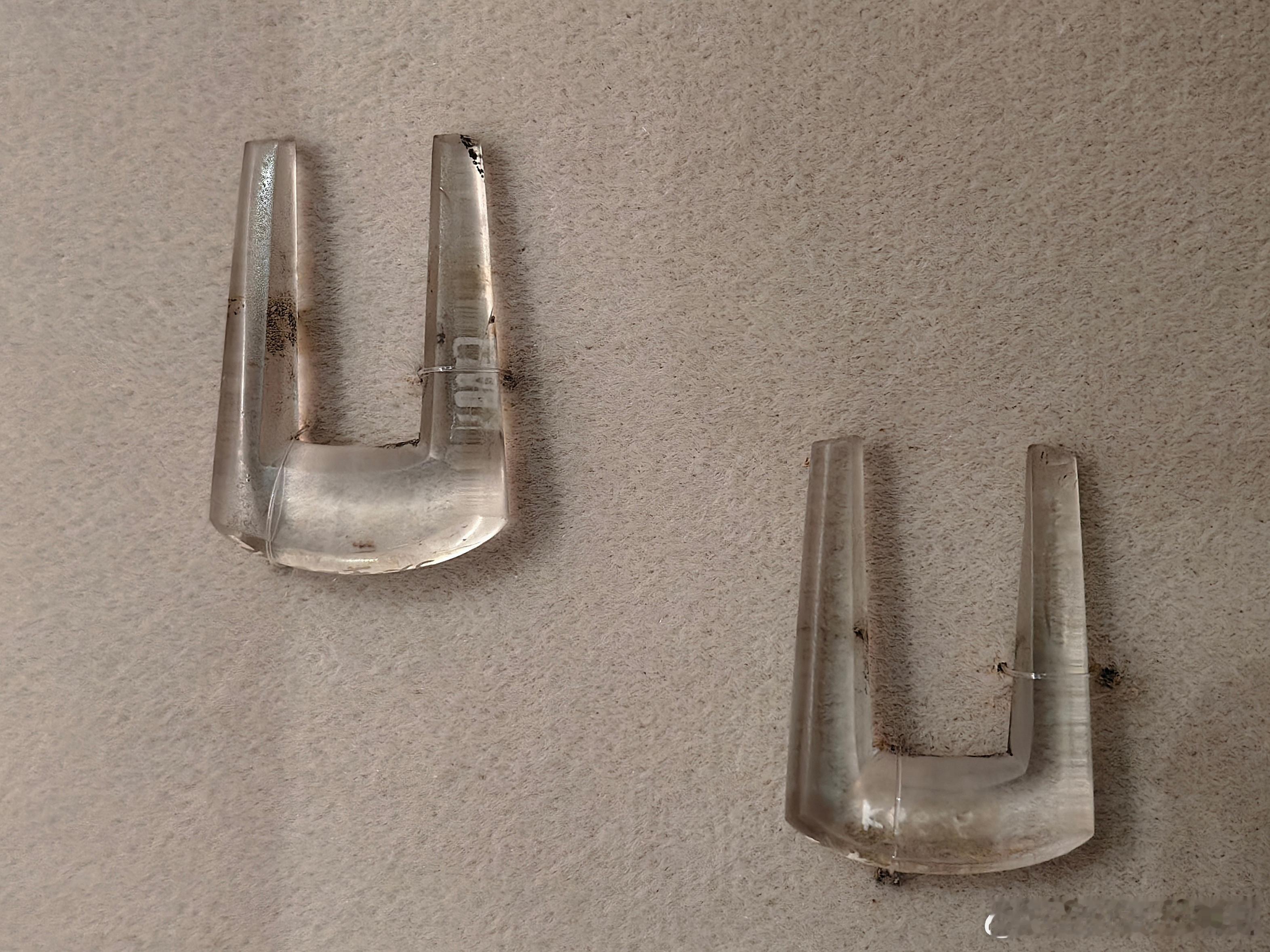 水晶钗隋(公元581-618年)国家博物馆藏1956年陕西西安李静训墓出土,当时一共出土了三件,这是其中两件。这组水晶发钗以纯净透明的水晶雕琢而成,形制为双股折角式,设计简洁而优雅。长度在3.2-3.9厘米之间,出土时一件水晶钗位于小姑娘头骨顶部,显然是她生前使用的发饰。