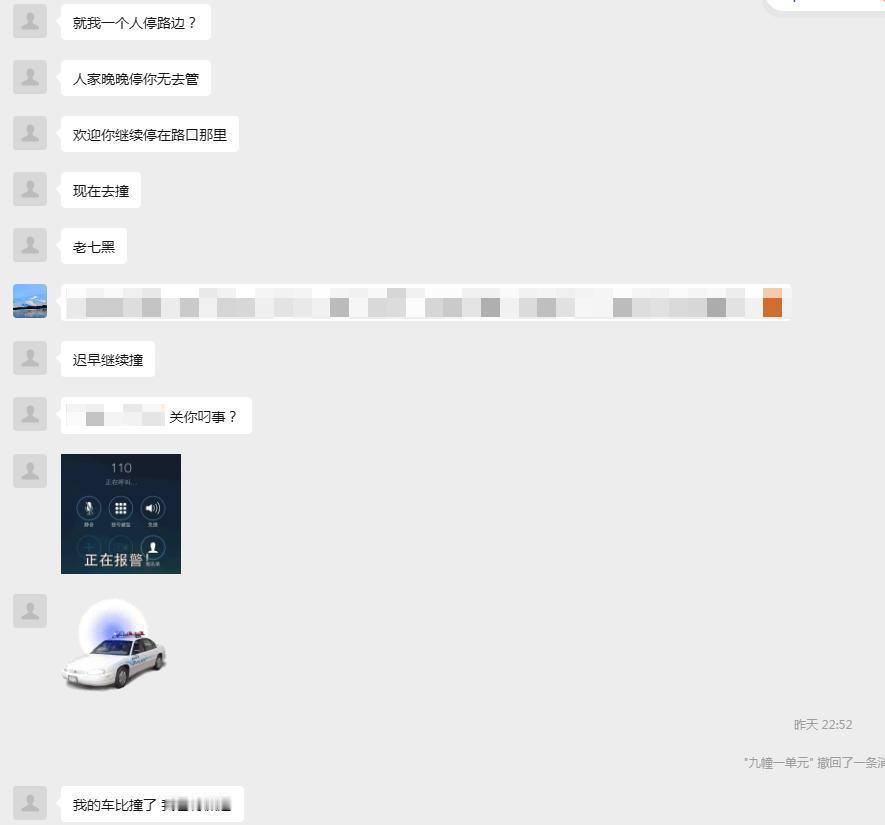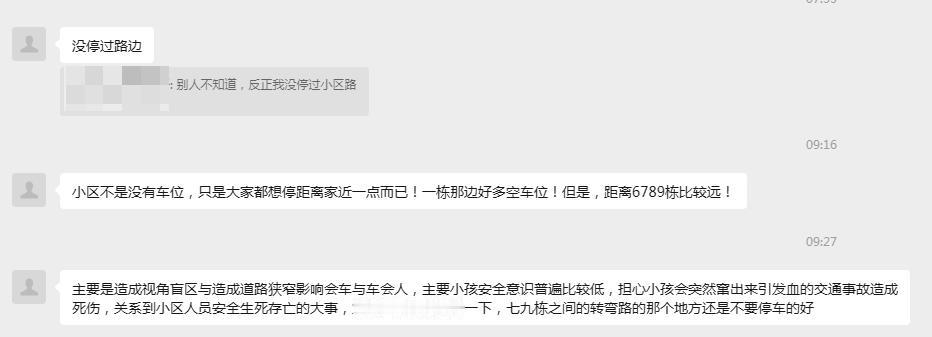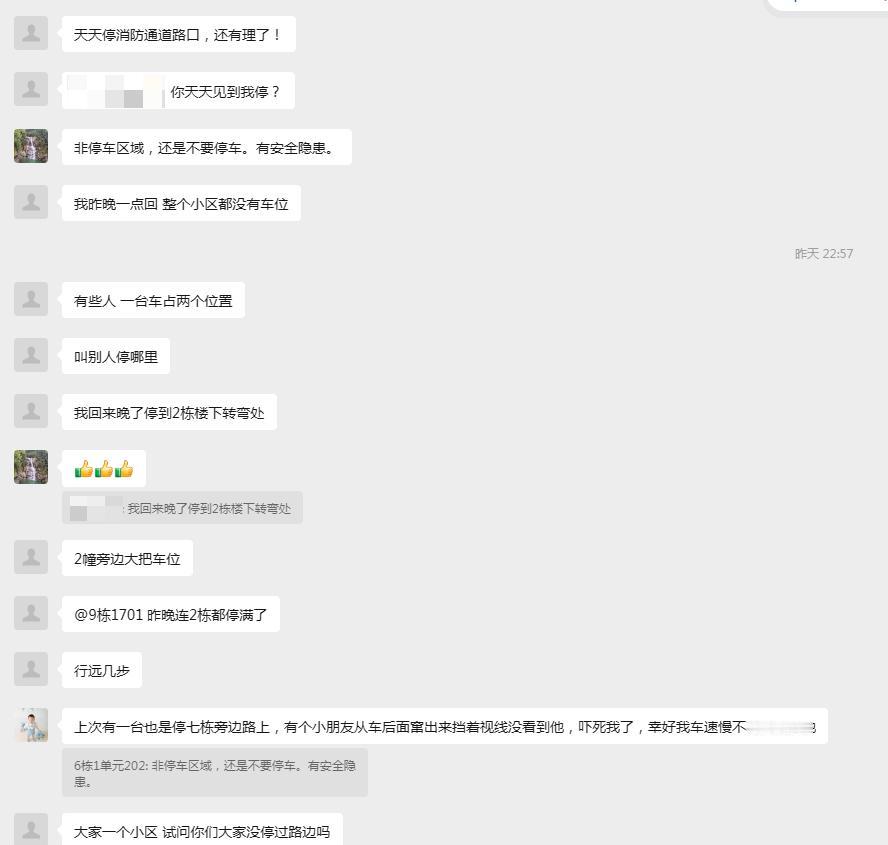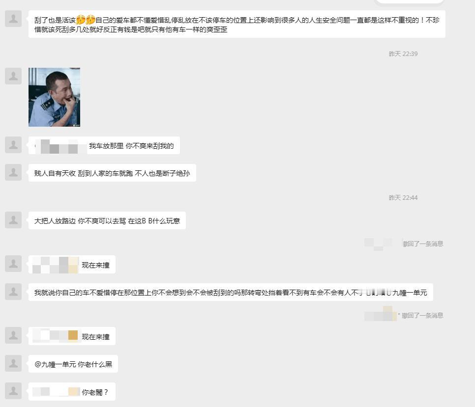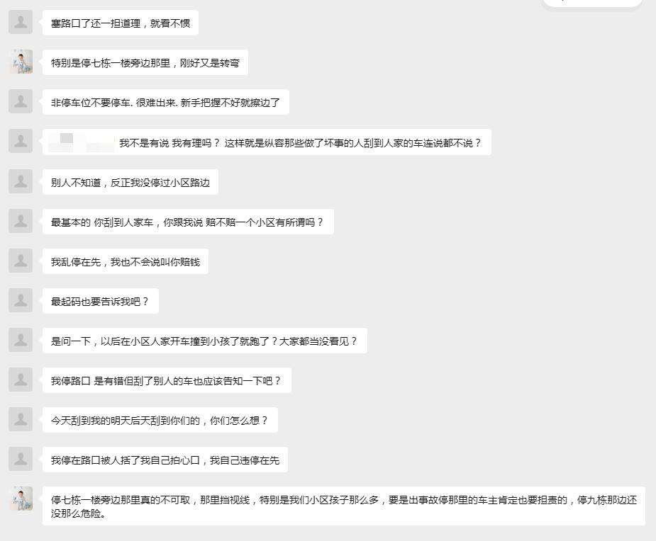 小区业主群昨晚的一起自己网暴自己事件。 一业主违规停车,将车停在小区道路上,不知道被谁刮花,在业主群扬言要报警。 结果不但没有招来同情,反倒是引起了群殴。 从开始的气焰嚣张,到最后的“我停路口 是有错但刮了别人的车也应该告知一下吧?” 本来违规停车就招人恨,何苦发到群里自己扇自己的脸! 就看长不长记性了。