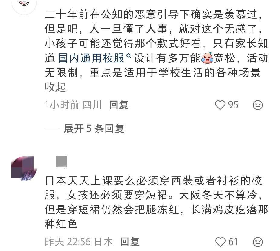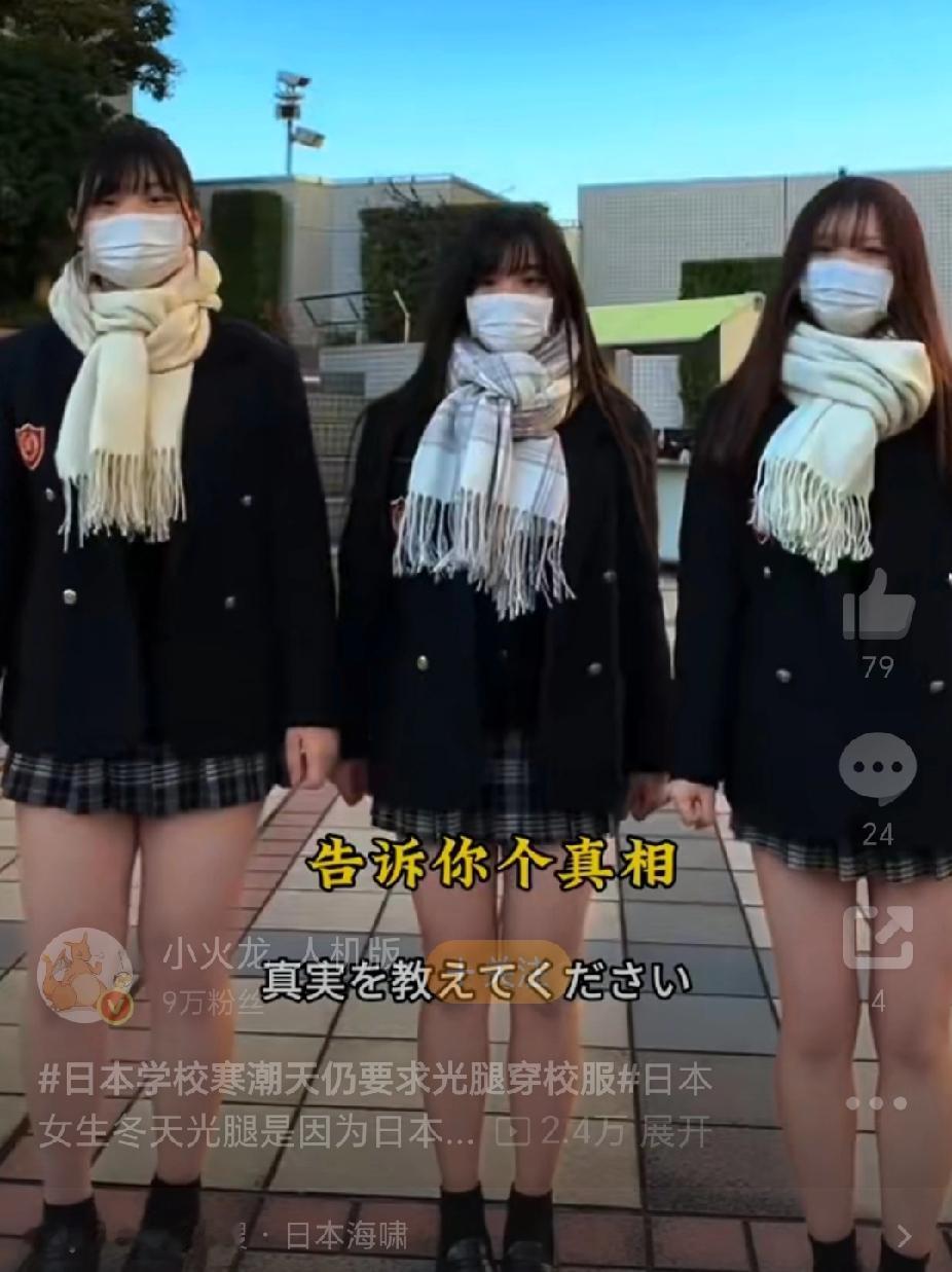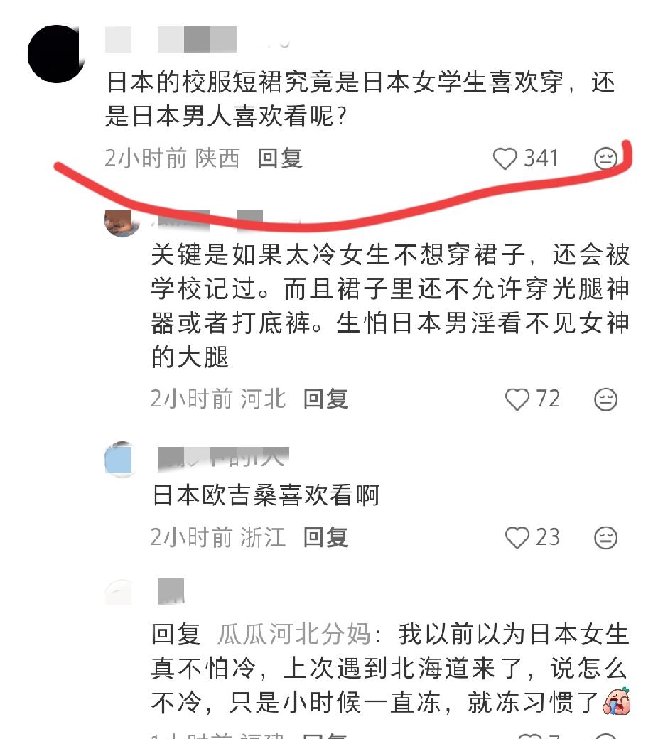 日本女作家转发一段咱家中学生打饭视频,取笑咱家的校服款式太老旧,一点都不时尚,跟他们日本女学生穿的校服没法比。 然而这段视频播出以后,日本网友的关注点全跑偏了,日本网友根本没关注校服款式,反而羡慕咱家学生手里打的饭。 以下是日本网友的评论: 他们中学都吃的这么好吗?能吃到这么多菜,还有足够的米饭,太羡慕了。 普通中学都吃的这么好吗?跟我们比起来,我们的食堂太寒酸了,吃的不好也吃不饱。 真羡慕他们的中学生。能吃到这么地道正宗的中餐,这么多的菜,营养丰富,什么时候我们日本也能吃上这样的饭菜呢? 所有的日本网友全都羡慕咱们中国的中学生吃的校园餐。然而,日本网友的观点转发到咱中国来,中国网友却是却没有在意这些饭菜,因为这些对于我们来说习以为常,不管在哪里都吃的一样好。 我们反问日本人: 日本的校服穿短裙,是日本女学生喜欢穿?还是日本男人喜欢看呢? 日本校服的确是好看,但唯一就是不适合在学校穿。 女孩子必须要穿短裙,大冬天的但是穿短裙仍然会把腿痛冻红,长满鸡皮疙瘩那种红色。 关键是女学生不穿的校服短裙还会被记大过,以前以为她们都不怕冷。现在知道了,是那些女孩子冻习惯了。真可怜日本的女学生。 日本有严寒教育,下雪天也光腿穿短裙,她们都不知道什么是光腿神器和秋裤。 只有我们自己知道,我们的校服是以舒服宽松。孩子穿了家长希望是一种万能的,适合于各种场景的舒适服装。日本人怎么会懂呢?日本校服再好看,我们也不希望自己的孩子穿,尤其上学的时候穿。日本学校热议