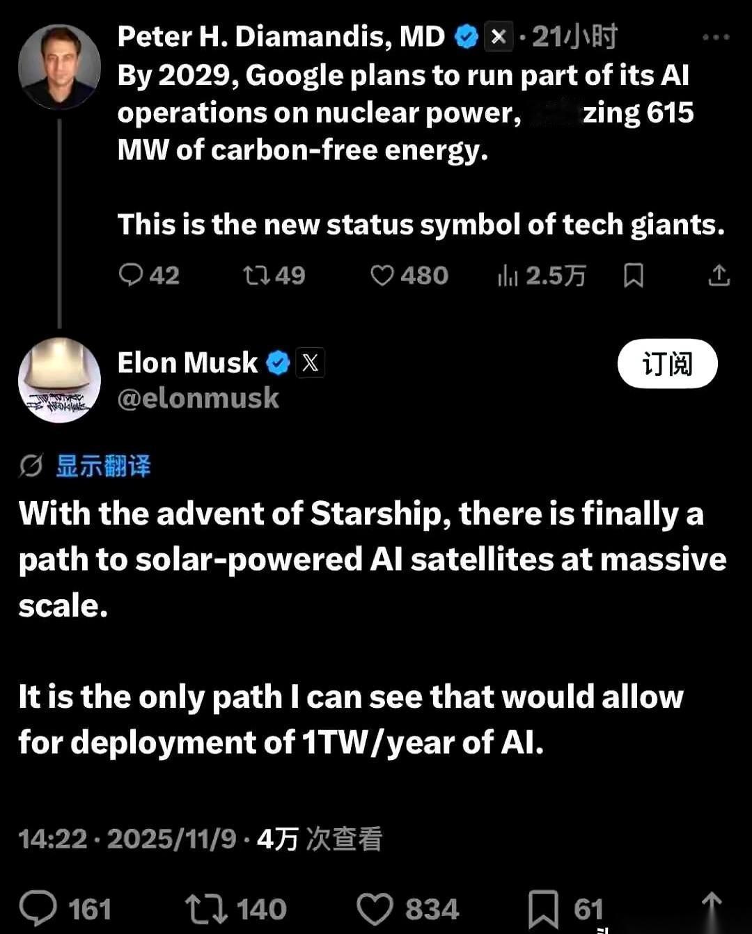 马斯克要把AI算力中心搬到天上去。 我第一反应是,这人又在整什么新活儿? 结果一看,乐了。不是他想上天,是实在没办法了,被逼的。 说白了,他家里的电网,根本喂不饱AI这只电老虎。人工智能一跑起来,吃电跟喝水一样,美国那老掉牙的电线杆子,真撑不住。 所以老马一拍脑袋:上太空! 用太阳能发电,太空还贼冷,正好给服务器降温,一举两得。完美! 他画了个大饼,说这套太空系统一年能发1太瓦的电。 听着很多是吧? 结果一算,连我们国家一年发电量的千分之一都不到。 千分之一啊! 这感觉就像什么呢?你家厨房太小,施展不开,于是你决定在月球上盖个新厨房。 听着是挺牛逼,但根子上的问题是,你家厨房为啥这么小? 真的,有时候我们都忘了自己生活在什么样的基础设施里了。 我们习惯了随时随地满格的电,习惯了夏天把空调开到18度,习惯了这一切都理所当然。 而别人呢,已经开始为这点“理所当然”的事,构思起了太空歌剧。 所以说,什么叫真正的科幻? 不是飘在天上的PPT,而是我们脚下这片土地,这股让你心里踏实的、源源不绝的电流。