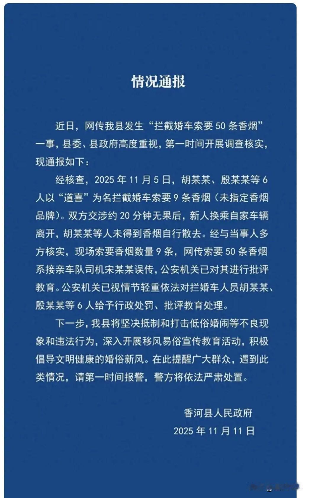河北6人拦婚车被处罚,警方通报来了! 11月11日廊坊香河县发布了“拦截婚车索要香烟”事件的通报。原来在11月5日,胡某某等6人以“道喜”之名拦婚车要9条香烟,并非网传的50条,那是接亲车队司机宋某某误传,他也被警方批评教育了。 这6人跟新人交涉20分钟没要到香烟,新人换车离开后他们才散去。目前,警方已根据情节轻重对这6人进行了行政处罚和批评教育。这种拦婚车索要财物的行为真的很让人反感,还好警方及时处理。以后大家遇到类似情况要第一时间报警。 网传索要50条香烟系接亲车队司机宋某某误传,公安机关已对其进行批评教育! 有网友留言说,我2001年结婚的时候,接亲必须路过一个村庄,那个时候要了我十条红塔山,过路红包都发了一千多块钱,我的妈呀,几乎整个村子的人都挡在路上,比赶集的人还多。那个时候我就下定决心,以后一定要离开这里,现在定居成都,感觉一个天上一个地下。 还有网友说,这不是50条与9条的区别,这是当地的恶习,当地政府应该以此为戒,展开大力整治,严格取缔,哪怕一盒烟也不行,矫枉必须过正! 属敲诈未遂,但给结婚新人造成一生遗憾!内心造成极大伤害! 必须严惩,还社会一个朗朗乾坤! 婚礼本是人间最开心的事,主人愿意分发礼品就好,强要就是黑社会手段。这股风气要坚决铲除,要把这几个人作为重点警示对象,从严处罚教育,还社会一个文明正能量的环境!