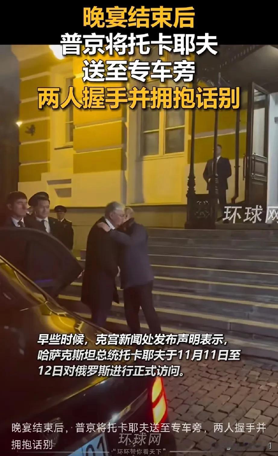 普京太把托卡耶夫当回事了: 11月11日晚宴结束后,普京亲自把托卡耶夫送到车上,并主动拥抱托卡耶夫表示友好: 但是,与特朗普进行“中亚五国与美国”会谈并签署合作协议后的托卡耶夫,心里早已有了自己的打算…… 其实,现在的中亚五国,能不走到公开反俄的立场上就已经算不错了,