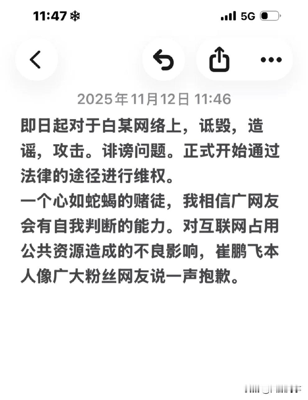 老狗发文,即日起对恶意诋毁诽谤,开始维权! 即日起对于白某网络上,诋毁,造谣,攻击诽谤问题,正式开始通过法律的途径进行维权。 一个心如蛇蝎的赌徒,我相信广网友会有自我判断的能力,对互联网占用公共资源造成的不良影响,崔鹏飞本人像广大粉丝网友说一声抱歉。