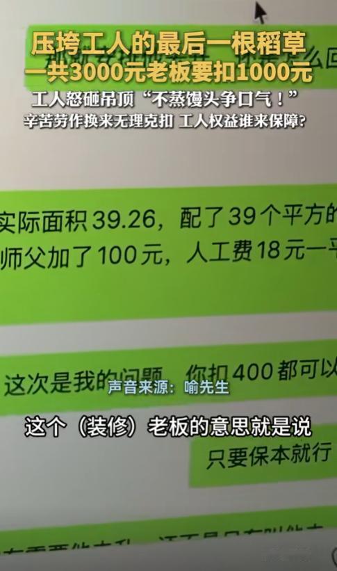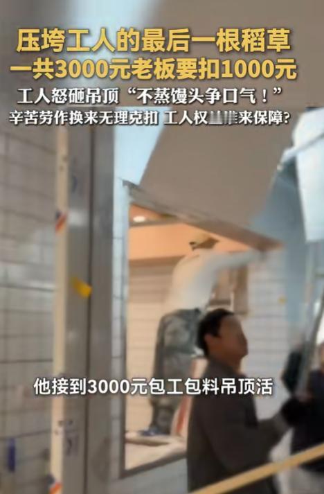 太缺德了!”近日,湖北武汉,一老板找人做吊顶,谈好了3000元包工包料,工人从早上8点一直忙到凌晨1点才做完,可结账时,老板却说做的不合适,坚决要扣1000元,工人气不过,将装好的吊顶全拆了。网友:太欺负人了! 老板和工人因 1000 元扣款闹得两败俱伤,类似事件在多地也曾有发生。河北唐山,有业主以工程质量欠佳为由,扣装修工 800 元,工人沟通未果,盛怒之下砸毁吊顶。无独有偶,烟台亦现类似情形,装修工因业主拒付尾款,愤而拆除已安装的设施。 这次武汉的纠纷发生在一家生鲜超市,老板陈先生为了尽快开业,找了喻先生、老周和小杨三名农民工做吊顶,双方口头约定 3000 元包工包料,没签订书面协议,也没说清具体的验收标准。清晨八点,三名工人便赶赴现场开工。 他们争分夺秒,一刻未歇,历经 17 个小时的高强度作业。直至次日凌晨一点,才圆满完成全部施工任务。 工程完工后,工人悉心清理现场,将废料妥善打包,还把平整吊顶的视频发给陈先生。本以为成果能获认可,不料回复却是扣除 1000 元,仅支付 2000 元。 陈先生给出的理由是吊顶拼接处有缝隙不好看,但这个缝隙只有两三毫米,不凑近看根本发现不了,也不影响正常使用。 纠纷发生后,当时在场的包工头想着化解矛盾,主动提出自己承担 300 多元的损失,建议陈先生按 2700 元结算,既照顾双方利益,也能让工人拿到基本报酬,但这个提议被陈先生坚决拒绝。 喻先生等人赶紧联系陈先生,说可以回去调整缝隙,却遭到强硬拒绝,之后发微信协商愿意掏 200 元材料费弥补,结果发现被拉黑,电话也打不通。 沟通彻底中断后,三名工人觉得自己 17 小时的辛劳不能白费,材料成本也没收回,就回到超市把刚装好的吊顶全部拆了下来,拆下来的材料整齐堆在门口,没有损坏超市里的其他东西。 此事令陈先生原本规划的开业日期化为乌有。半个月房租与铺货延误成本相叠加,他累计损失近两万元。与此同时,那三名辛勤劳作的工人,却未得到分文工钱。 民警接到陈先生报警后介入调查,调取了超市门口的监控,查看了工人发来的完工视频,还分别询问了双方情况。最终民警认定,陈先生单方面扣除 1000 元没有合理依据,属于违约行为,而工人拆除吊顶的行为也存在相应风险。 经民警后续调解协商,双方签订了调解书,陈先生再支付 500 元给工人,工人不再追究相关责任,拆除后的吊顶残骸由陈先生自行处理。 民警介绍,工人拆除吊顶的行为可能构成故意毁坏财物,而陈先生一次性扣除三分之一报酬的做法也不符合相关规定,此次纠纷的根源还是在于口头约定不规范,双方缺乏有效沟通和互相尊重。 这起事件也让不少人意识到,装修行业中口头约定的隐患,只有把关键条款说清写明,遇到问题时互相体谅协商,才能避免类似两败俱伤的结果。