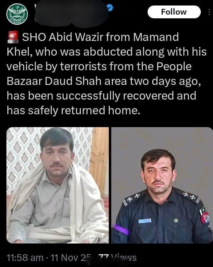 几天前被巴基斯坦塔利班绑架的巴基斯坦警员已死亡!巴基斯坦方面声称他已从叛军手中获