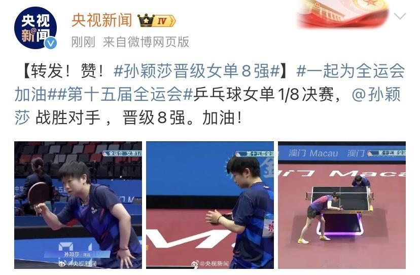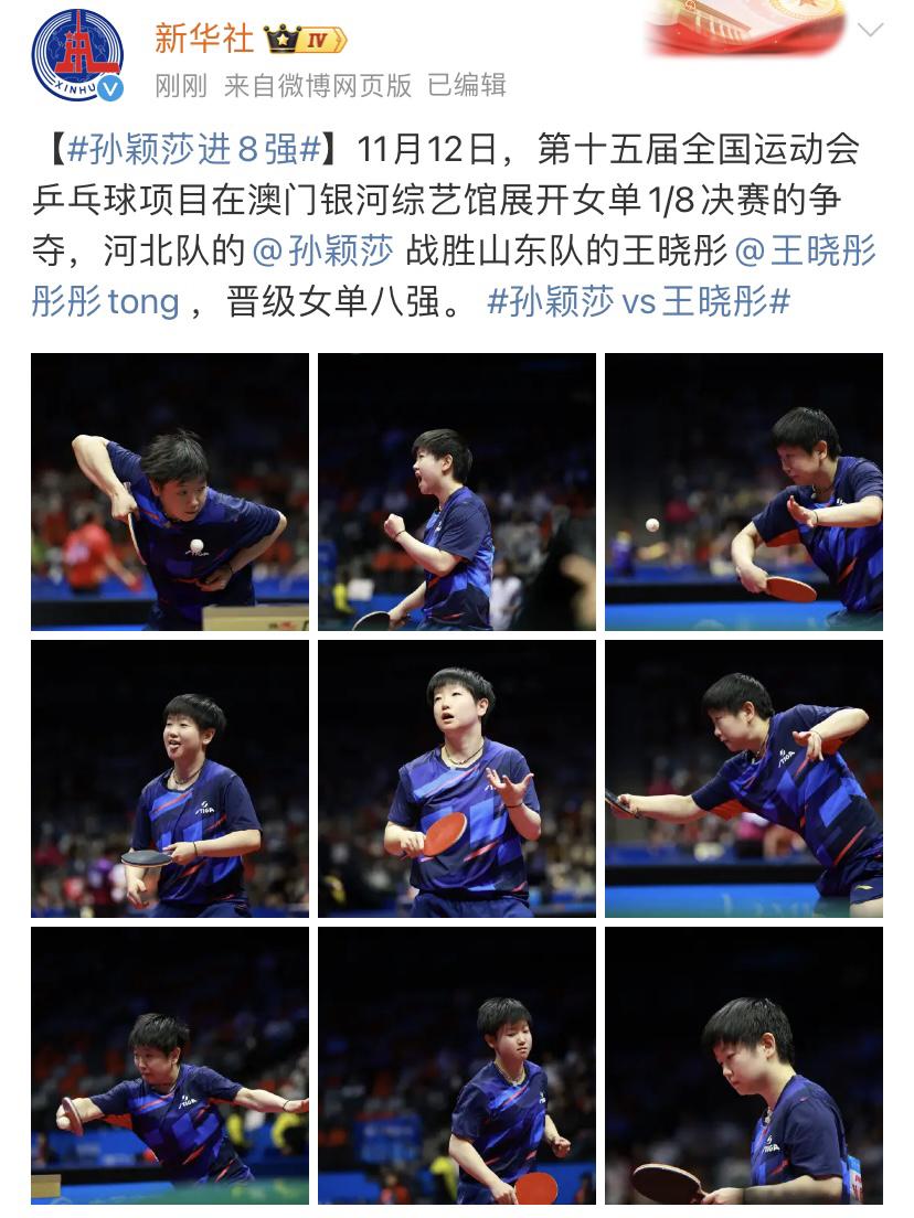 孙颖莎4-1王晓彤,晋级女单八强, 郭焱说:王晓彤前三板没有任何的机会。 全运会女单1/8决赛, 莎莎4-1王晓彤,顺利晋级到女单八强。 又看到了莎莎在赛场上的可爱俏皮, 丢球之后吐舌,摆手,都超级可爱。 莎莎今天的比赛,很坚定, 郭焱说孙颖莎准备的也非常细致的, 每一个细节,包括前三板的衔接, 发球的衔接,扣的都非常紧, 所以说对于王晓彤来讲,今天确实打的有点吃力。 前三板,落点,衔接都是全面压制。 王晓彤前三板没有任何的机会, 就是想办法扛住,只有招架的意思。 前三板上没有喘息的机会,想进入相持也非常难。 王晓彤的发球只要有一点冒头,一点点偏差, 就会被孙颖莎压制, 所以这也是孙颖莎给大家的压力, 不允许你出一点错。 虽然第四局丢掉,也是自己的失误给对方的分数, 并不是对方突然会打了, 第五局上来,还是全面压制, 快速的结束比赛。 孙颖莎(河北队)4-1王晓彤(山东队)【11-4,11-5,11-7,8-11,11-4】 下一轮,莎莎对战刘斐和陈熠的胜者。