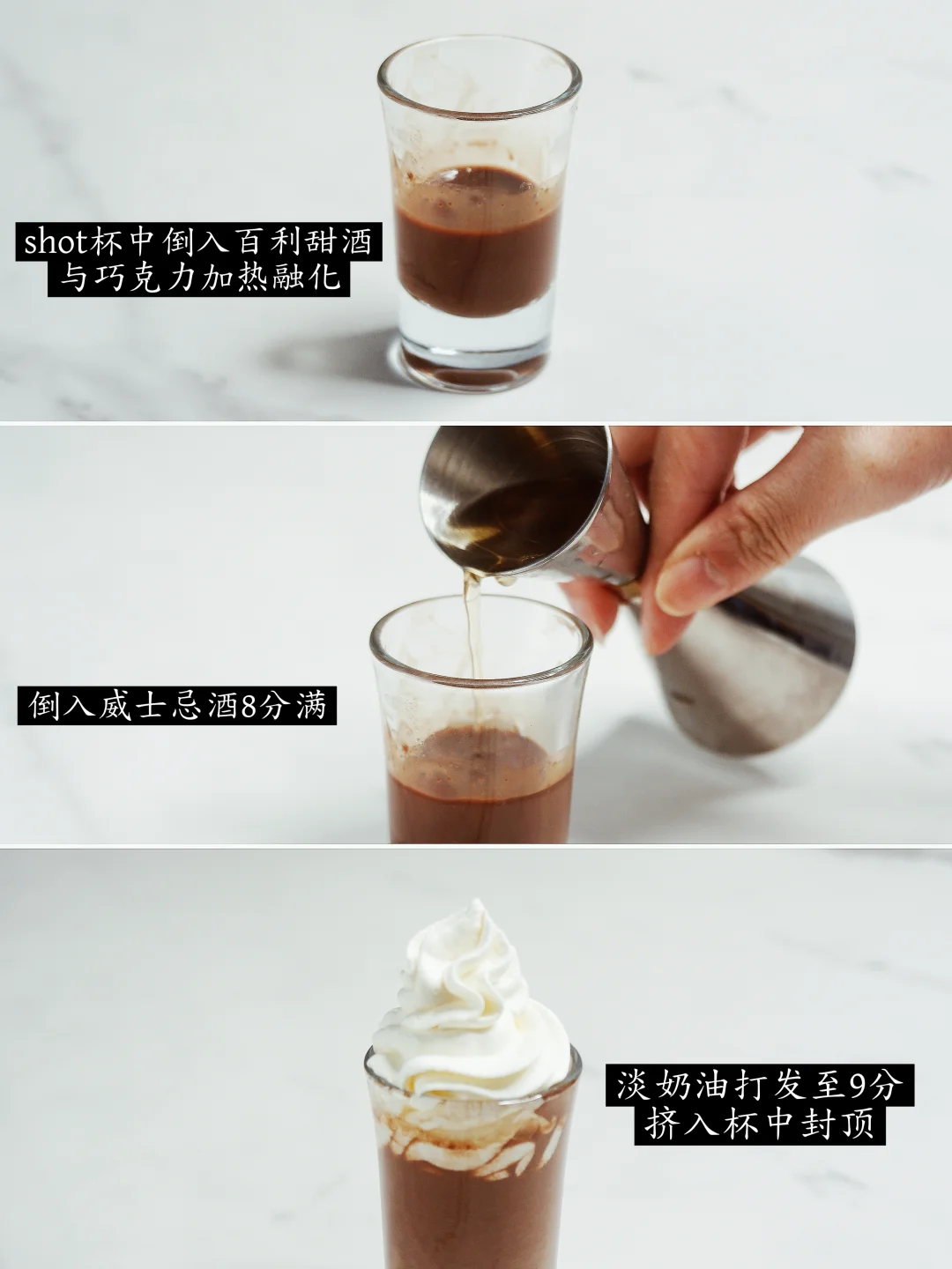 哈喽哈喽[萌萌哒R]酒鬼宝宝们,忙碌的一周急需酒精来解乏,一口一杯的奶酒shot,风味也都不一样。不知不觉就微醺上头啦[亲一个R] · 🍒摩卡威士忌:P4 巧克力➕百利甜酒➕威士忌➕淡奶油 🍹液体提拉米苏:P6 百利甜酒➕威士忌酒➕咖啡利口酒➕淡奶油 🧉酒心蛋糕:P8 伏特加➕咖啡利口酒➕淡奶油 ‼️调饮步骤在图片上↑ ⚠️未成年人请勿饮酒