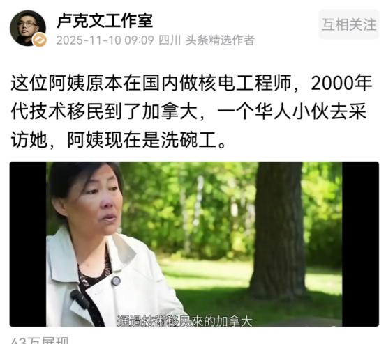 做核电的专家跑到加拿大,哪怕专业降级做个电工也行啊,怎么着也是专业对口。跑过去洗碗,专业太不对口了。 核电这玩意儿,那可是大国重器,一个反应堆的图纸,一根燃料棒的配方,都是无数人拿命和智慧堆出来的金山。能在这行里当上专家的,脑子里的东西绝对比黄金还贵,怎么就甘心让这些宝贝蒙尘,去刷盘子了呢?有人可能会说,人家那是追求自由,是向往国外的生活。 可这话说出来,连他们自己信吗?如果真觉得洗碗跟搞核电没区别,那为什么硅谷的精英们挤破头都想进大厂拿高薪?为什么华尔街的交易员为了一个位子能打得头破血流?说白了,人往高处走,水往低处流,这是刻在骨子里的本能,谁也别装清高。 你想想,一个能在核电站里跟一堆精密仪器打交道的人,他对世界的认知,对自我价值的定位,肯定跟普通人不一样。他习惯了那种运筹帷幄、掌控巨大能量的感觉,那是一种智力上的优越感和成就感。这种东西,是刷多少个盘子都换不来的。 让他去洗碗,就好比让一个习惯了指挥千军万马的将军去当伙夫,每天就琢磨着怎么把土豆丝切得更细一点。 这种落差,不是心理素质好就能克服的,那是一种对自我价值的彻底否定。他每天站在水池前,闻着洗洁精的味道,脑子里会不会闪过曾经画过的那些复杂的核回路图?会不会想起自己曾经亲手调试过的那些价值连城的设备?这种折磨,比身体上的劳累要痛苦一万倍。 再说说加拿大那边的情况。人家加拿大确实缺电工,尤其是高级电工,那工资待遇和社会地位都不低。一个核电专家,哪怕降级去做个电工,好歹也算专业沾边。 核电站的电路系统,那复杂程度远超普通民用建筑,他能看懂那些图纸,懂得高压电的原理,上手肯定比一般人快。这叫降维打击,虽然委屈了点,但至少没把老本行全扔了。可他偏偏选了洗碗,这就更让人想不通了。 唯一的解释就是,他可能连电工的资格证都考不下来,或者,他已经彻底失去了再跟自己专业打交道的勇气。前者说明他的知识体系可能已经过时,或者不符合加拿大的标准;后者则说明他的精神已经被彻底击垮了,只想找个不用动脑子的活儿混日子。无论哪一种,都挺可悲的。 这背后,其实藏着一个更深层次的问题,那就是人才流失的残酷现实。一个国家辛辛苦苦培养出来的顶尖人才,最后却跑到别国去干最底层的活儿,这不仅仅是个人选择的悲剧,更是国家资源的巨大浪费。培养一个核电专家需要多少年?从本科到博士,再到实际项目里摸爬滚打,没有二十年根本出不了师。这二十年里,国家投入了多少教育资源,多少科研经费?结果呢?人家一句“我不干了”,然后就去国外刷盘子了。这笔账,怎么算都亏得慌。而且,这些专家脑子里装着的技术机密,虽然他们本人可能不会主动泄露,但谁能保证他们不会在某个不经意的瞬间,因为一顿饭、一杯酒,就把一些关键信息透露出去呢?这种潜在的风险,才是最可怕的。 更讽刺的是,那些鼓吹“国外工作无贵贱”的人,往往自己就活在最讲究贵贱的圈子里。你看看美国总统大选,那竞争激烈程度,跟古代皇子夺嫡有啥区别?为了一个位子,候选人花掉的钱都够建好几座核电站了。 为什么?因为那个位子代表着权力,代表着能调动巨大的社会资源。特朗普当总统的时候,他身边人随便跟着他做个投资,都能轻松赚得盆满钵满。这种影响力,是洗碗工能比的吗?洗碗工再努力,一天也就是洗几百个盘子,工资是死的。 可总统的一句话,就能让一个行业的股价上天入地,这其中的能量差距,简直是天壤之别。所以,别再拿“工作无贵贱”这种话来骗人了,在现实面前,这种论调苍白得就像一张废纸。 说到底,那些跑到国外洗碗的核电专家,他们心里真的不后悔吗?我敢打赌,夜深人静的时候,他们肯定会后悔。他们后悔的,可能不是当初出国的决定,而是后悔自己为什么没能坚持下来,为什么没能把自己的才华用在正道上。 他们或许会想起在国内时,同事们对他们的尊敬,领导对他们的器重,那种被需要、被重视的感觉,是在异国他乡的后厨里永远也找不到的。他们或许也会看到新闻里,中国的核电技术又取得了新的突破,又建成了新的核电站,那时候他们的心里,会是什么滋味?是羡慕,是嫉妒,还是彻底的失落?这种复杂的情感,会像一根毒刺,深深扎在他们心里,一辈子都拔不出来。