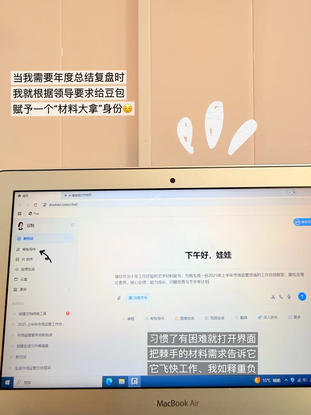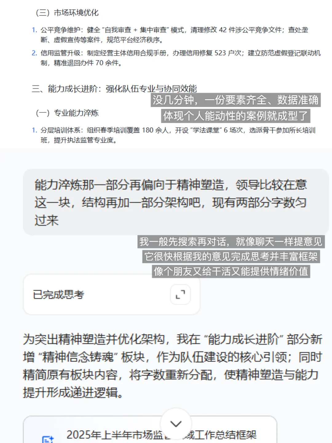 这简直是个人知识库,当我需要复盘某项工作时,我直接以素材为模板,给豆包安排一个“十年文字材料秘书“人设,常见材料统统拿捏。