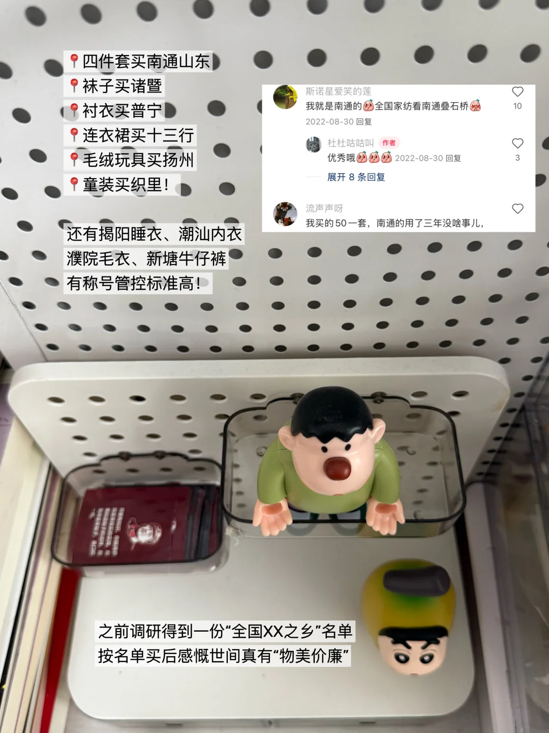 买东西看属地,之前调研得到一份“全国XX之乡”名单,按名单[清单R]买后感慨世间仍有“物美价廉”:四件套买南通、袜子买诸暨、衬衣买普宁、连衣裙买十三行、毛绒玩具买扬州、童装买织里!还有揭阳睡衣、潮汕内衣、濮院毛衣、新塘牛仔裤!有称号管控标准高!