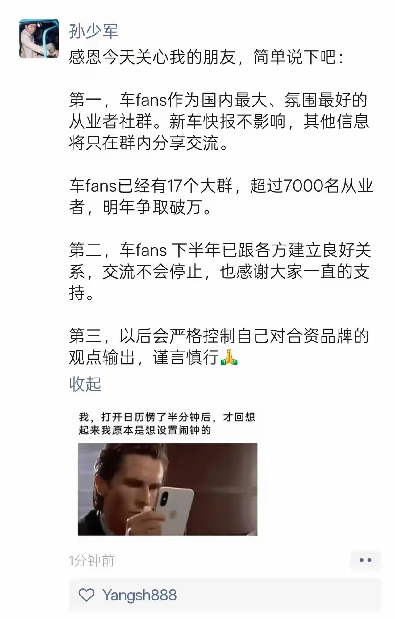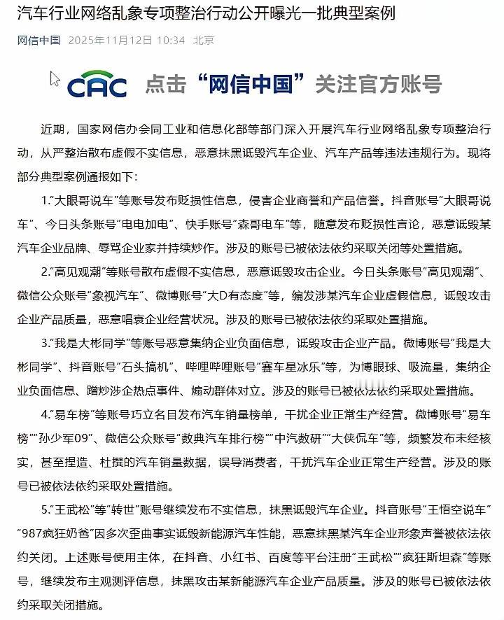 “我是大彬同学”、“赛车星冰乐”、“石头搞机”这些账号被网信办列为汽车行业网络乱象整治的一批典型案例,这个我一点都不意外,毕竟他们的言行倾向真的很明显,但孙少军也上“名单”了,这个我倒是比较意外的,印象中,孙少军好像很少拉踩什么,观点中规中矩,主打一个不惹事上身,但从孙少军的回应中,似乎能猜到他“上榜”的原因。 11月12日,国家网信办等部门公开了汽车行业网络乱象整治的一批典型案例,称多个平台的账号因发布贬损信息、编造虚假内容、集纳负面信息炒作、伪造销量榜单、“转世”账号持续抹黑等行为,被依法依规处置,整治重点针对损害车企声誉、干扰经营、误导消费者的违法违规网络行为。孙少军09也在整治的名单上。 对此,孙少军回应说,后续他会收敛对合资品牌的观点输出、谨言慎行。 或许正是此前对合资品牌的相关言论,让孙少军被纳入了此次整治范围。这次事件也算是给汽车行业的内容创作者提了个醒——在行业规范收紧的背景下,言论的边界感确实要掂量好。
