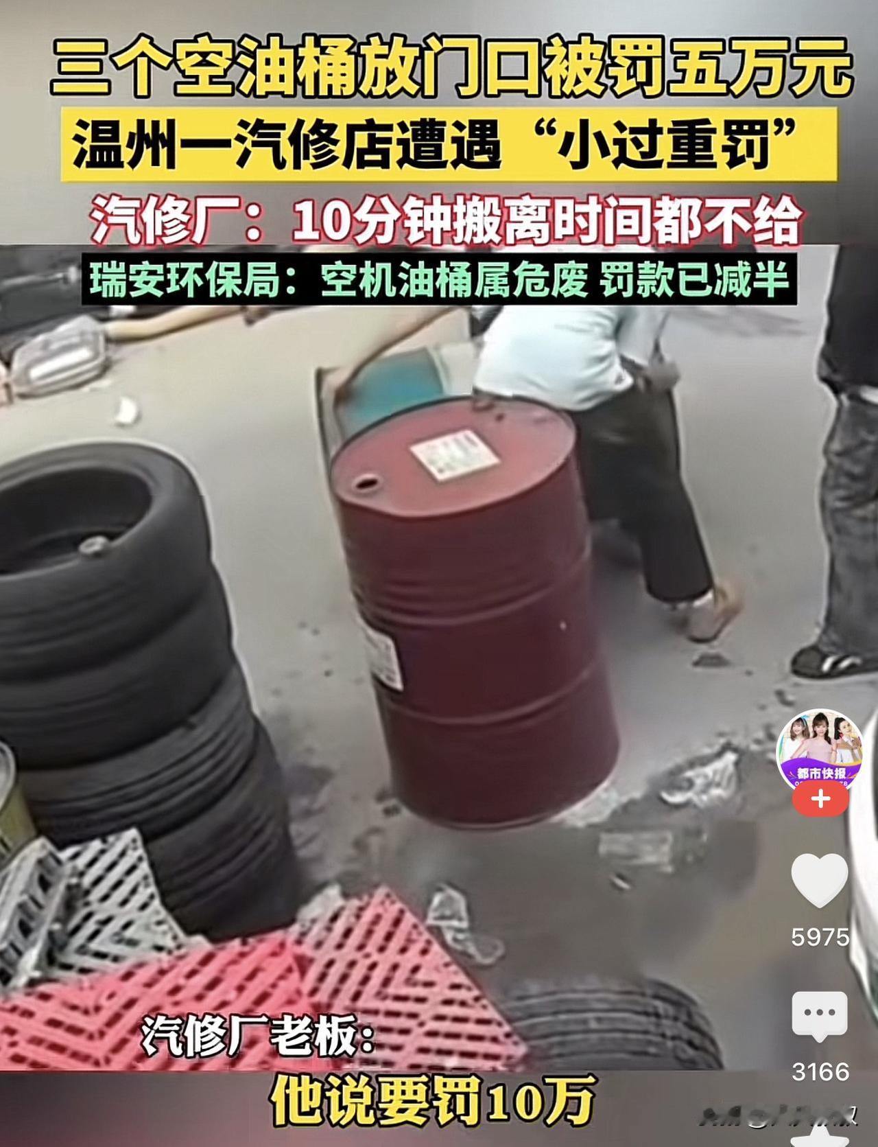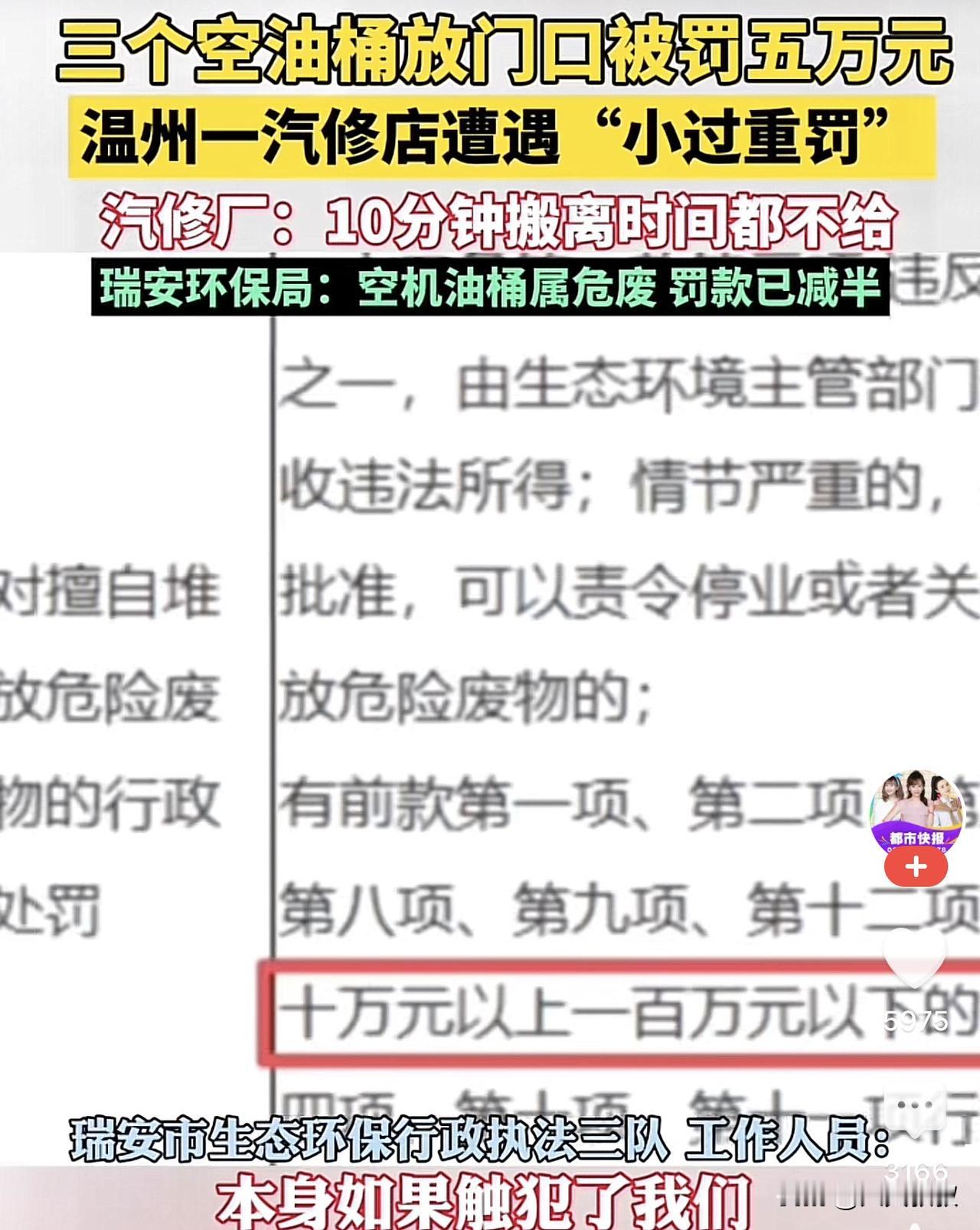 浙江温州,一汽修厂老板把三个废油桶放在门店外,不料却被环保局工作人员发现,于是工作人员打算处罚汽修厂,老板见状表示要把油桶拿走,结果却被工作人员拒绝,对方要求老板必须立即签字,不然就罚款10万,无奈,老板只能乖乖签了字认可罚款5万,事发后,老板曝光了此事。 事发后,网友却分成了两派,有的表示,就是一个小小的修理厂,你罚人家5万,人家要挣多久才能挣出这5万来,这是小过重罚。 还有网友表示,处罚的一点问题没有,你这个空桶是存放废弃油的,废弃油本来就是易燃易爆物体,你乱放的话,一点出事,左邻右舍跟着倒霉之外,相关部门负责人也要跟你一起倒霉,所以人家罚你没商量。 也有网友说,违法了就要重罚,不然的话,起不到以儆效尤的作用。 其实,老板自己也说,这三个桶是存放废汽油用的,那么,按照固体废物污染环境防治法规定,擅自倾倒、堆放、丢弃、遗撒工业固体废物,或者未采取相应防范措施,造成工业固体废物扬散、流失、渗漏或者其他环境污染的,处五万元以上二十万元以下的罚款。 本案中,汽修厂因堆放的是空桶,并未造成环境污染和恶化,这种算情节轻微,对于情节轻微,汽修厂如果认为环保局处罚的还是过重,其实是可以向法院起诉的。 毕竟,行政处罚法规定,设定和实施行政处罚必须以事实为依据,与违法行为的事实、性质、情节以及社会危害程度相当。 所以,如果汽修厂认为自己的行为算是小过,但是环保局却以重罚,那么,就是说自己的违法行为并没有达到恶劣的程度,就是违法后果、危害性和处罚不一致,那么,是可以申请法院来撤销处罚的。 当然了,门口堆放空油桶,还是有相当的安全隐患的,毕竟,一旦因为电焊、无齿锯火花引爆油桶,大家口诛笔伐的就不仅仅是这个小修理厂了,监管部门的不作为,也会一起声讨。 不管怎么说,如果修理厂不服这个处罚结果,一定要在法定期限内提起行政诉讼,那么,最后是由行政部门出示处罚的合理和合法性,如果证明不了处罚的合理性,法院是会进行撤销,并要求行政部门重新做出认定的。 对此,你对本案有什么看法? —————————— 关注我,带你评析法律热点,关注冷暖人生。 文章原创,抄袭必究