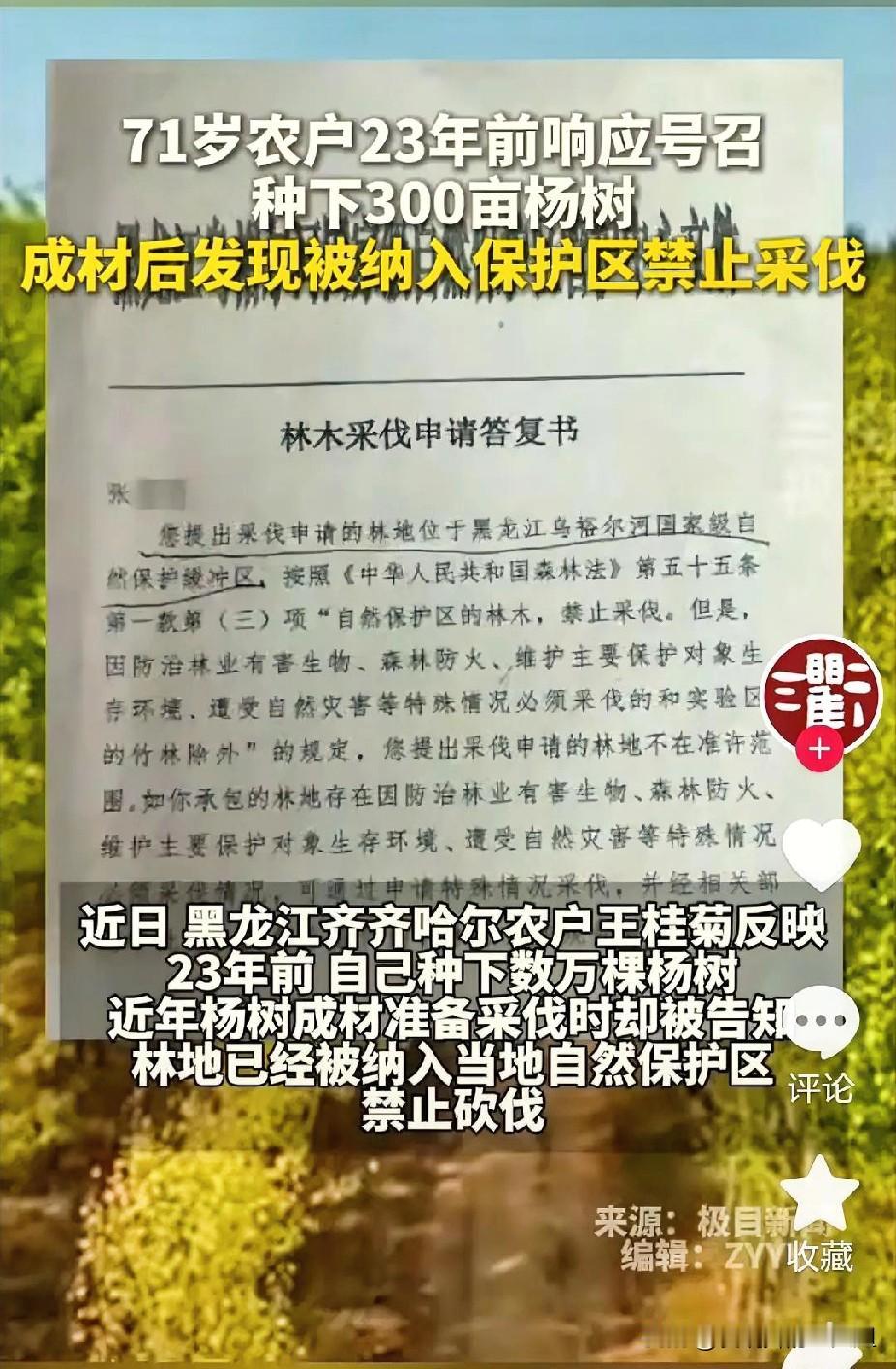 黑龙江,71岁农户23年前响应号召种下300亩杨树,成材后却被纳入保护区禁止采伐,一分补助也没有给农户!农户:“上哪里说理去!我20多年的投入,100多万白搭了!”官方回应:正积极协调此事! 这事儿发生在齐齐哈尔富裕县富海镇,王桂菊老人2002年在村委会动员下签了25年造林合同,把360亩河套地变成了杨树林。合同白纸黑字写着“林木成熟后可申请采伐”,还特别注明遇到国家政策调整要按规矩补偿。谁能想到好不容易把树苗养成胸径三四十厘米的大树,去年去办采伐证时才发现林子早就被划进了乌裕尔河国家级自然保护区缓冲区,根据《森林法》直接禁止采伐。 老人这二十三年的付出看得见摸得着,第一年政府供树苗,第二年自己掏钱补种,每年除草施肥打药剪枝,投入的百万积蓄像树叶一样埋进土里。更心酸的是老伴早逝,她拖着患有股骨头坏死的身体巡护林地,十多年前因洪水倒伏批采过几棵树,之后再没产生过收益。如今3万棵杨树成了“生态钉子户”,合同明年4月就到期,土地使用权面临收回,二十年心血可能真打了水漂。 当地林草局的回应透着政策与现实的割裂。一边咬定林地属于“三北工程”而非“退耕还林”,所以领不到补贴;另一边承认保护区划设确实没有补偿规定。可合同里明晃晃写着“退耕还草(林)地”字样,当年政策执行时的模糊地带成了今天推诿的借口。生态保护固然重要,但让个体承担全部成本,这种“一刀切”的做法寒了响应号召者的心。 类似情况在其他地方也有探索性解决方案。比如云南部分自然保护区尝试过生态赎买、公益岗位安置等方式平衡保护与民生。黑龙江本地也强调科学绿化要“兼顾生态和经济效益”,鼓励发展林下经济。王桂菊的案例启示我们,生态政策需要更精细化的补偿机制。既然树木的生态价值已被社会共享,那么养护成本就不该由个人独担。 各位读者你们怎么看?欢迎在评论区讨论。