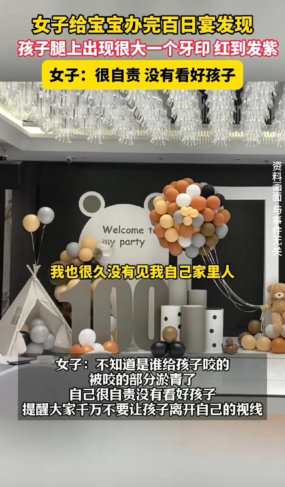 “万万没想到啊!”甘肃一年是给宝宝办百日宴 ,结果发现孩子腿上有牙印 ,红到发紫 。女子:很自责,没有看好孩子 。 百日宴当天 ,女宝妈的,娘家人来了,很久没见了 。妈招待娘家人,孩子由奶奶看护 。他表示当天有很多人抱过孩子,不知道是谁咬的 。宝妈也很自责,没有看好孩子,让孩子受了伤 。 此事引起网友有热议,有网友说:“有可能当时来的小朋友咬了一口,觉得小宝宝特别可爱。” 还有网友说:“我家小朋友4个月的时候,也被我朋友家的小孩腿上咬了一口,当时就嗷嗷大哭,我查看半天都没发现问题,直到晚上给小宝洗澡才发现。” 也有网友说:“我女儿百天办酒席的时候,我没去酒席,孩子没离开我视线,就跟我在屋里,吃喝婆婆给我送进来,就怕孩子有啥问题。” 真是要小心,不要离开孩子。孩子小,不会表达 。这种情况只能吃哑巴亏 。 对此事,你有什么看法?