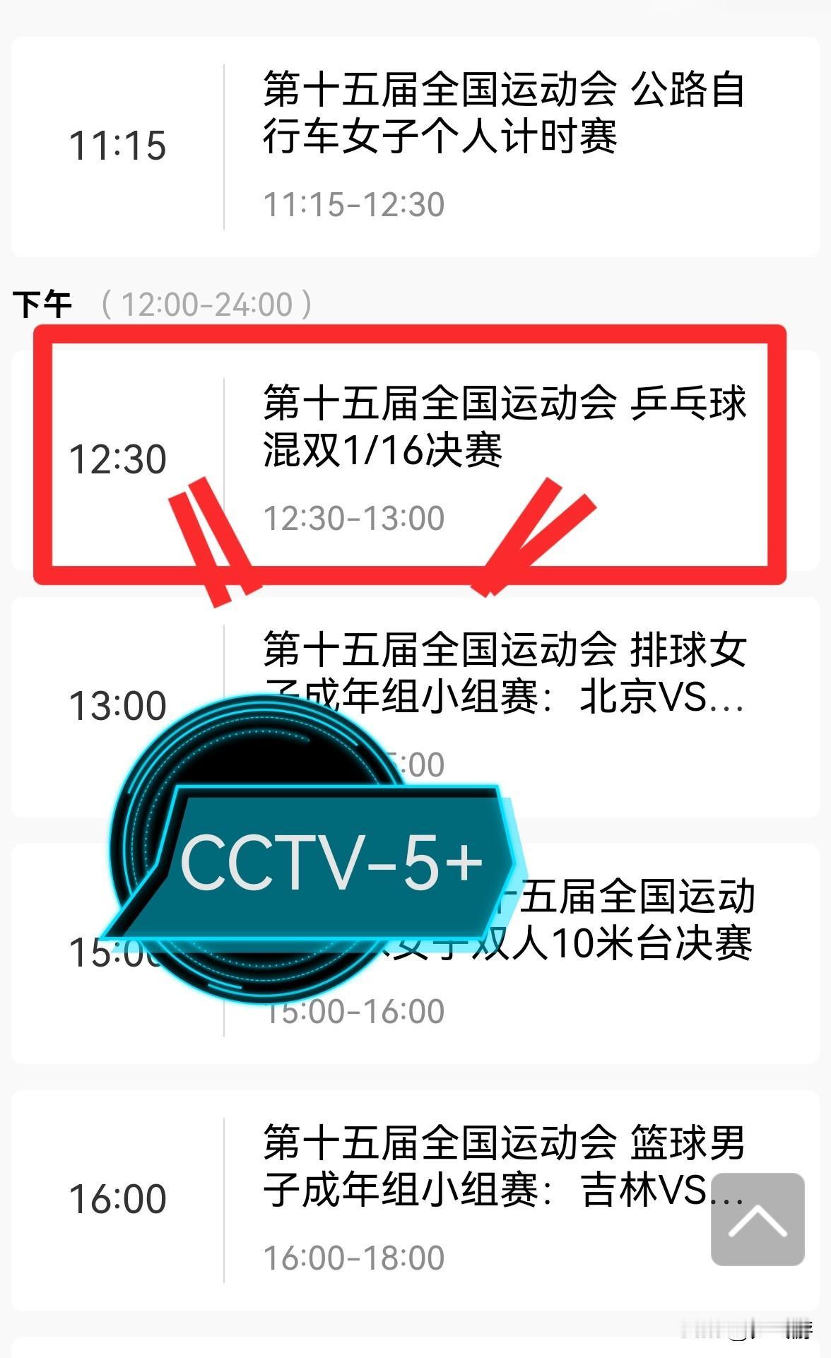 🏓全运会•混双1/16决赛将于今天(11.7周五)12:30🕧和20:30🕣两个时间段进行。 乒乓球迷们别忘了关注比赛,为自己的家乡队加油! ~~~~~~~~~~~~ [微风]“午间场”和“晚间场”分别进行6场比赛,6张球台同时进行(具体安排见以下图片)。 [微风]CCTV-5+ 频道直播,但时间只有半小时:12:30~13:00(见以下图片) [微风]您也可以通过央视频、咪咕视频等平台收看比赛直播。 ~~~~~~~~~~~~ (图片为赛程安排和央视直播安排)