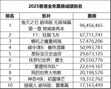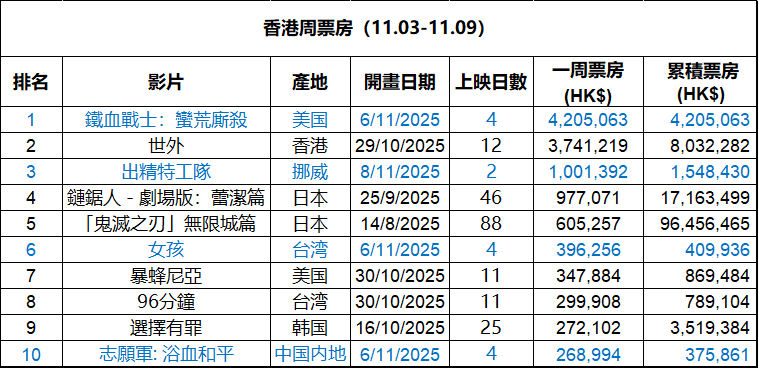 2025年第45周 :1.《铁血战士:杀戮之地》开画夺冠;2. 动画《世外》累计票房破800万;3.《链锯人 剧场版:蕾塞篇》累计票房超1700万排名年度第10;4.《鬼灭之刃 剧场版 无限城篇 第一章 猗窝座再来》累计票房9645万超《侏罗纪世界》排名香港影史第16。(数据:香港贸发局)