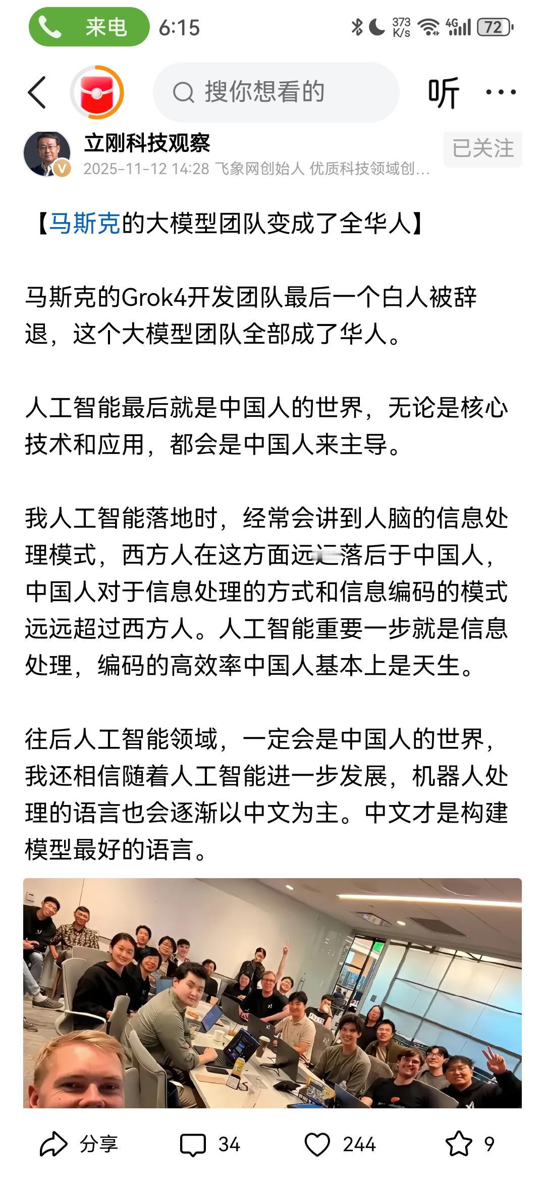 项立刚爆料说,随着马斯克辞退最后一个白人,现在人工智能大模型Grok4的研发团队,其成员现在竟然已经全部都是华人。 这个结果恐怕很多人都没有预料到,在人工智能大模型这一领域,华人的竞争力竟然这么强,直接对其他族群形成了碾压性的优势。 项立刚对此进行了分析,说之所以如此,本质上是因为中国人使用的是汉字,汉字是一门编码效率最高的语言,英文是一个单词表示一个意思,词汇量现在已经飙升到超过100万,每一个学科领域都有自己的专属词汇,如果是外行人,哪怕使用的同样是英语,看到之后也会两眼一抹黑; 但是中文不同,中文是用几千个汉字,直接就能组合成全新的意思,然后还能让人大概看懂,就算是那些专业词汇,我们普通人看了,只要稍微学习下,也能很快理解其大概含义。这样的编码效率在全世界所有语言中都是独一份的! 而人工智能最重要的一步就是信息处理,在这一点上我们的优势是天生的。 所以,未来人工智能的大时代,必定将由中国人主导,实际上现在就几乎已经是中国主导了,毕竟无论中美,最主要的人工智能研究人员,都是华人。