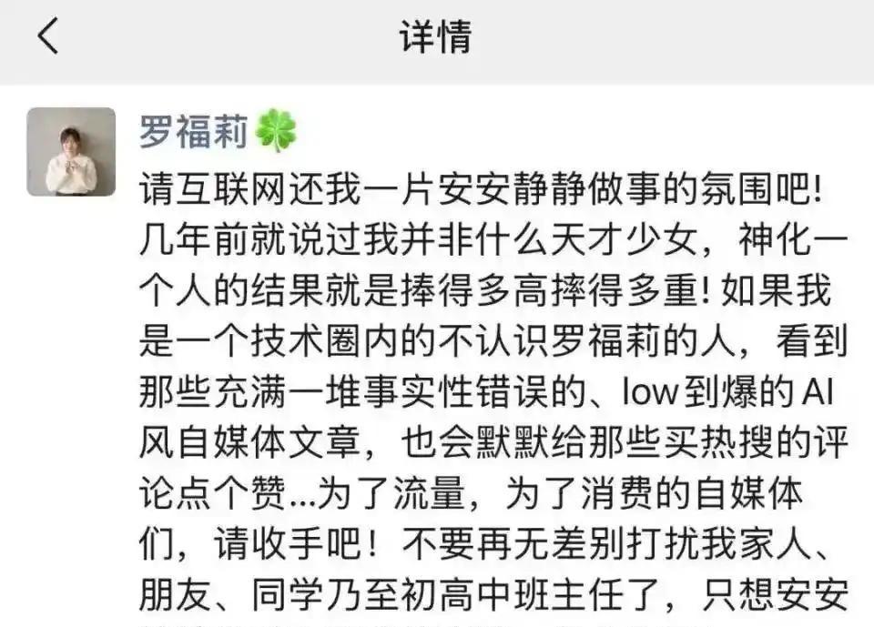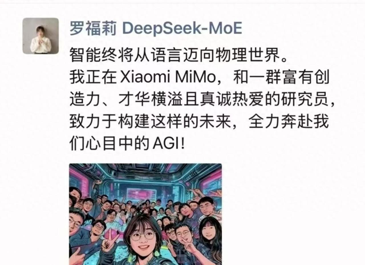 小米AI新成员曝光!天才少女转战轻量化赛道背后真相 @椰子娱乐 :2025年11月12日,前DeepSeek研究员罗福莉发朋友圈宣布加入小米,负责MiMo团队工作。她1995年出生在四川宜宾,大学时从师范转学计算机,后来读研进了北大,搞语言模型研究。加入阿里后做了多语言模型VECO,后来去私募公司做深度学习,参与过性价比高的DeepSeek-V2模型开发。 小米AI一直不跟着同行搞大参数竞赛,而是做小参数模型。罗福莉擅长的MoE架构正好能优化手机、汽车等设备的本地AI功能。之前网上传雷军用千万年薪挖她,但双方都没承认。直到今年10月她跟小米联合发论文,才坐实了入职消息。 罗福莉朋友圈说要让智能从语言扩展到物理世界。小米2025年计划投75亿研究AI,建大规模GPU集群。她的加入可能是为小米生态里的家居、手机、汽车提供更精简的AI解决方案。这事儿说明AI竞争现在不光拼参数,还得看怎么落地实用。