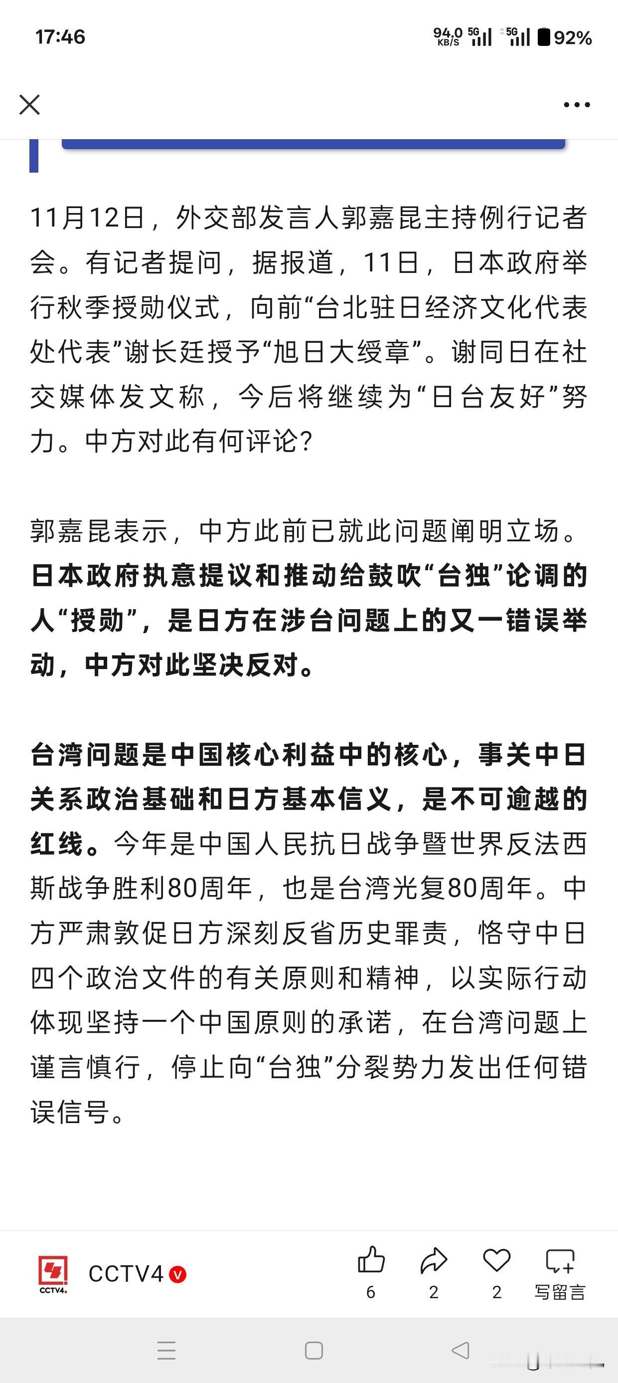 近日,小本子频繁挑衅,遭我国多部门霸气回怼,小日子好日子过够了吧? 小日子政府和首相,近日诸多表态涉及台海,动作频频,大放厥词,我国霸气回怼,小日子是好日子过够了,希望,咱家能够坚决予以反制,不要留任何情面,无论是台海还是小日子,全国人民的态度,应该都是坚决的,这么多年来,我相信,全国人民大多都是激进派,都希望能够迅速解决这两个问题,如今,小本子“玩火”,那就看看它能怎么蹦跶! 大家怎么看?评论区说说你的看法!