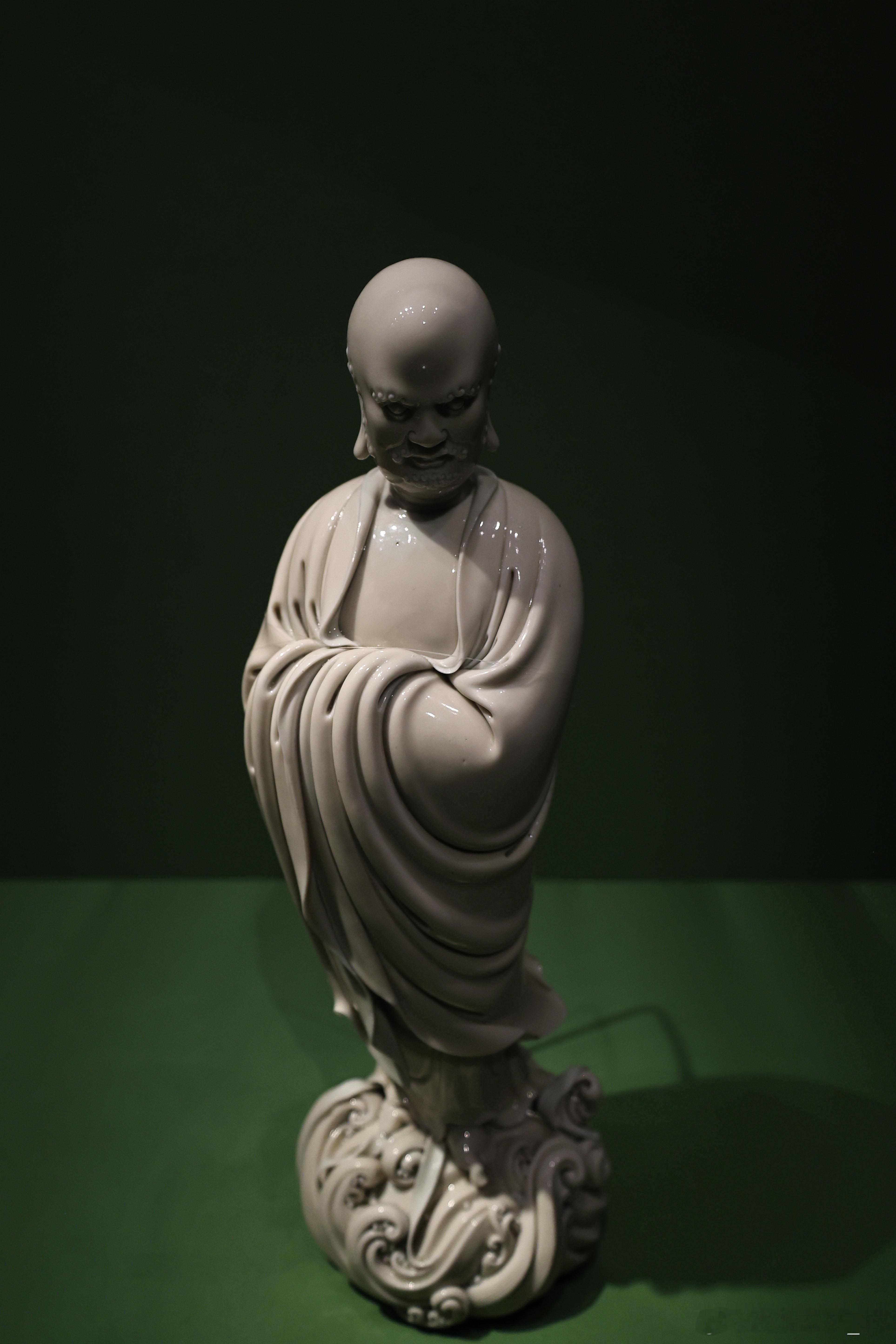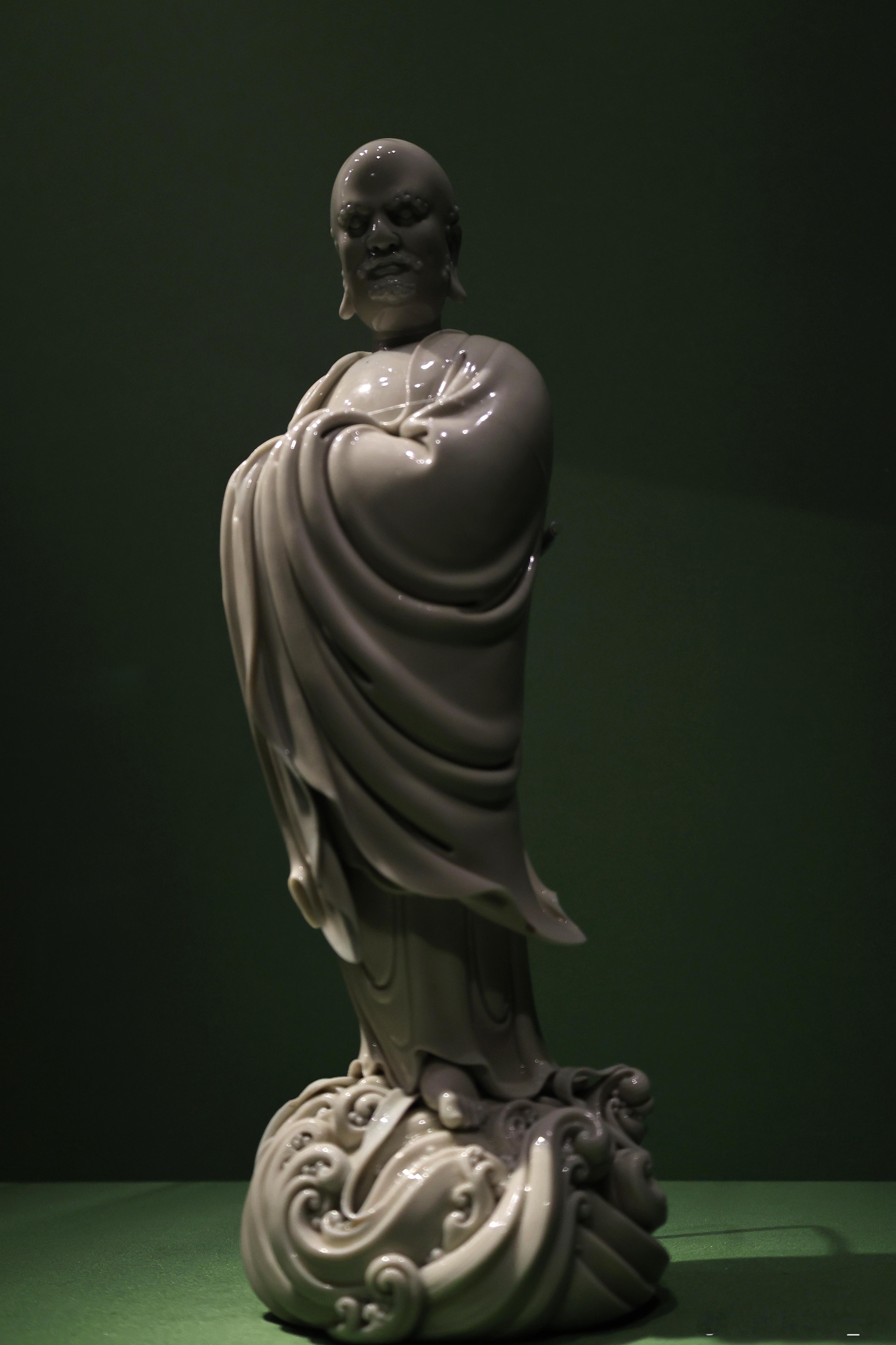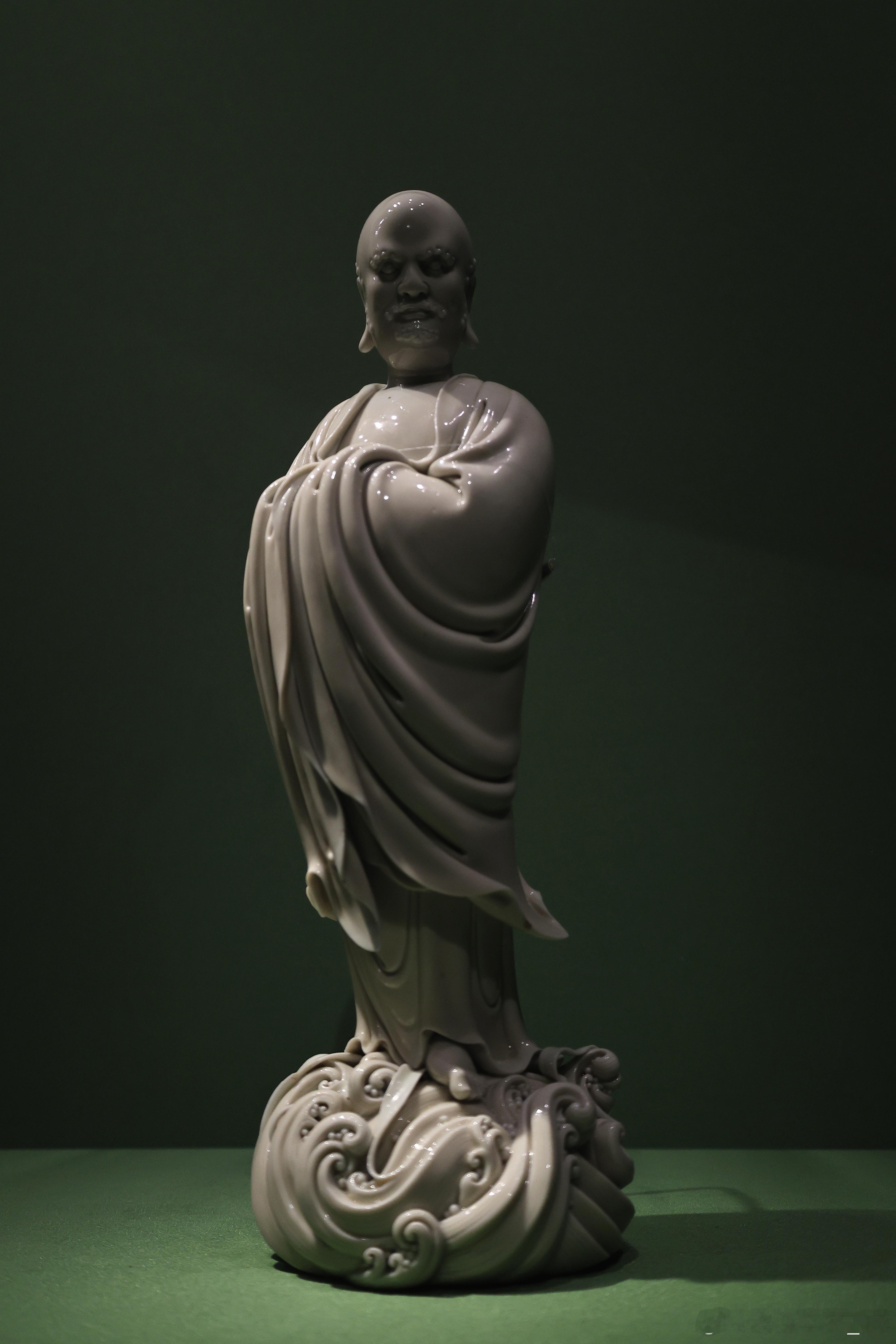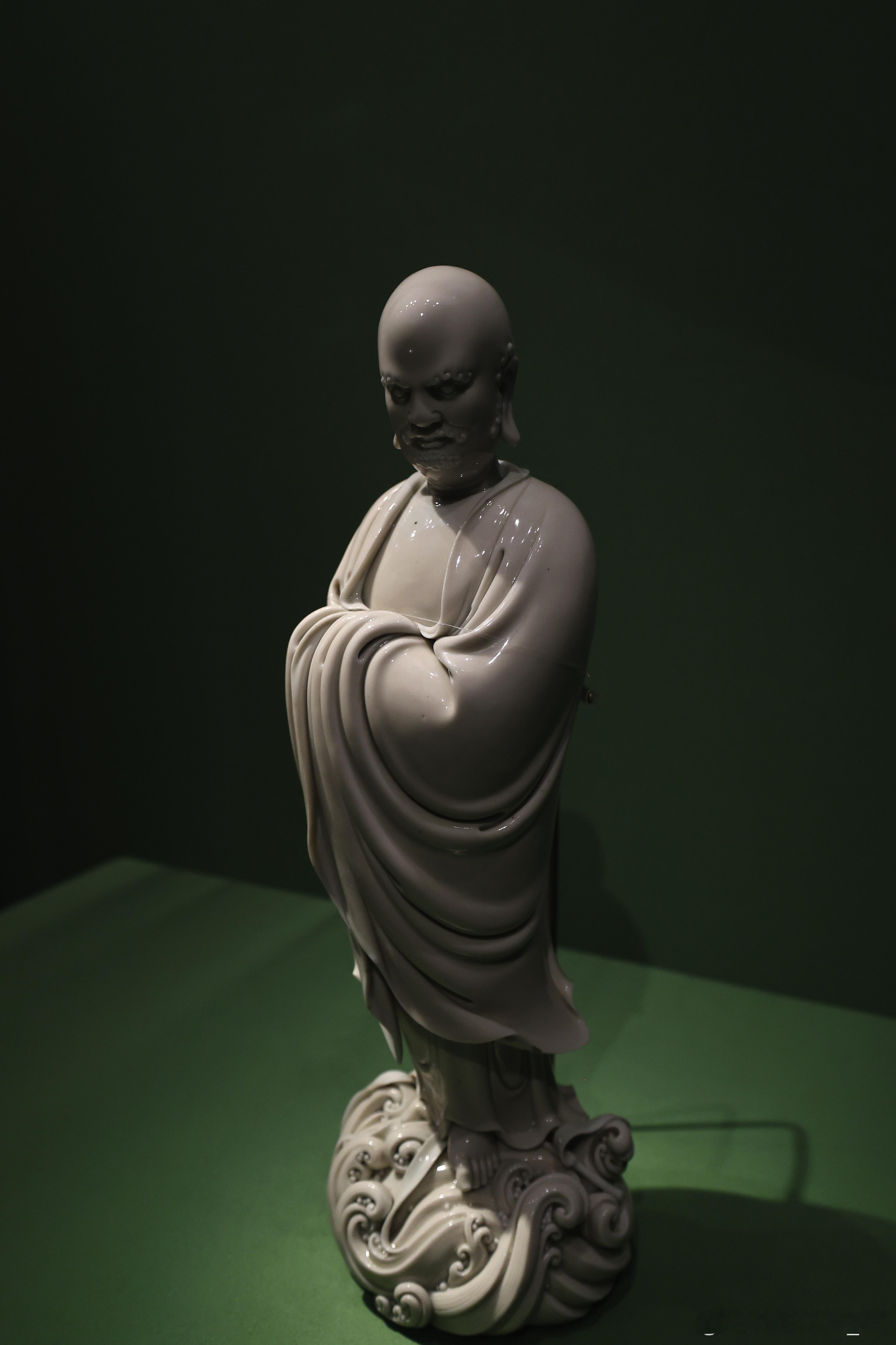 德化窑白釉达摩立像 明 (公元1368-1644年)故宫博物院藏清宫旧藏器,原存热河行宫。达摩身披袈裟,头部微低,鬓发卷曲,广额深目,双眼凝视前方,双手合抱于袖中,赤足立于苇叶之上,作疾驰渡海状。此塑像通体施白釉,釉色洁白,像背后钤方形阴文篆书"何朝宗印"。此塑像为明代德化窑作品,雕工精湛,惟妙惟肖,刻画出艰苦涉险、坚定无畏的高僧形象,是德化窑经典代表作品之一。 展出