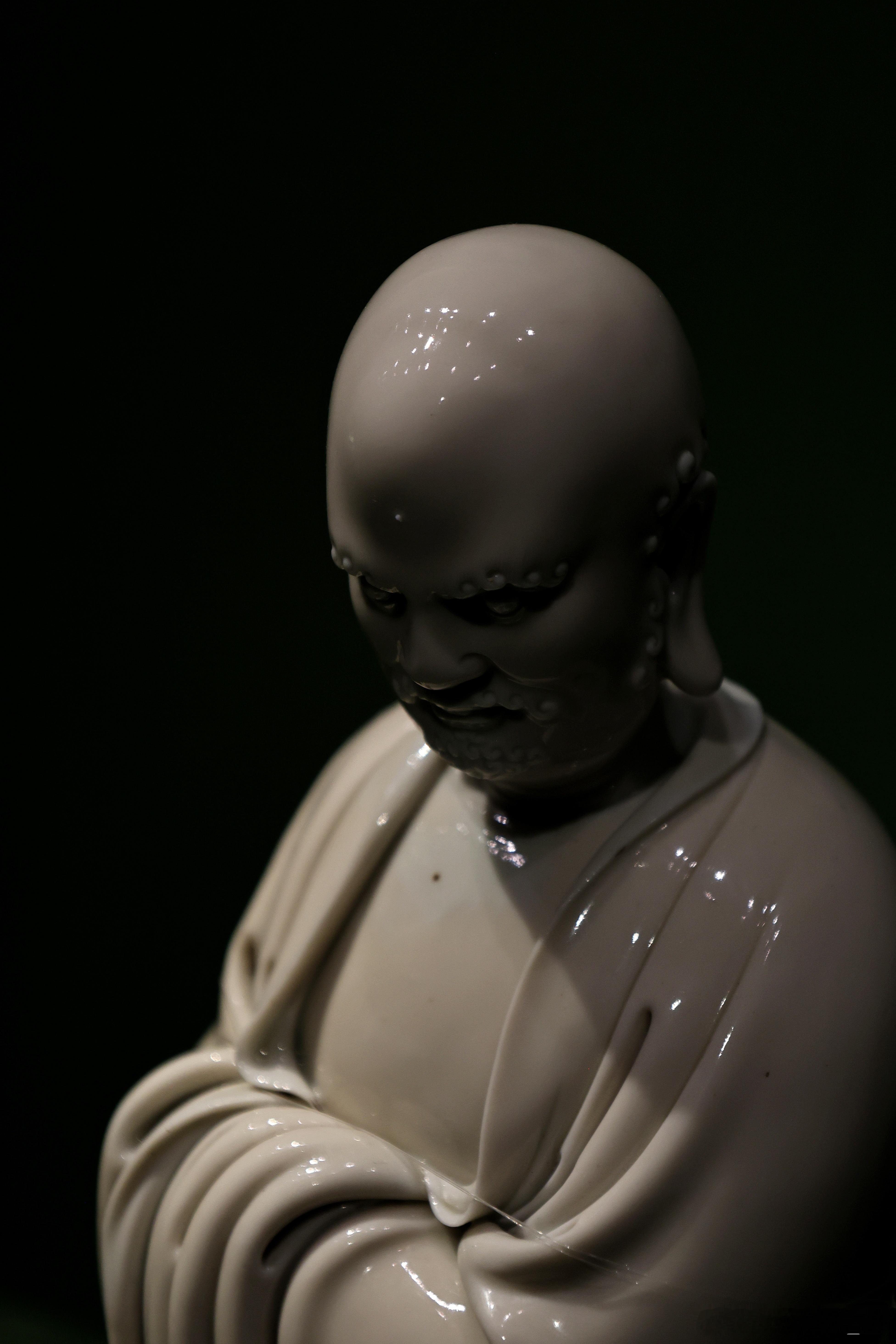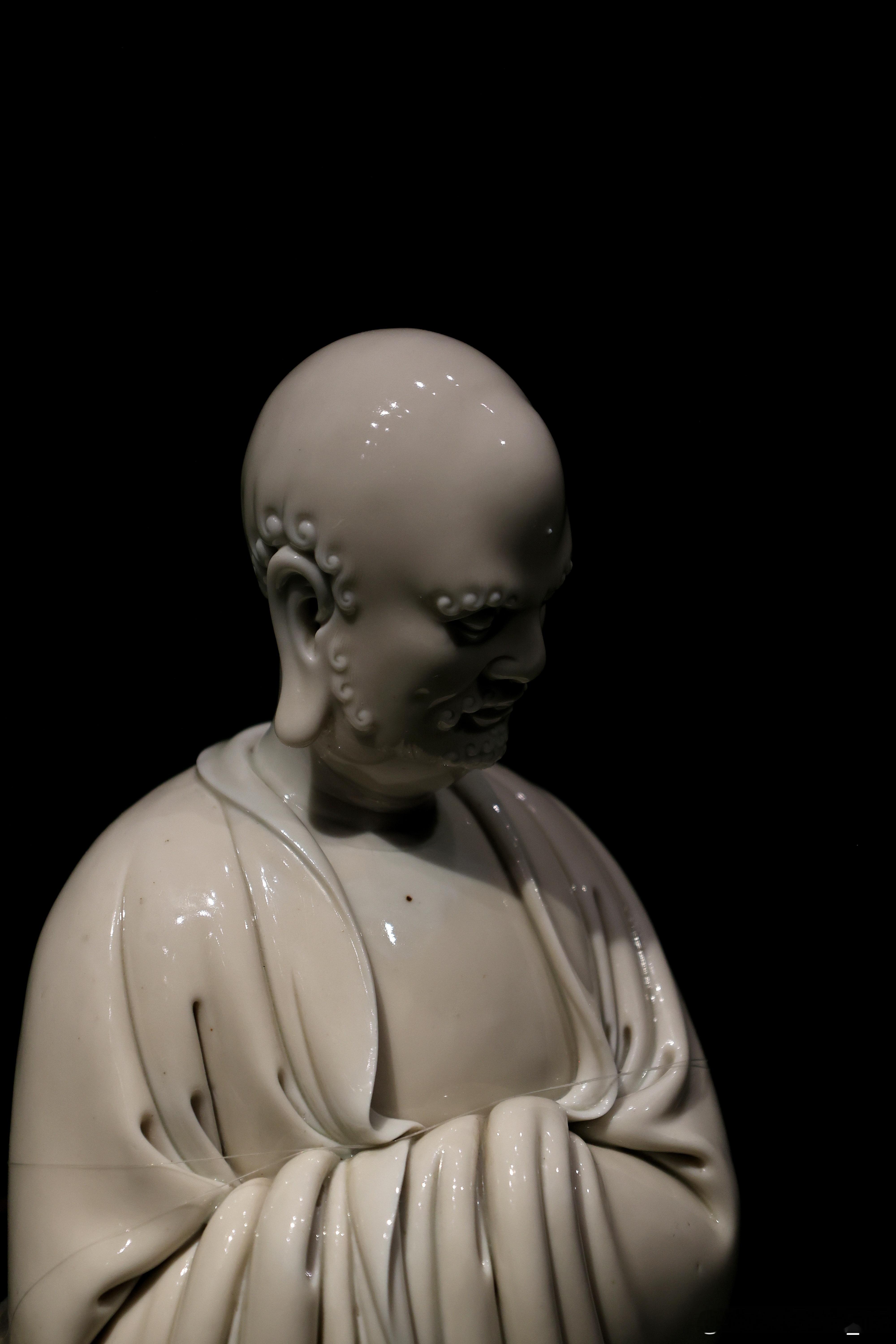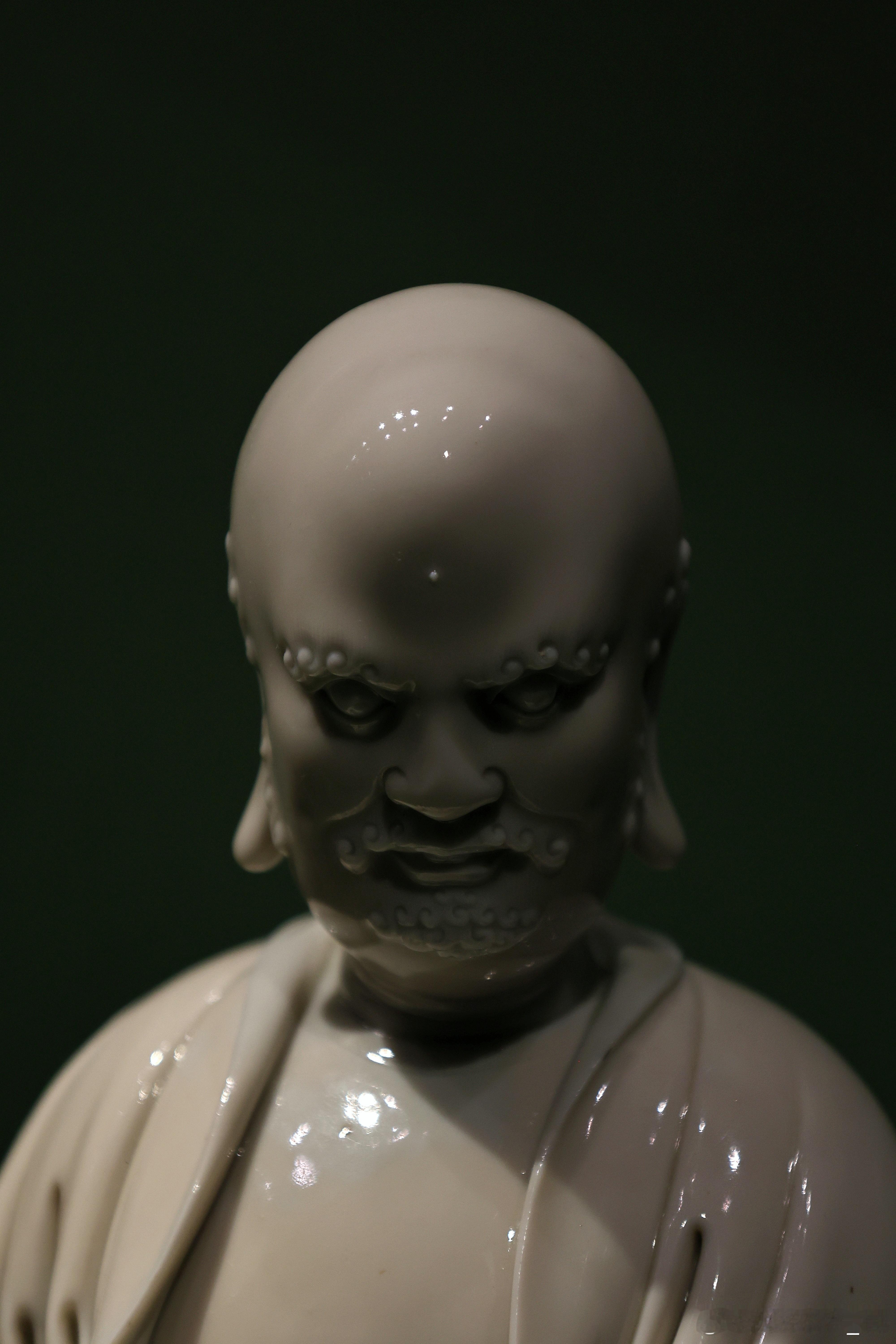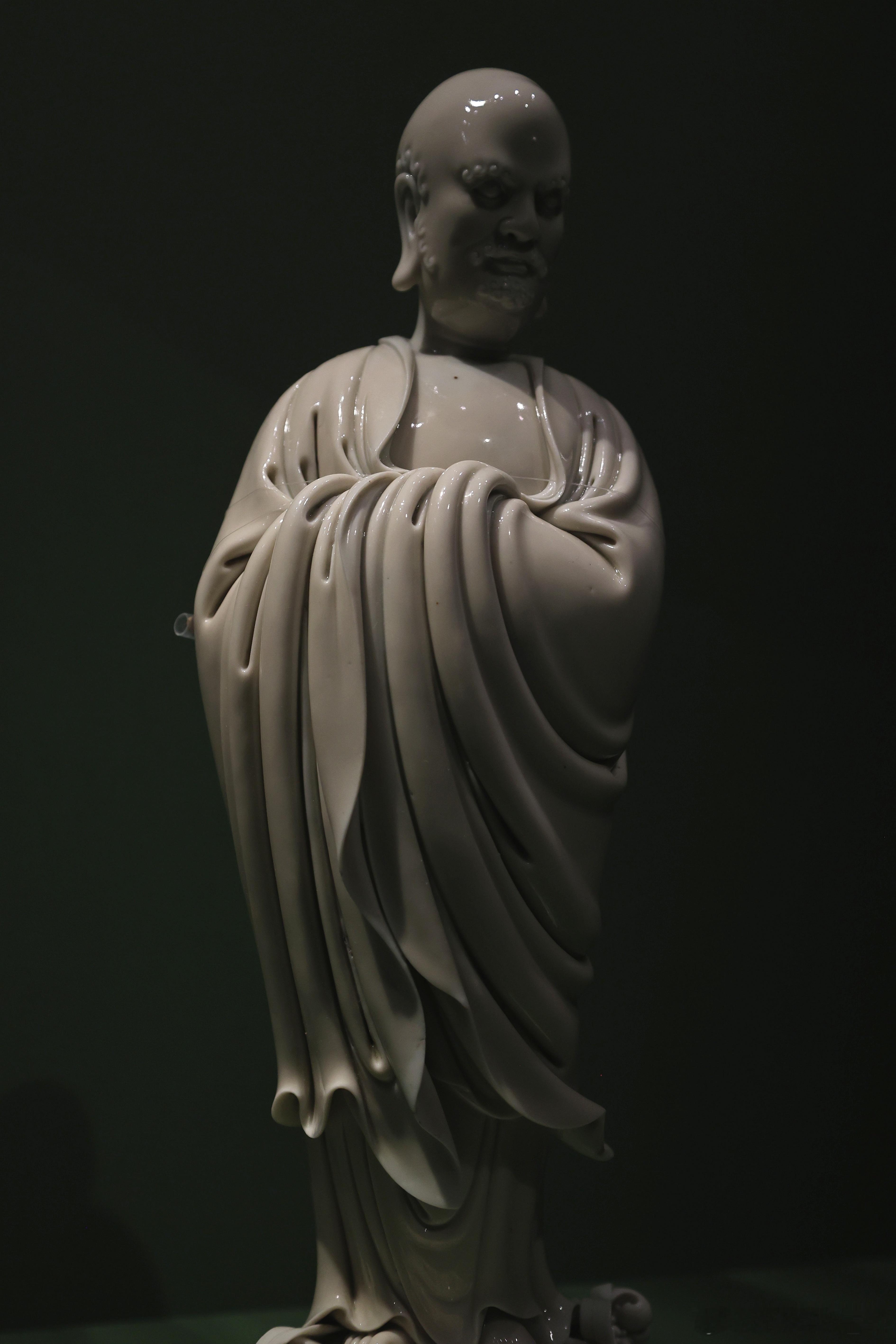 德化窑白釉达摩立像 明 (公元1368-1644年)故宫博物院藏清宫旧藏器,原存热河行宫。达摩身披袈裟,头部微低,鬓发卷曲,广额深目,双眼凝视前方,双手合抱于袖中,赤足立于苇叶之上,作疾驰渡海状。此塑像通体施白釉,釉色洁白,像背后钤方形阴文篆书"何朝宗印"。此塑像为明代德化窑作品,雕工精湛,惟妙惟肖,刻画出艰苦涉险、坚定无畏的高僧形象,是德化窑经典代表作品之一。 展出