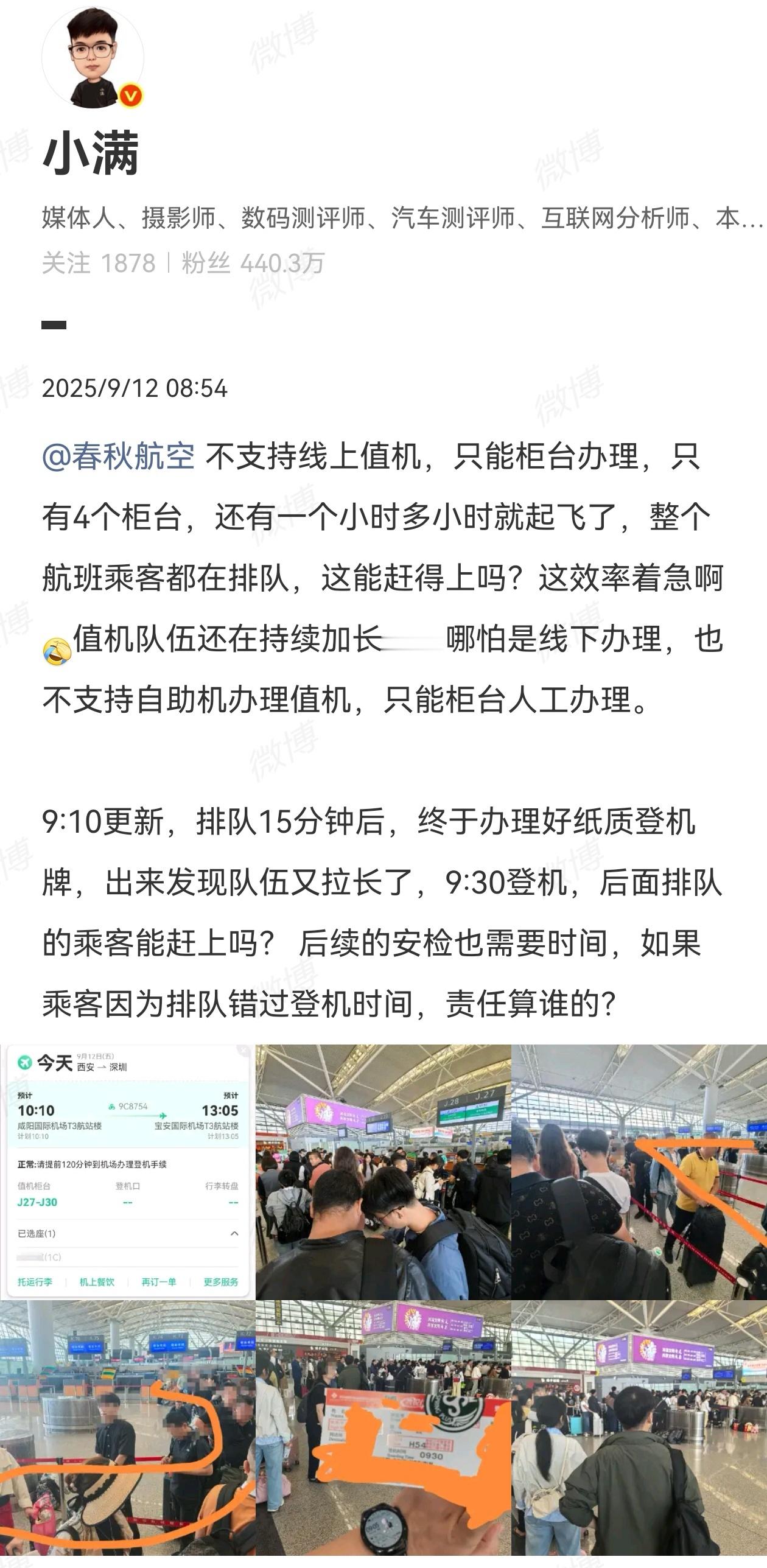 过两天出差,只有一趟 的航班,“春秋”作为所谓的廉价航司,其实一点也不廉价,感觉票价没有便宜多少,还有各种收费选项。由于春秋机型相对较小,托运行李会根据行李尺寸、重量收费,想要带行李进机舱还得付费,甚至提前几天选择靠前座位,还是要积分或费用。因个人携带20寸行李箱,又花钱购买了春秋航空的20KG托运行李额,机上餐食也需要额外付费预定,哪哪都需要花钱,算下来比其他航空公司更贵。另外,春秋航空为控制成本,长期使用自建的离港和销售系统,未接入中航信开发的 ,旅客想要查看春秋航空的航班信息,还得单独下载其APP。更让我不能理解的是,在春秋航空APP不能在线值机,没法用电子登机牌,只能当天去柜台办理值机,领取纸质登机牌,潜意识里,一直以为在线选座就是值机。在我看来,春秋航空如此操作,应该是出于替旅客着想,防止未购买行李托运、行李进机舱的旅客,直接拿着电子登机牌登机,被安检阻拦后,还得来回折腾,耽误安检、登机时间。不过,春秋航空在各地机场的柜台不多,旅客在相近时间办理纸质登机牌、托运行李等,难免造成排队拥堵情况,9月份乘坐春秋航空时,就遇到过类似问题,排队办理的旅客太多,导致航班起飞时间都延后了。