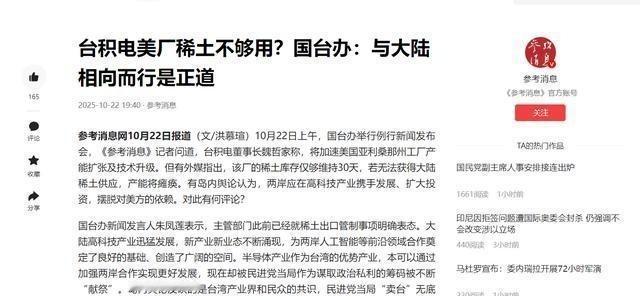 台积电董事长魏哲家称,台积电稀土告急,求大陆放手?台积电以创始人张忠谋为代表的人,曾经制裁中国大陆时有多嚣张、有多歹毒,我们不会忘记。中国大陆应该逐渐放弃台积电,以稀土为武器,把台积电搞残、搞垮,使得台积电的人才回流中芯国际等中国大陆芯片企业。 说起台积电这几年,简直就是活生生的两面派典型。表面上风光无限,全球芯片代工老大,市值动不动破万亿美金,可骨子里头对大陆的那些小动作,谁都看在眼里。尤其是最近,董事长魏哲家在美国亚利桑那州那边大张旗鼓地吹嘘要扩厂升级技术,承诺全力满足美国需求,结果没几天,外媒就爆出他们美国工厂的稀土库存只够撑30天,再不从大陆拿货,生产线就得直接趴窝。 这事儿搁谁身上都得慌啊,魏哲家急眼了,话里话外透着求大陆松口的意思。国台办回应得干脆,主管部门早有表态,稀土出口管制不是闹着玩的。 说白了,这不是单纯的供应链问题,而是中美博弈下,台湾地区企业夹在中间的尴尬。台积电这些年一边从大陆市场和资源里捞油水,一边帮着美国卡大陆脖子,现在轮到自己被卡了,才知道疼。 2025年10月大陆商务部和海关总署联合发文,稀土出口管制升级,从开采到冶炼分离再到磁材制造,全链条卡住,尤其是针对14纳米以下逻辑芯片和256层以上存储芯片的生产。 新规把出口阈值从10%降到0.1%,新增銪、鈥、鉺、銩、鐿等中重稀土元素审查。 台积电首当其冲,台湾地区每年进口稀土超6000吨,96%靠大陆,台积电一家就吞掉近3000吨,用在晶圆抛光、磁材和薄膜材料上。 美国工厂库存告急,30天倒计时一亮,全球半导体链条都抖三抖。费城半导体指数10月10日暴跌6.32%,台积电ADR跟着栽6.41%。 魏哲家上任后也没改弦更张,2024年还拒了大陆多家企业的7纳米订单,严格执行美方禁令。 现在他们想多元化采购,可短期内哪那么容易?澳大利亚、越南那些矿源产量低,加工技术跟不上,成本还翻倍。岛内经济部门嘴硬,说对台积电影响小,可私下评估报告显示,电动车和无人机高速马达已受波及。 这管制不是报复那么简单,而是大陆在中美贸易战中亮出的王牌。纽约时报直言,中国把美国的长臂管辖原封不动还回去。 稀土这东西,全球90%加工在中国手里,美国自己矿多加工少,特朗普时代就想脱钩,结果到现在还得求。 大陆这步棋走得稳,逻辑上也站得住脚。过去惠台政策给了台湾地区企业太多甜头,台积电赚得盆满钵满,却反手帮美国挖大陆墙角。制造业转移从2017年的48.2%降到2024年的33.1%,订单全跑去别处。 现在该调整了,用稀土精准打击,削弱台湾地区向美国献祭的筹码。台积电这“护国神山”一旦原料朝不保夕,在美国棋盘上的价值就打折了。国台办点明,民进党当局倚美卖台不得人心,两岸融合发展才是出路。 短期看,台积电股价晃荡,供应商囤货,全球芯片价微涨;长期呢,大陆自给自足加速,中芯国际、三星抢市场份额。Gartner报告显示,台积电全球代工占比从2023年的56%滑到2025年的50%,中芯国际升到6%。 这不是空谈,华为海思和中芯联手,7纳米线迭代,消费补贴政策一推,订单暴增62%。 人才这块,更是大陆的机会。台积电这些年赴美投资,抽调上千工程师去亚利桑那,岛内高端人才外流严重。 2025年上半年,台积电流失率虽低到5%,但中芯国际招聘火爆,薪资上浮20%,LinkedIn广告满天飞。 那些工程师一看台积电陷资源泥潭,研发项目黄摊子,工资福利缩水,自然打包走人。上海张江园区扩建,实验室夜以继日,产量月环比升15%。 中芯国际虽流失率高到17%,但大陆政策扶持,海外人才引进松绑,差距在拉近。 台积电靠大陆资源起家,却帮美国封锁大陆,现在稀土一卡,立马现原形。大陆不急,慢慢收紧,放弃依赖,扶持本土企业如中芯国际,人才回流水到渠成。国际上,贸易战升级,美国加征100%关税,中国锂电池和关键材料也管制起来。 供应链重塑不是一天的事,但大陆有底气,稀土牌在手,半导体自主化势在必行。台湾地区企业醒醒吧,继续卖台,早晚把自己玩残。