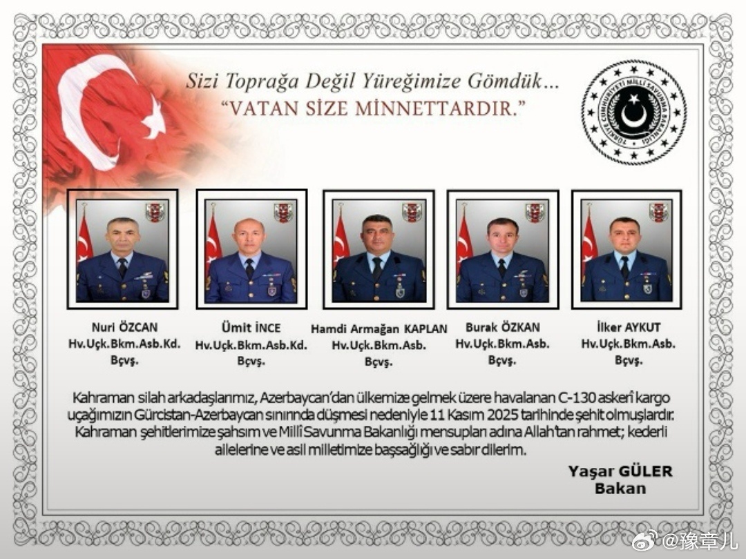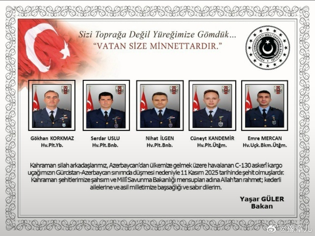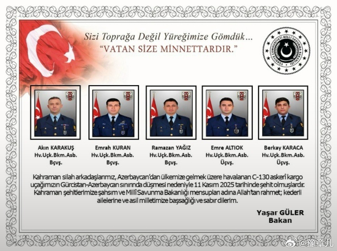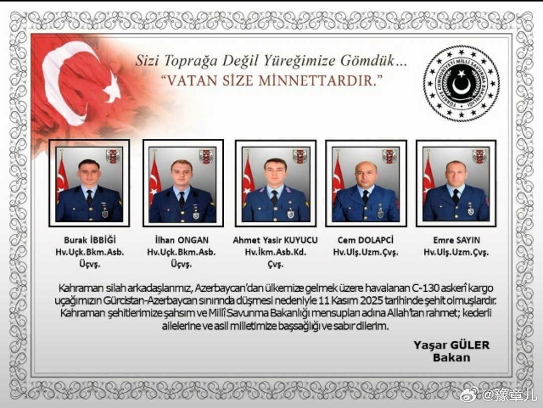 土耳其国防部公布了在从阿塞拜疆飞往土耳其并在格鲁吉亚和阿塞拜疆边境附近坠毁的C-130军用货机坠毁时遇难的20名士兵的姓名。